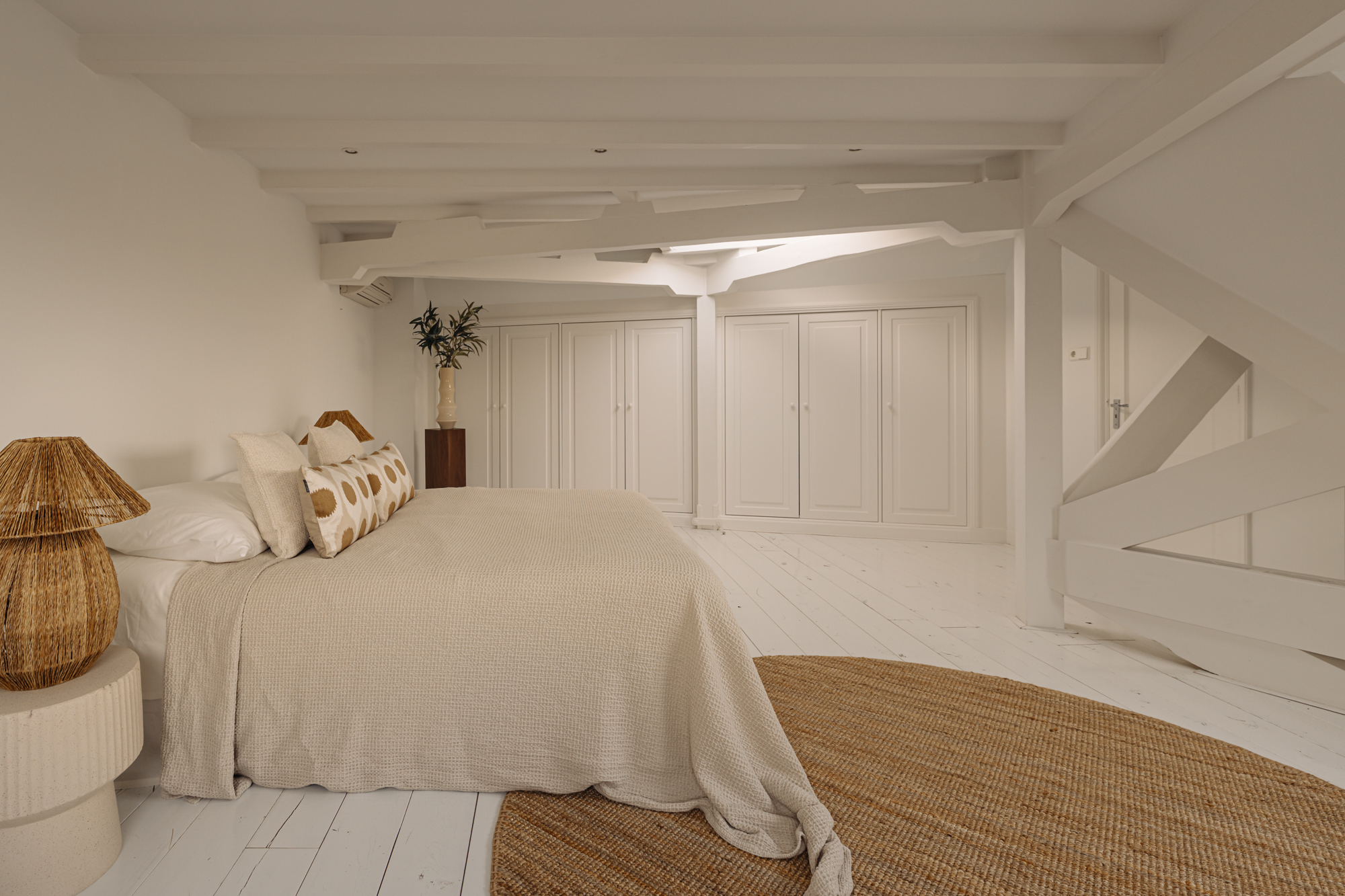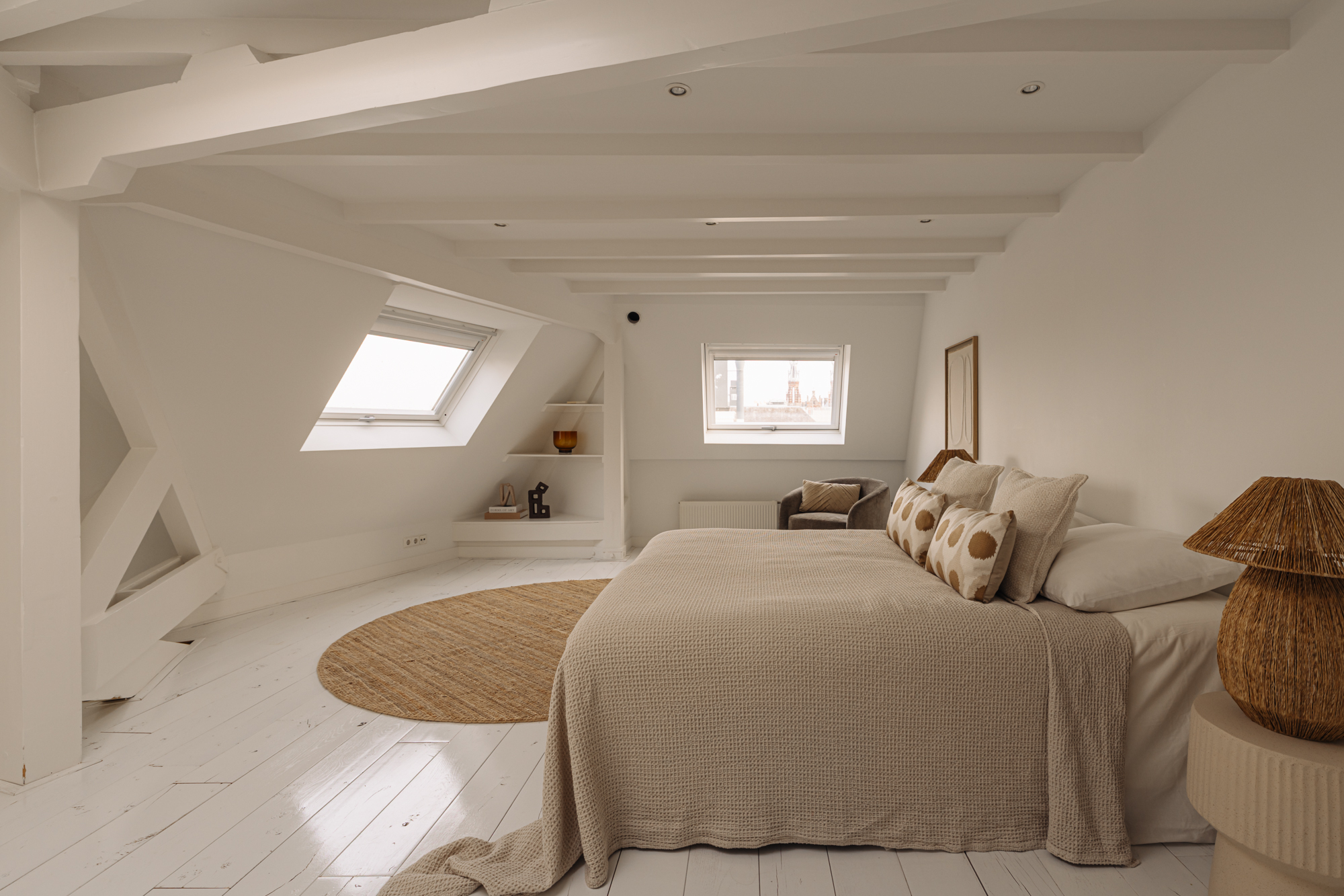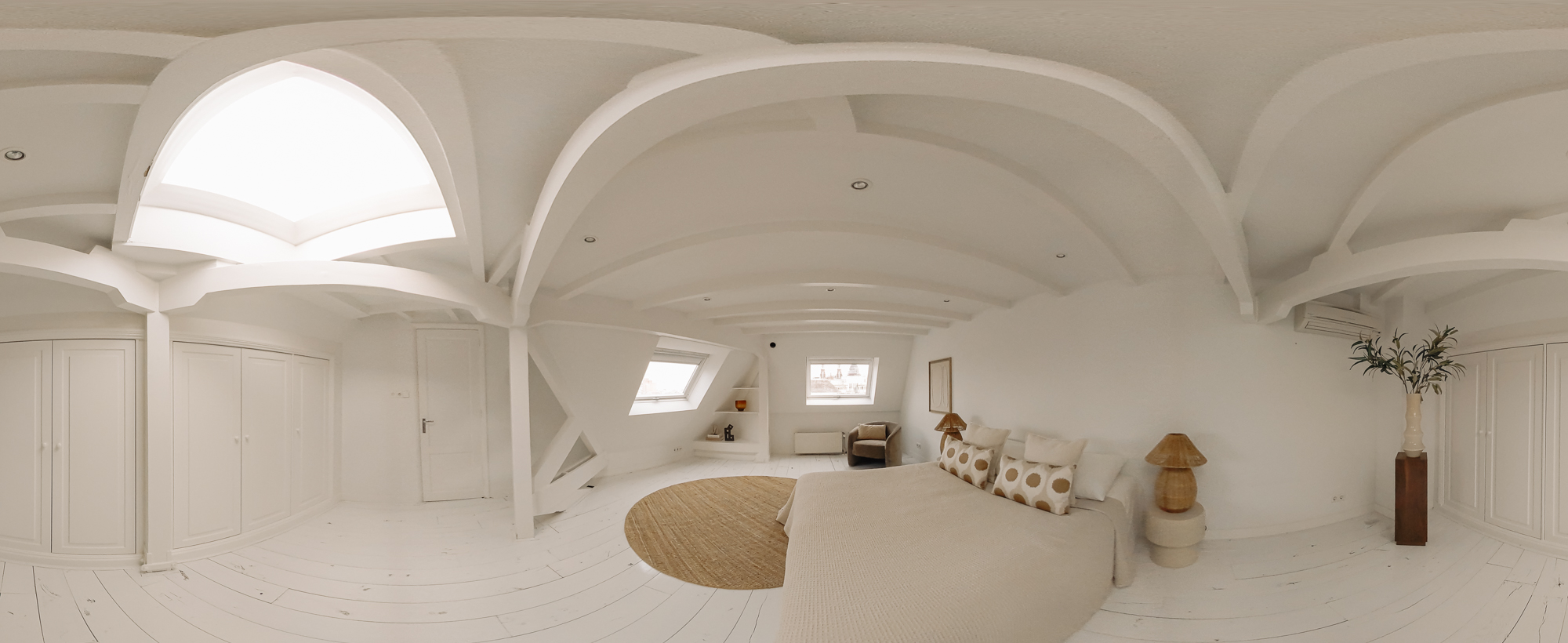 Al subir al siguiente nivel, se accede al dormitorio principal, que dispone de escritorio integrado, armarios empotrados y acceso directo mediante puertas francesas a una soleada terraza en la azotea de 23 m², un refugio tranquilo elevado por encima del icónico canal Herengracht. El baño en suite invita al relax con una gran bañera, ducha a ras de suelo, doble lavabo y sauna privada. En la planta superior, el segundo dormitorio recibe luz cenital a través de ventanas de techo, cuenta con armarios a medida y control climático independiente.