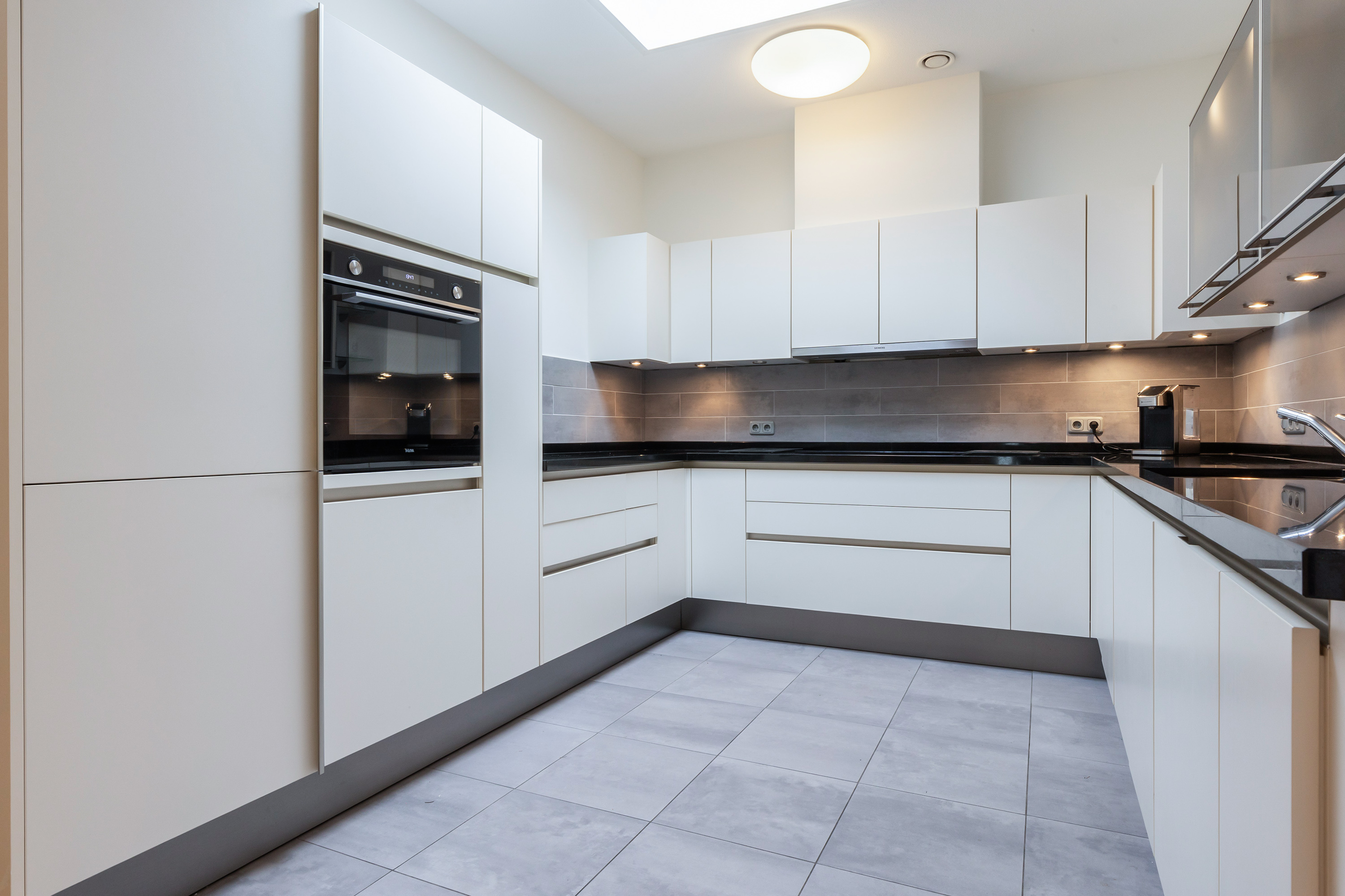 El acceso seguro mediante videoportero y llavero conduce al ascensor privado que llega a la tercera planta, compartida solo con un apartamento más. El interior destaca con techos altos y un luminoso salón de 86 m², grandes ventanales, suelos de parquet blanqueado y pintura interior nueva de 2024. Las puertas francesas dan paso a la terraza orientada al sur de 28 m², perfecta para cenas al aire libre o momentos de calma bajo un toldo automático. La elegante cocina en U cuenta con muebles lacados, superficies de granito negro y electrodomésticos integrados, iluminada por una claraboya. Un lavadero añade espacio de almacenaje práctico.
