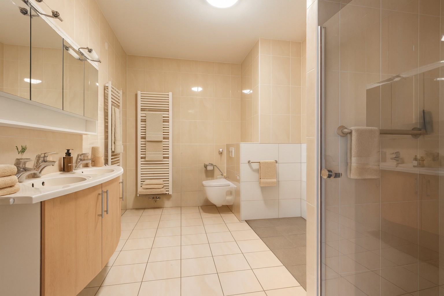 Los tres dormitorios cuentan con suelos de PVC de nueva instalación, que aportan calidez y resistencia. La suite principal incluye armarios a medida, acceso al balcón y baño privado con duchas a ras de suelo adecuadas para todas las edades. El segundo dormitorio dispone de su propio balcón y vestidor, y el tercero se utiliza actualmente como despacho. Un segundo baño y varias comodidades ofrecen flexibilidad tanto para residentes como para invitados.