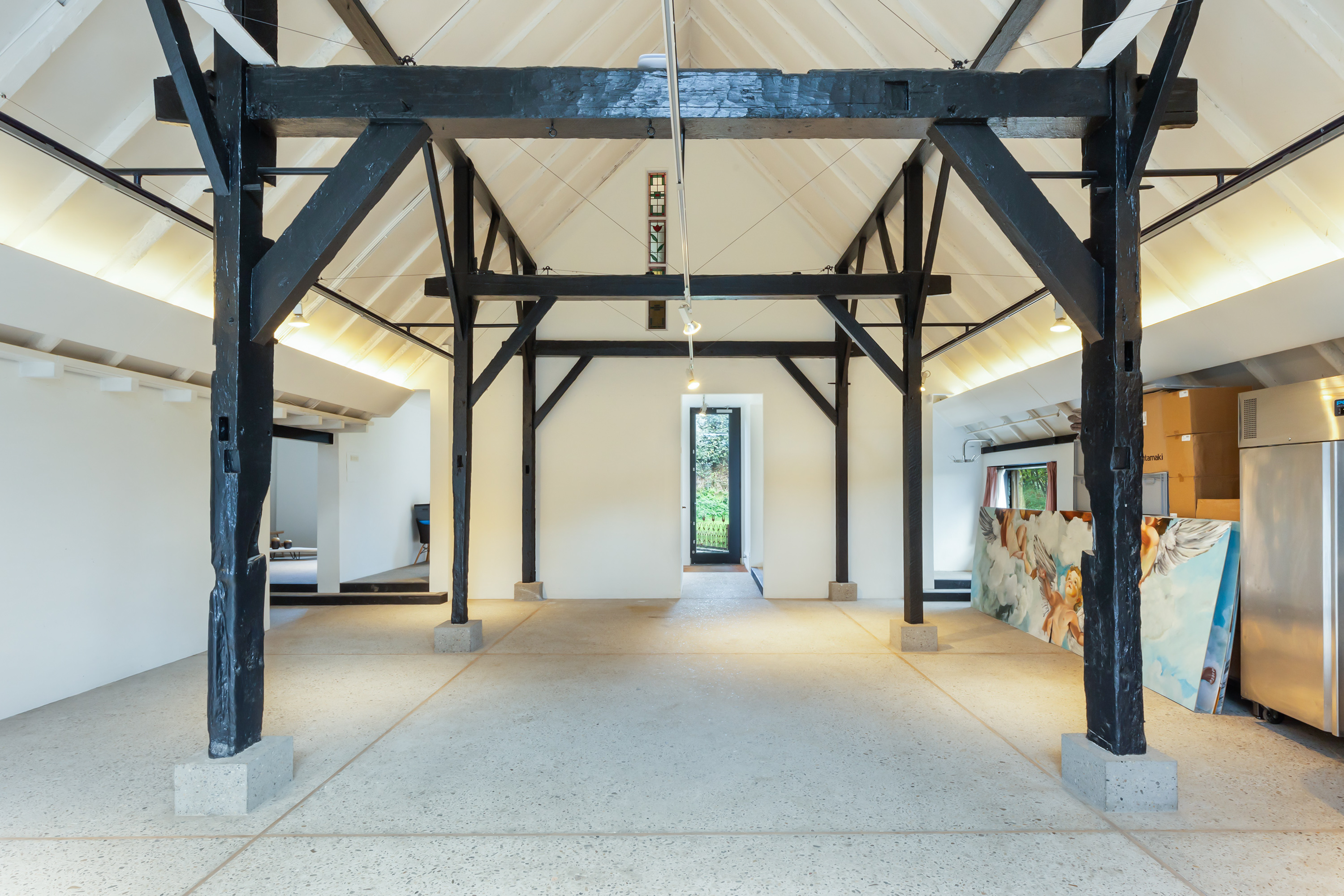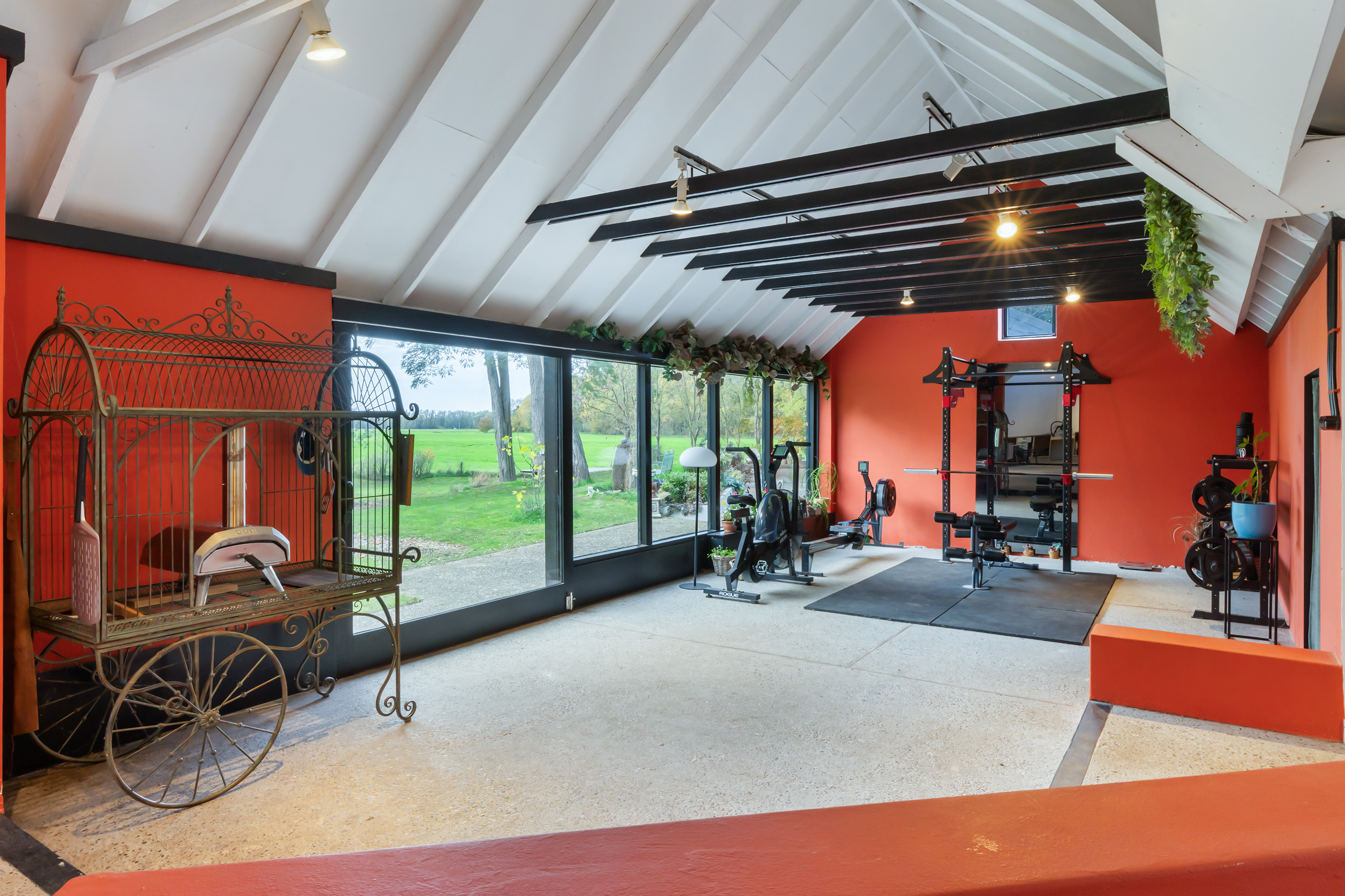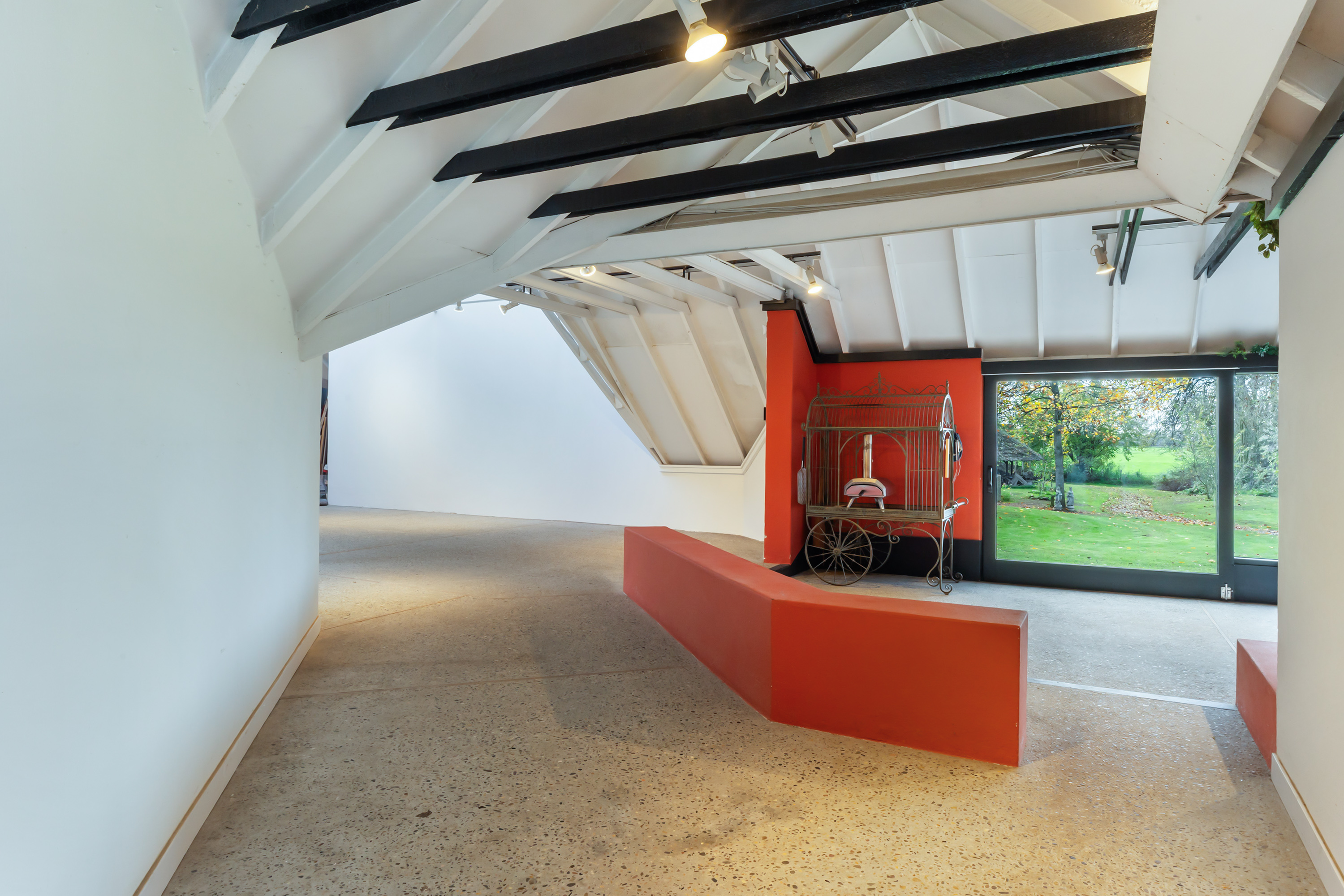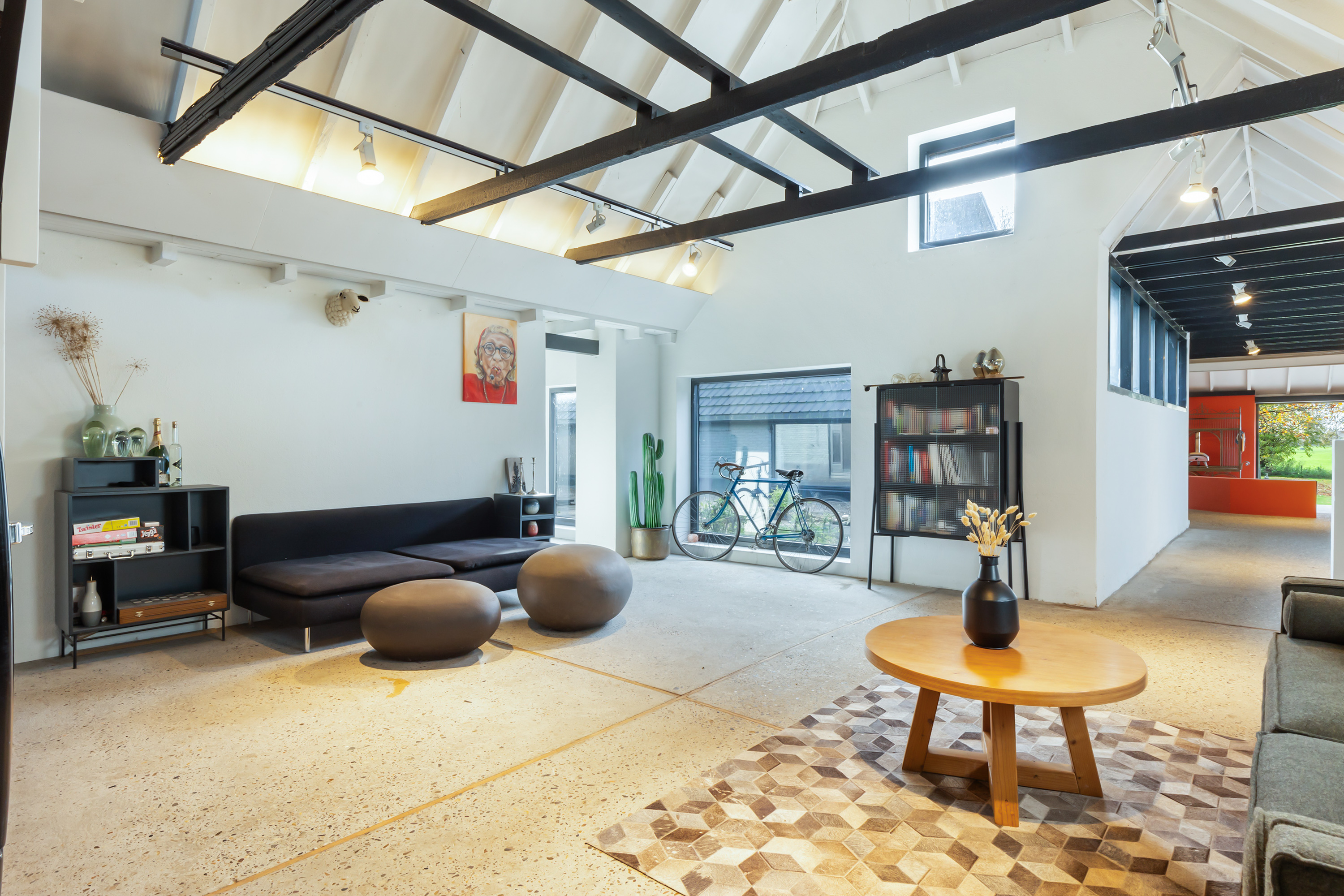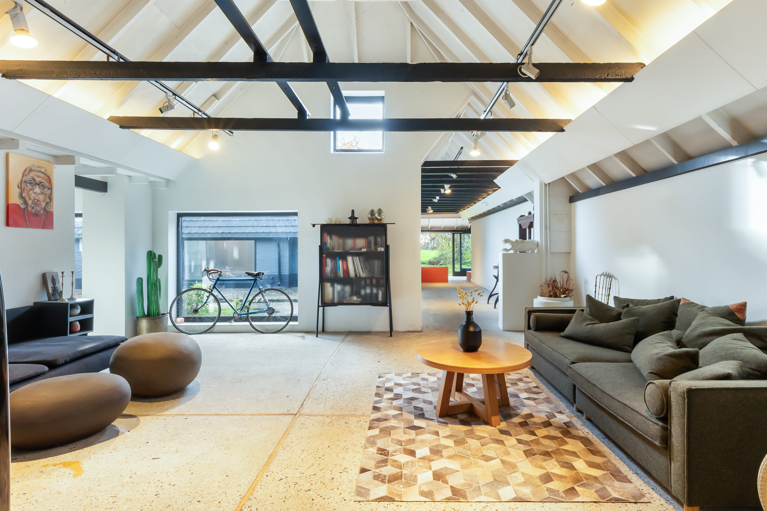 El espacio comercial adyacente ofrece aún más posibilidades para atelier, showroom o alojamiento para invitados, con vigas de madera negra y amplios ventanales que exhiben su artesanía y presencia. En el exterior, el jardín se funde con la naturaleza agrícola e incluye un pabellón, una terraza flotante y una plataforma privada, generando un refugio de intimidad. Árboles maduros y un diseño paisajístico pensado completan la sensación de serenidad.
