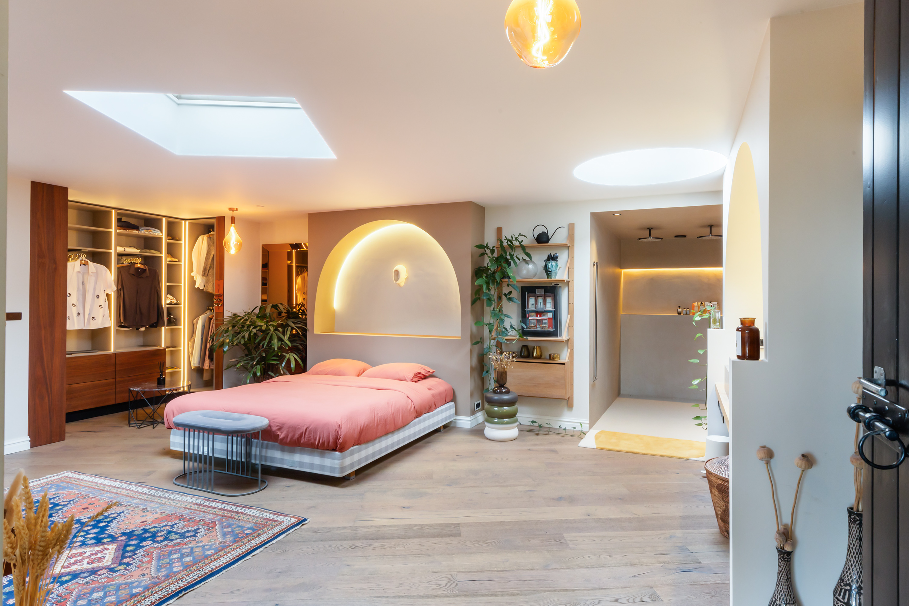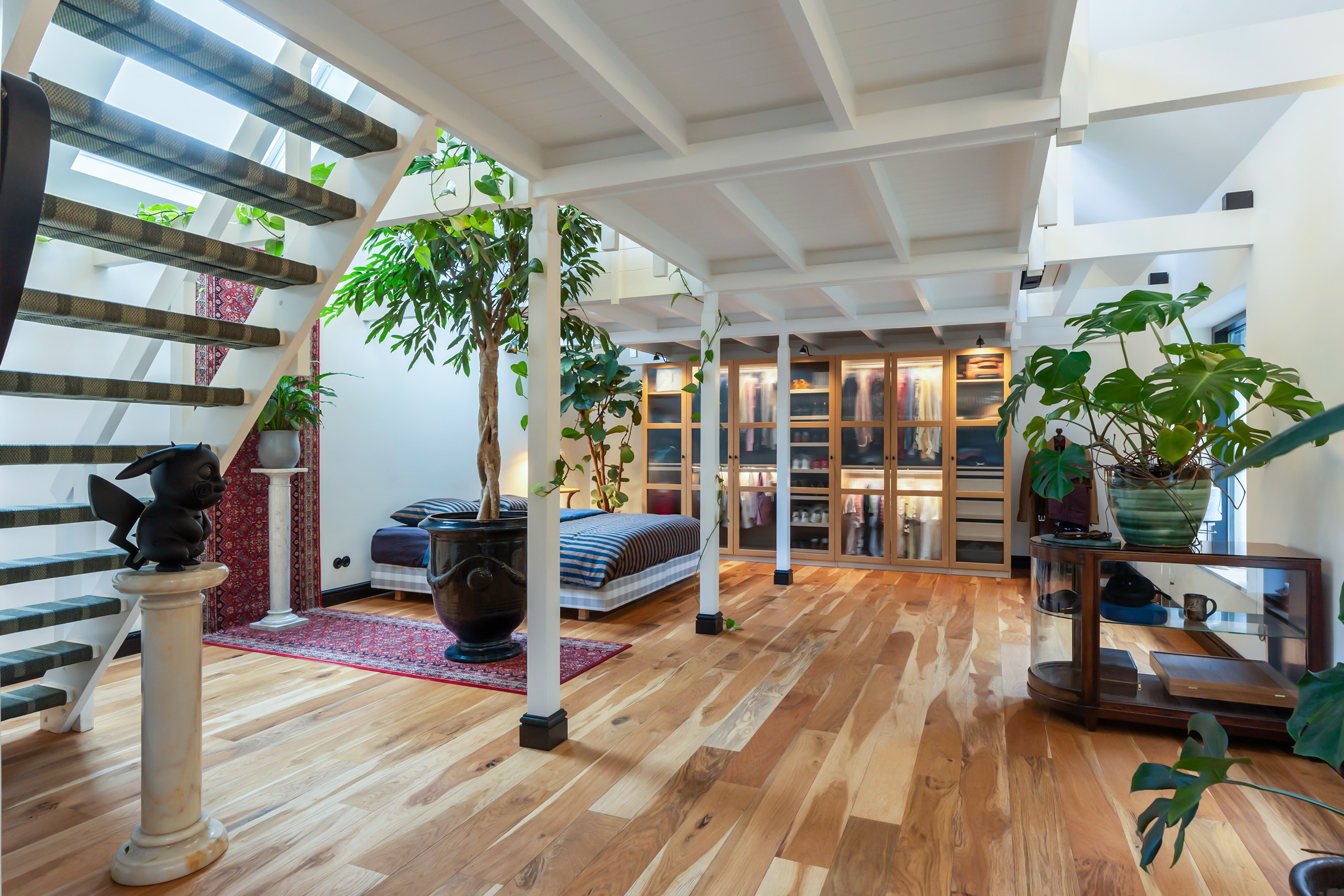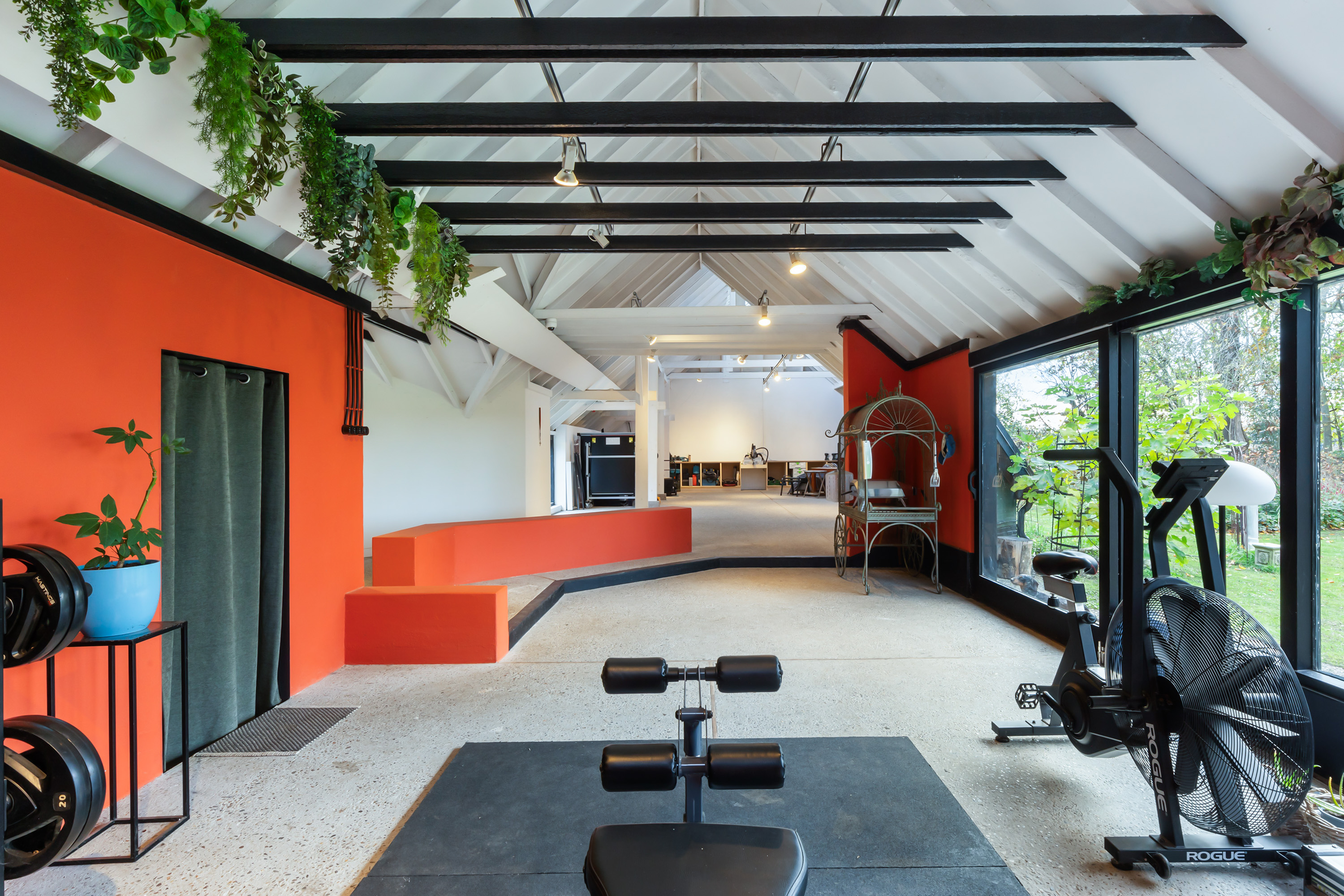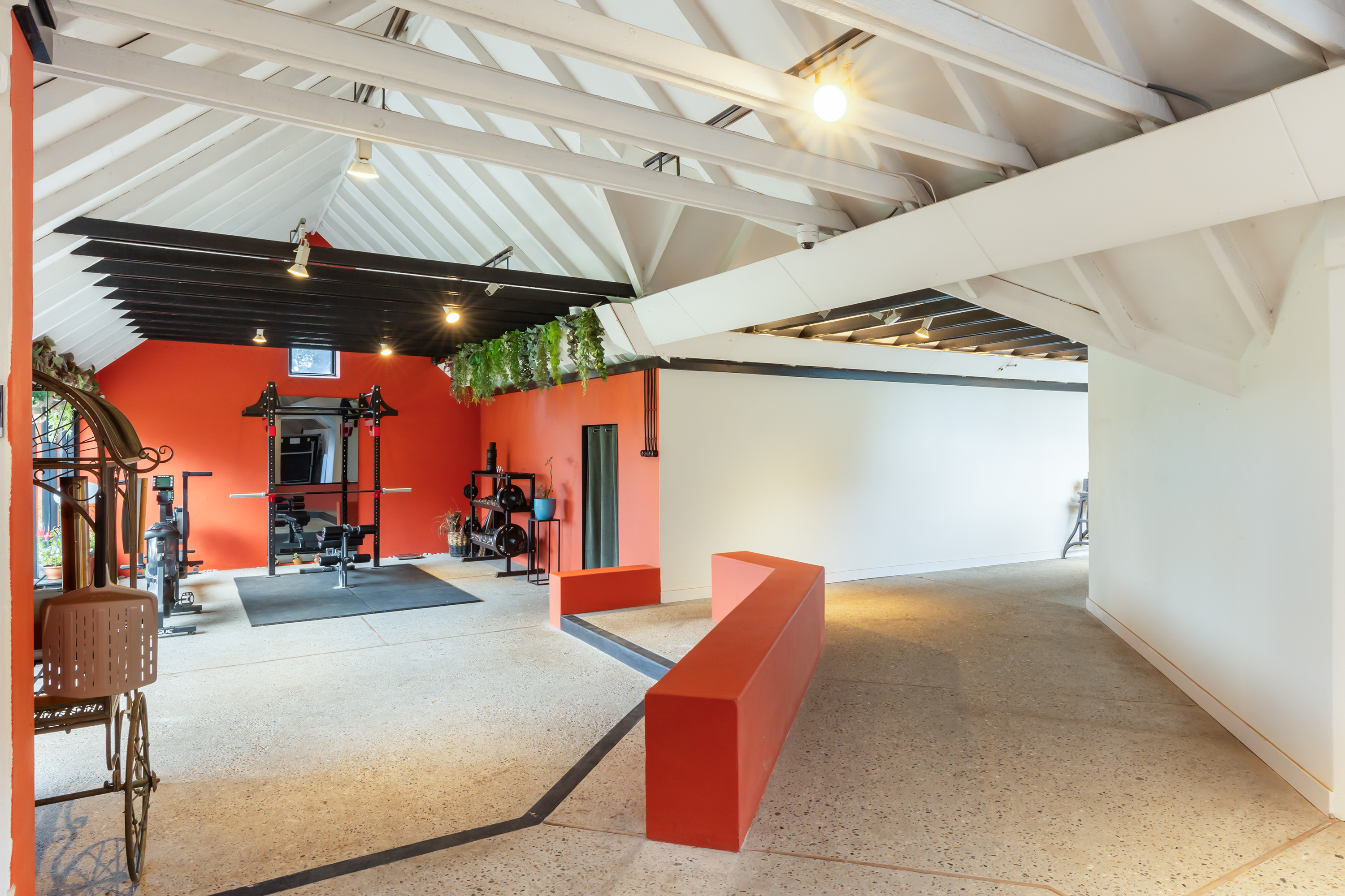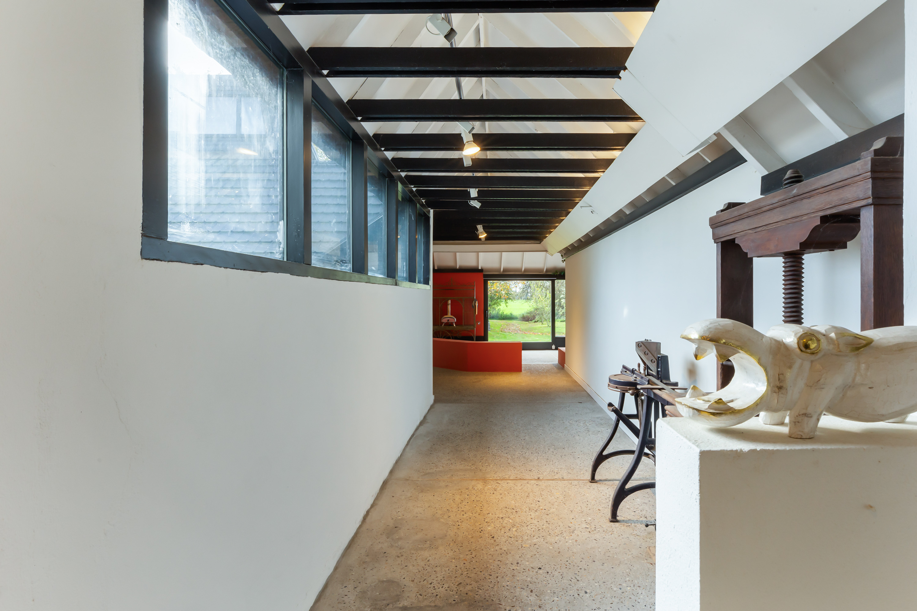 El espacio comercial adyacente ofrece aún más posibilidades para atelier, showroom o alojamiento para invitados, con vigas de madera negra y amplios ventanales que exhiben su artesanía y presencia. En el exterior, el jardín se funde con la naturaleza agrícola e incluye un pabellón, una terraza flotante y una plataforma privada, generando un refugio de intimidad. Árboles maduros y un diseño paisajístico pensado completan la sensación de serenidad.
