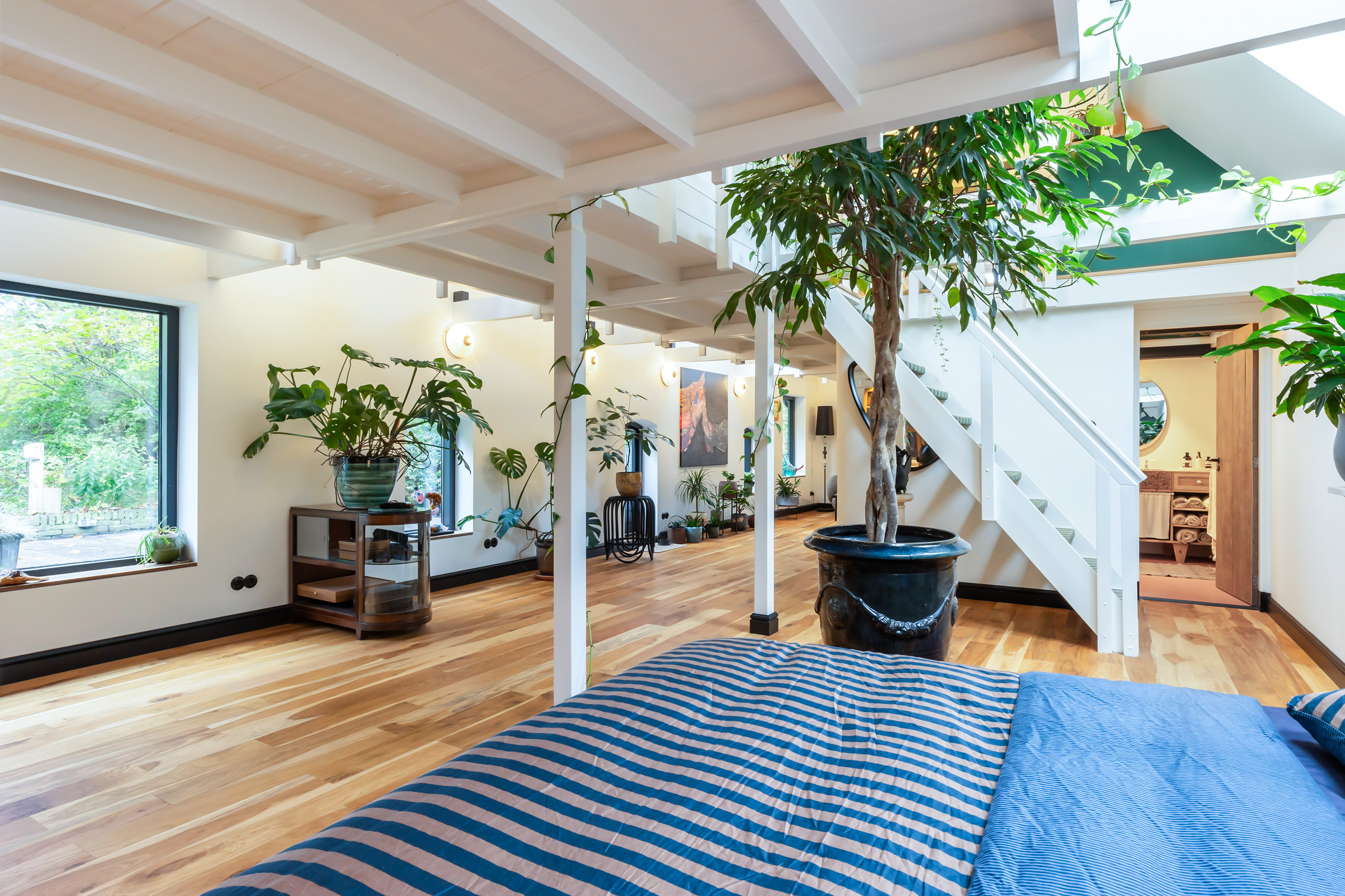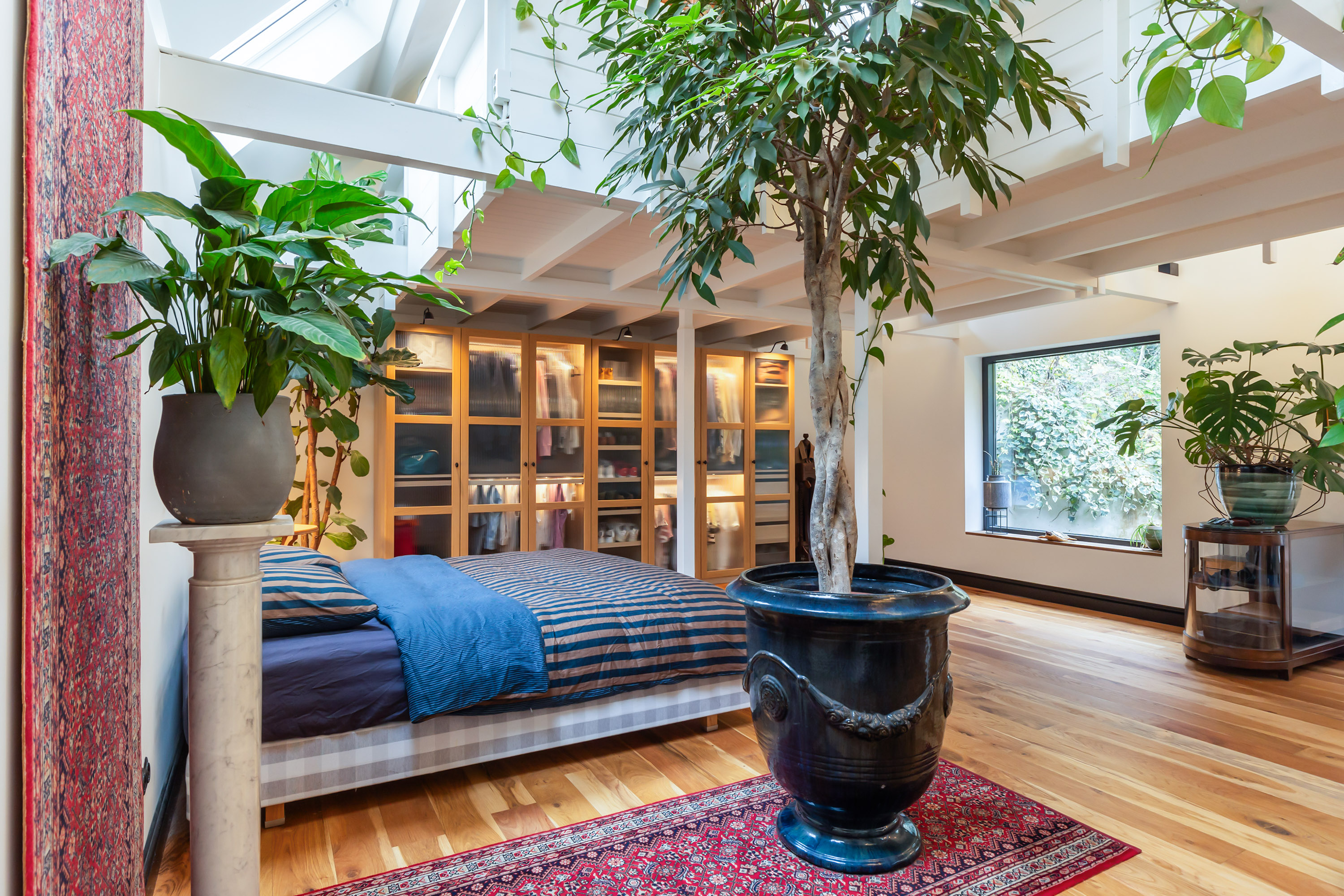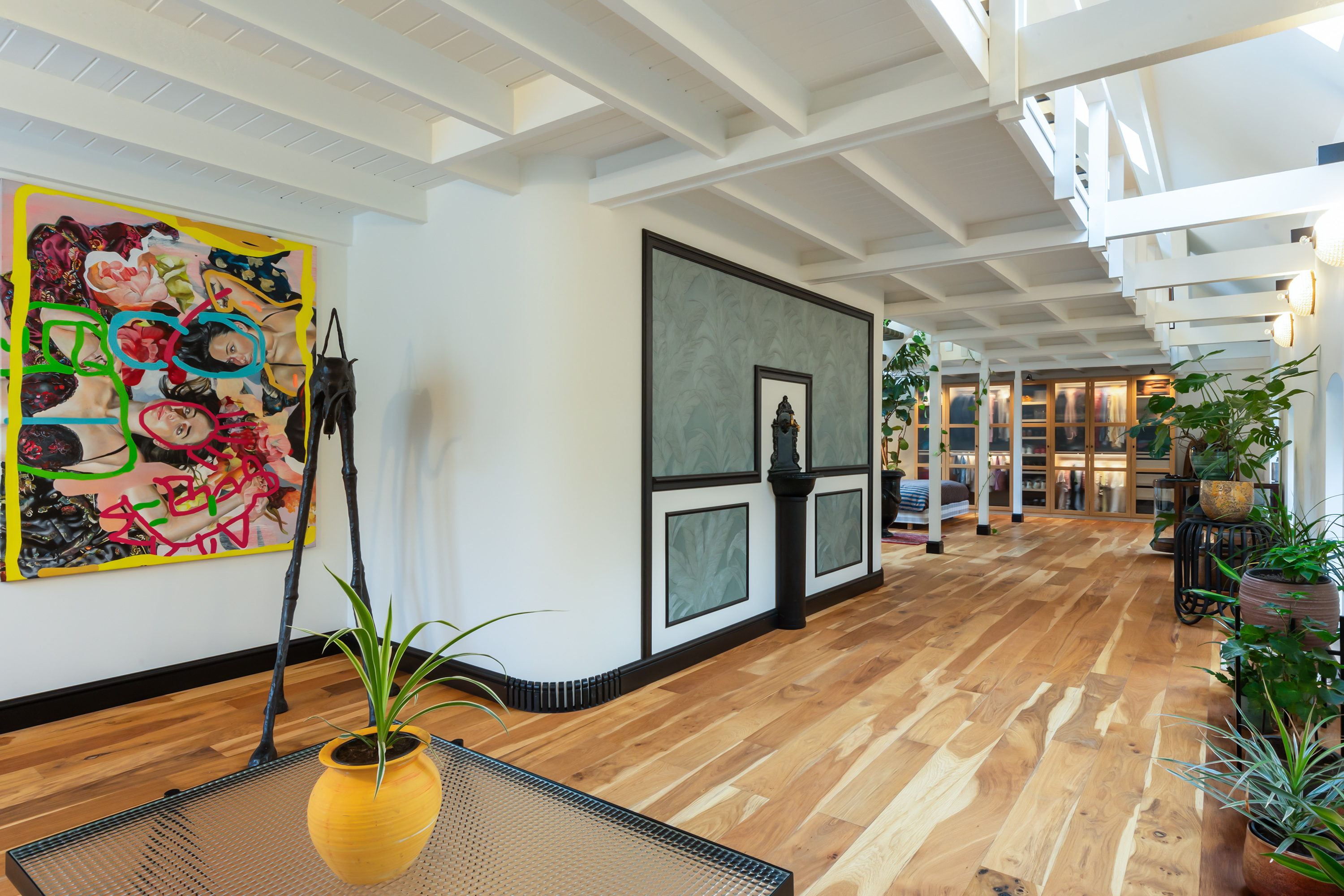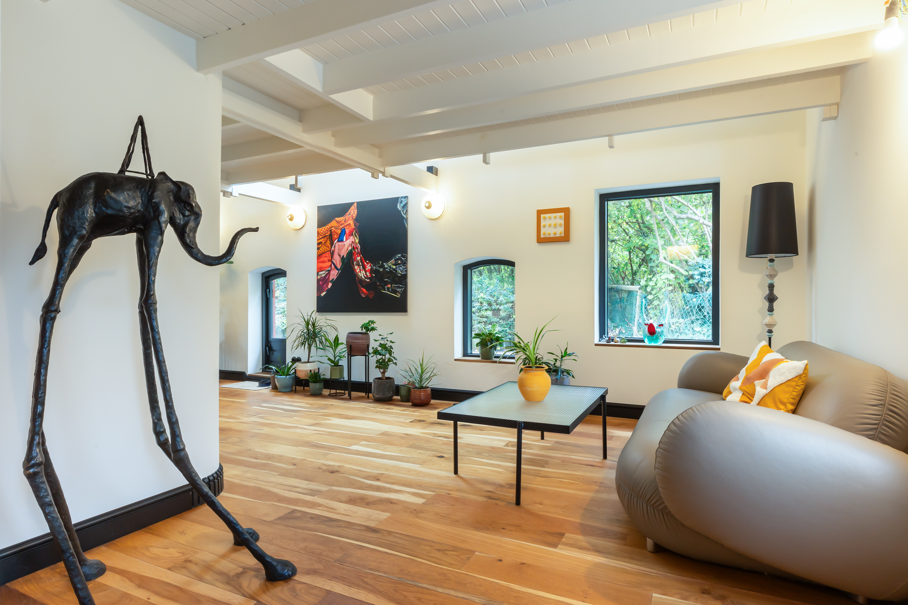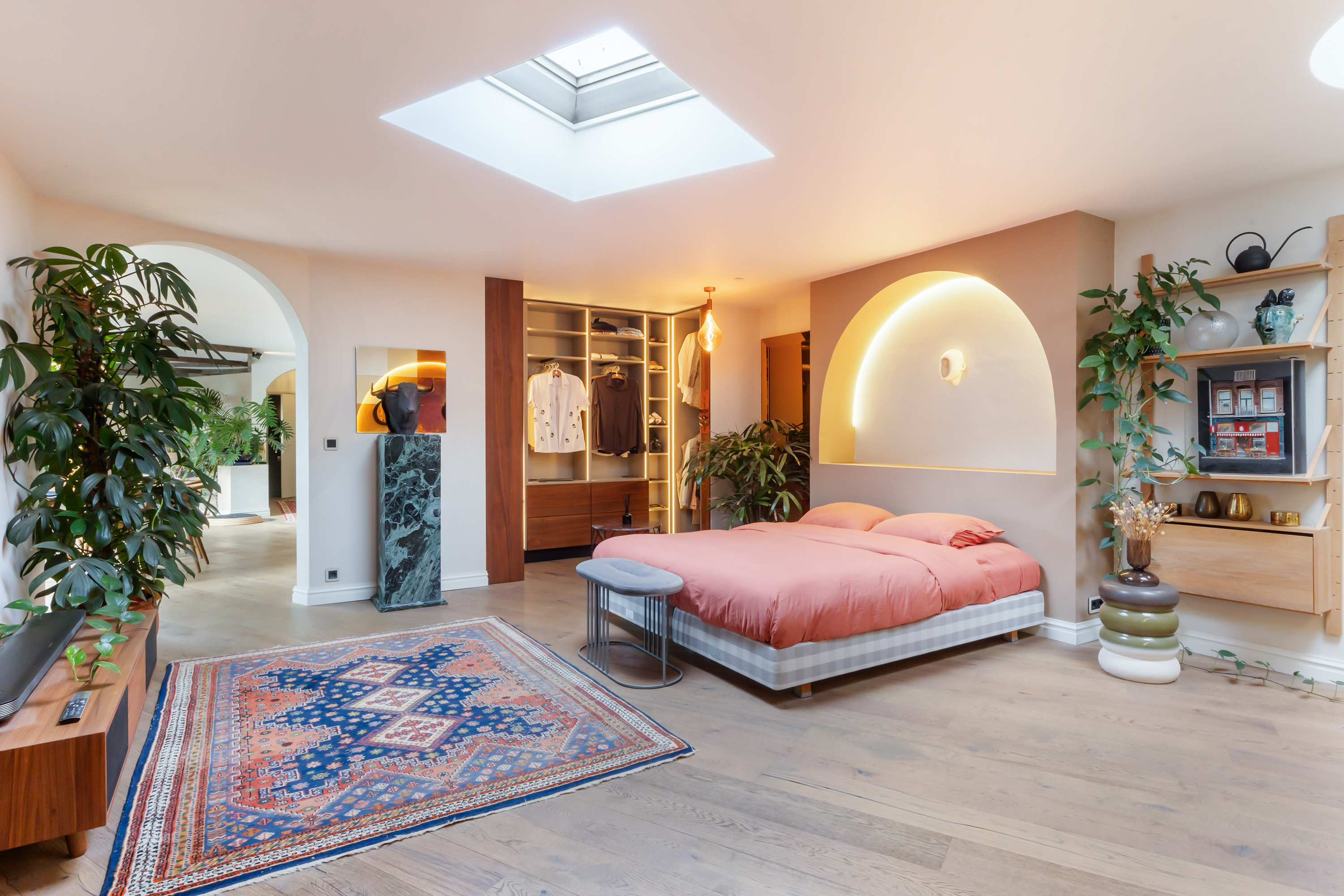 El espacio comercial adyacente ofrece aún más posibilidades para atelier, showroom o alojamiento para invitados, con vigas de madera negra y amplios ventanales que exhiben su artesanía y presencia. En el exterior, el jardín se funde con la naturaleza agrícola e incluye un pabellón, una terraza flotante y una plataforma privada, generando un refugio de intimidad. Árboles maduros y un diseño paisajístico pensado completan la sensación de serenidad.