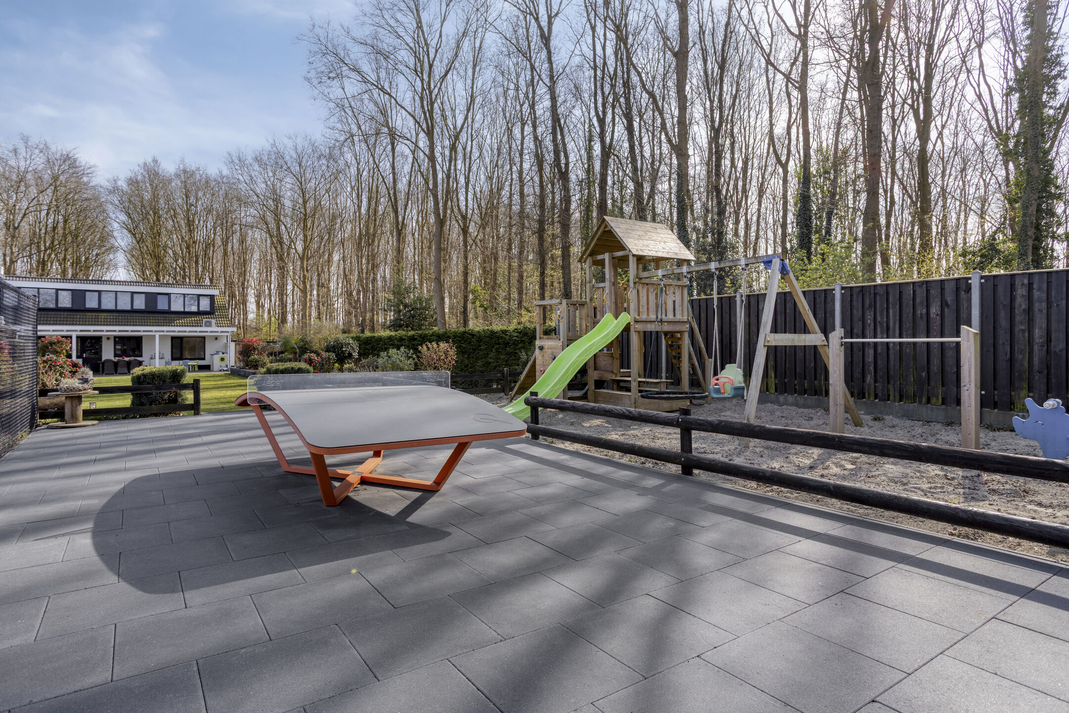 Un auténtico punto destacado es la edificación auxiliar polivalente de aproximadamente 124 m², construida con altos estándares y actualmente equipada con una oficina independiente, spa de natación de lujo, zona de bar, sala de fitness y espacio de almacenamiento. Un segundo edificio anexo sirve de lavadero y almacén de bicicletas. Las zonas exteriores incluyen varias terrazas, un amplio césped, huerto, área de juegos y jardines cuidadosamente diseñados, garantizando privacidad y versatilidad en todas las etapas de la vida familiar.