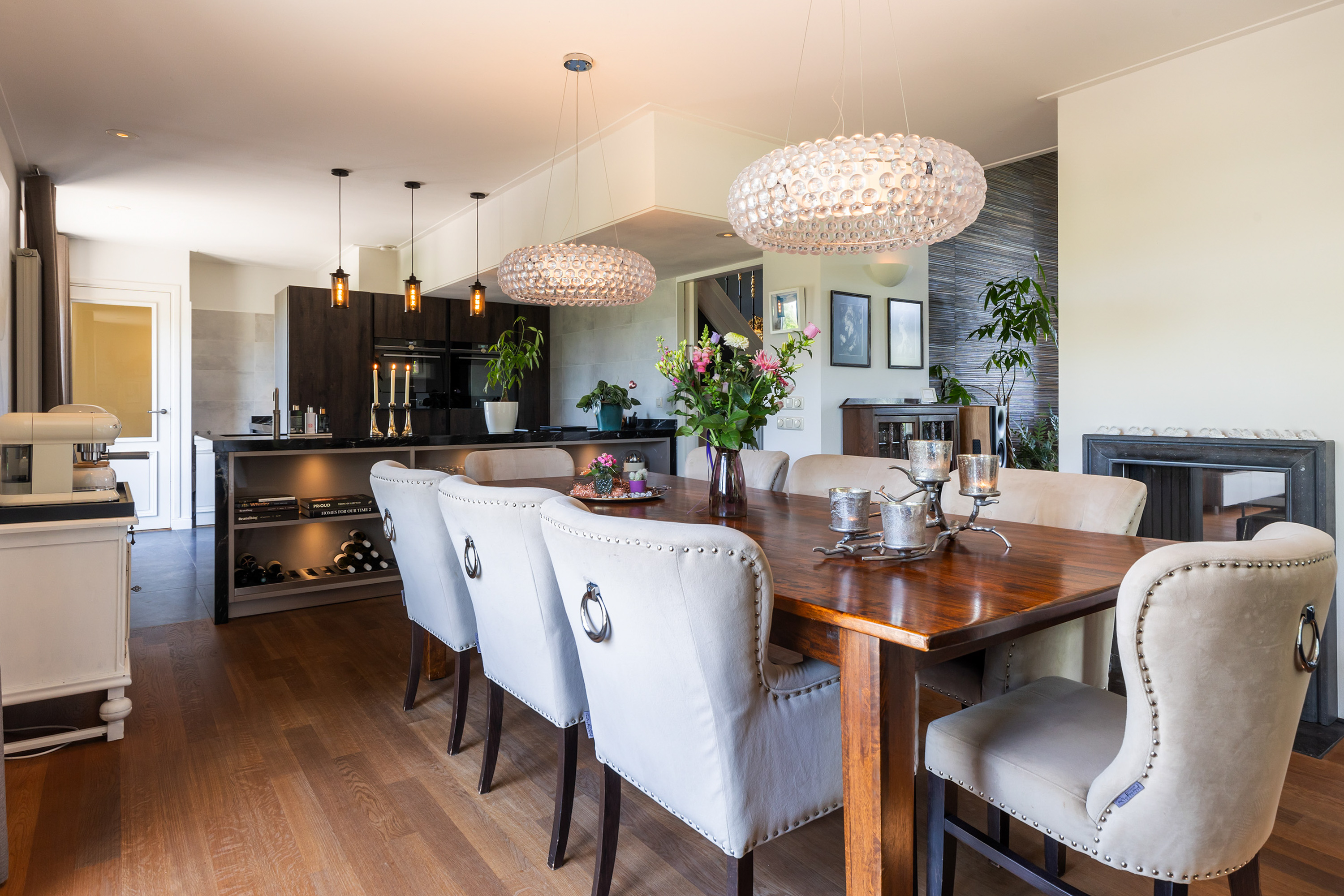La villa se distribuye en cuatro niveles, proporcionando 421 m² de espacio versátil. A la altura del dique, la sala principal fusiona ambiente y confort, con vistas panorámicas enmarcadas por puertas francesas que conducen a un amplio balcón. El despacho cuenta con una chimenea con carácter y las zonas de estar, comedor y cocina se conectan mediante una chimenea de cristal, lo que permite tanto la división como la fluidez.