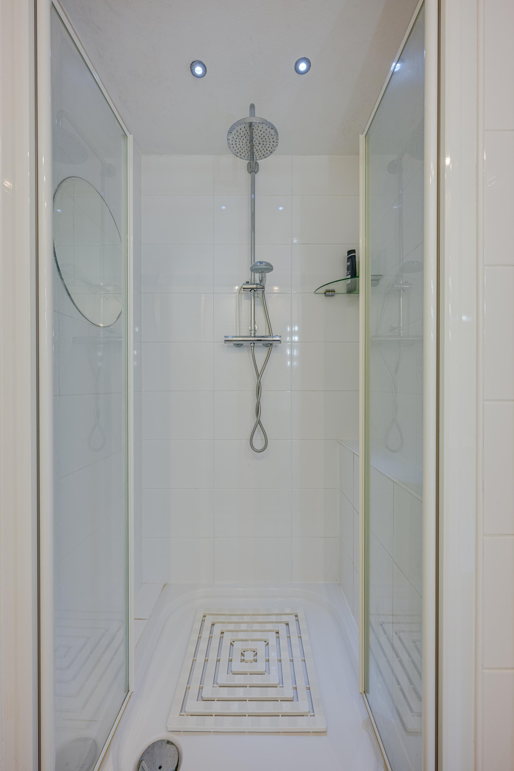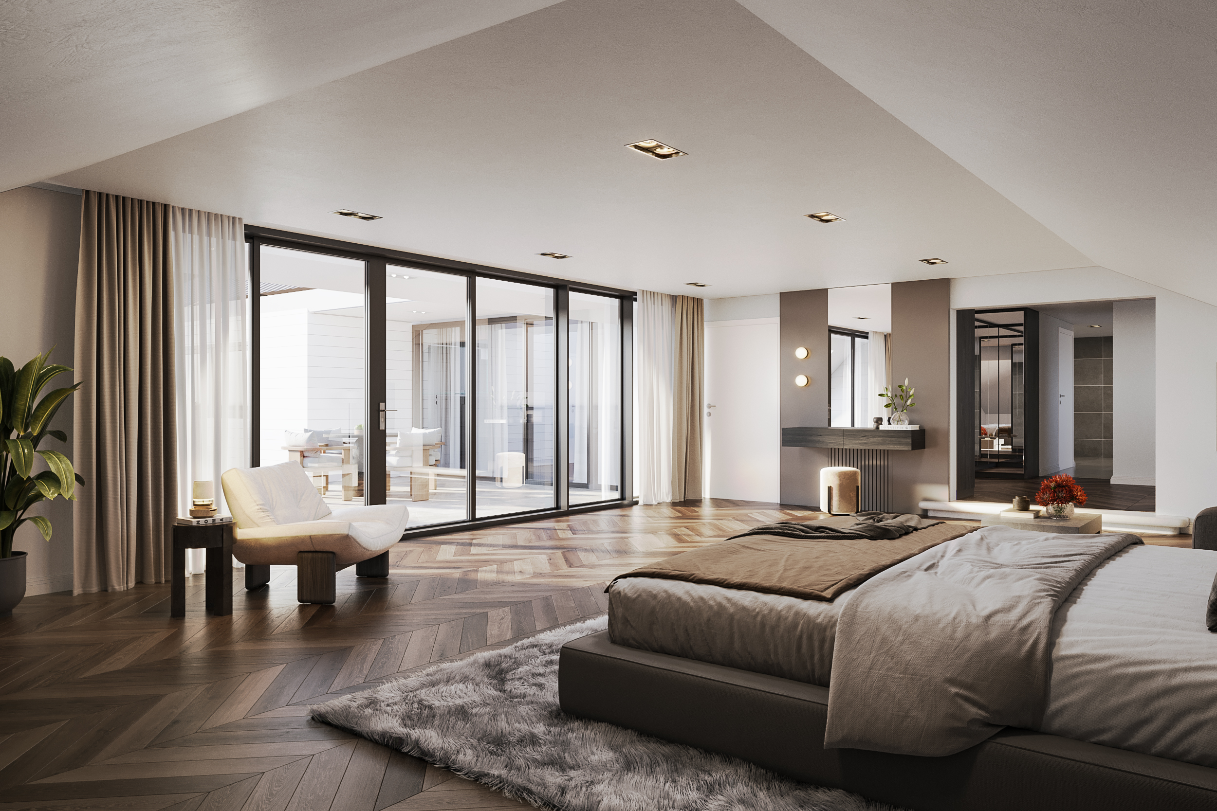 La planta baja cuenta con una cocina contemporánea equipada con electrodomésticos Miele y acceso a una entrada de servicio, además de una suite de invitados con baño privado. En la planta superior, la suite principal integra dos vestidores, un espacioso baño en suite con jacuzzi y acceso directo a una amplia terraza en la azotea. Dos dormitorios adicionales comparten acceso a otra terraza y a un baño, contribuyendo al diseño equilibrado.