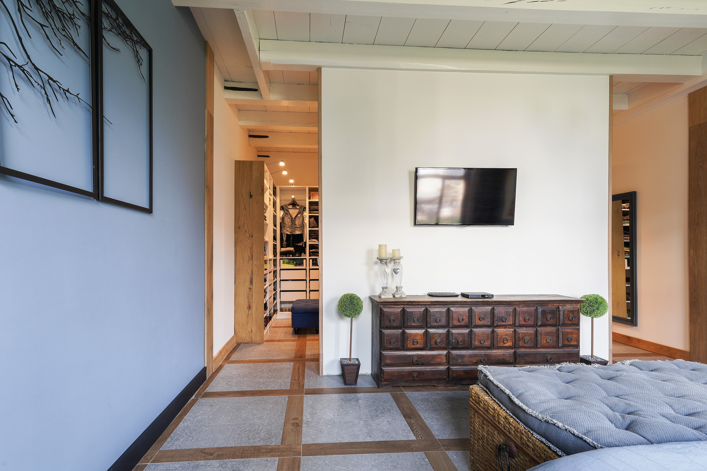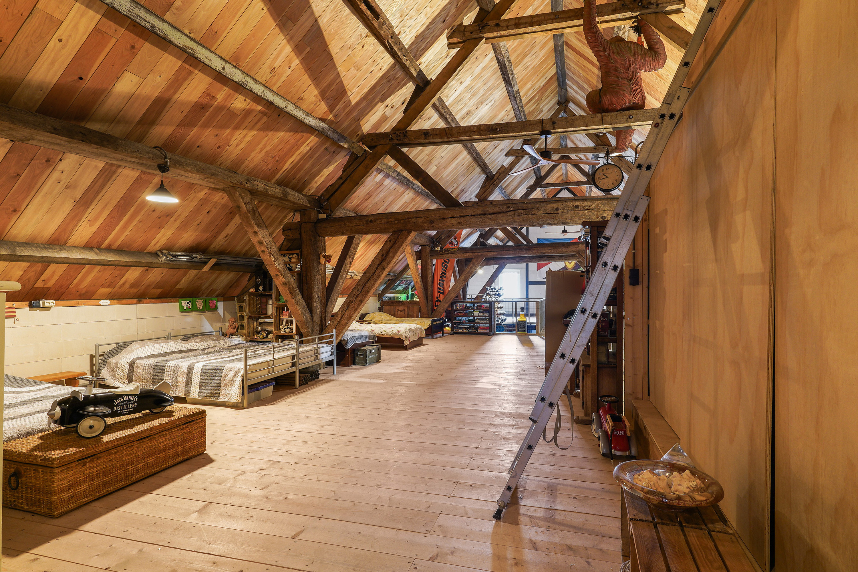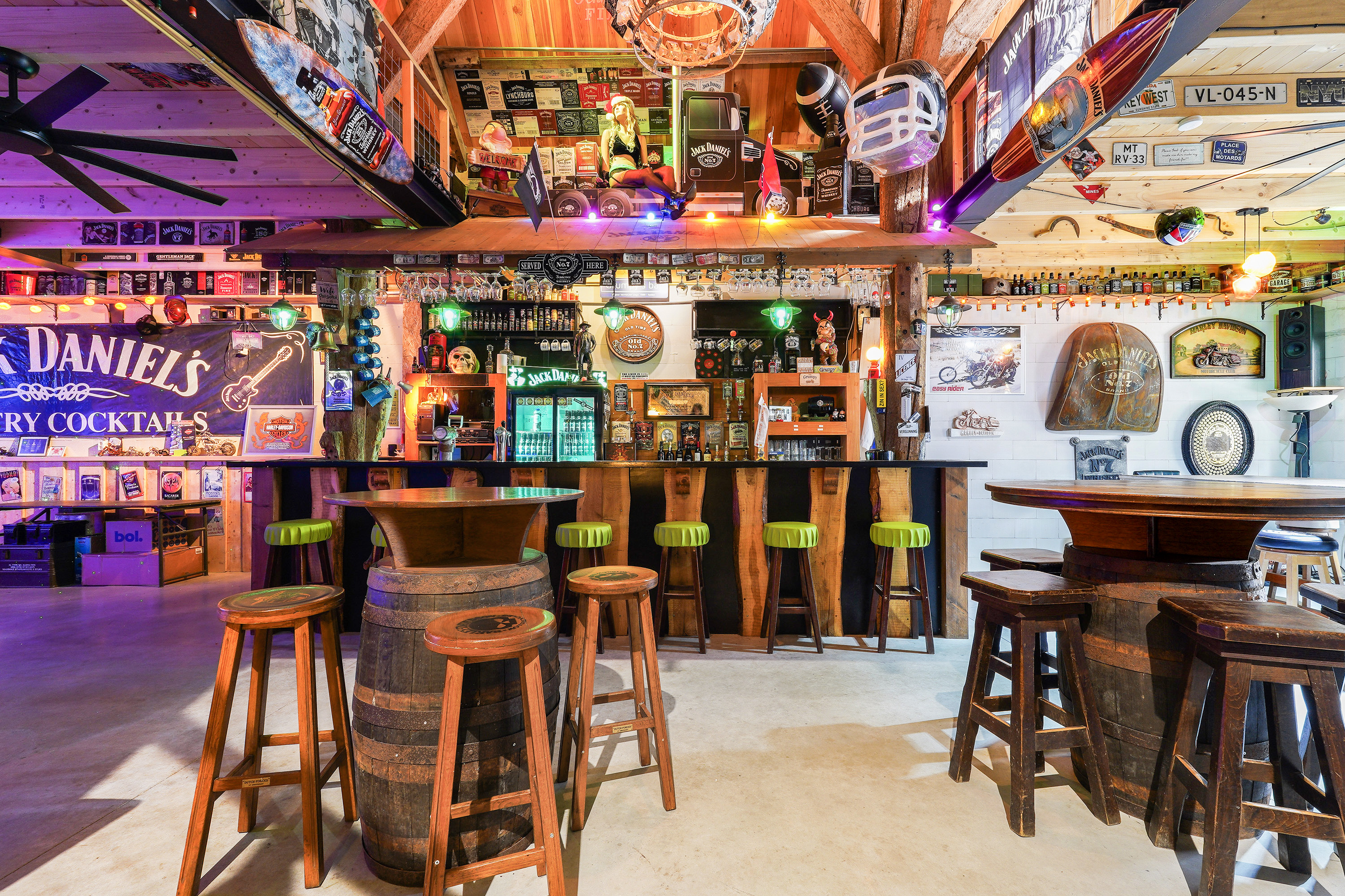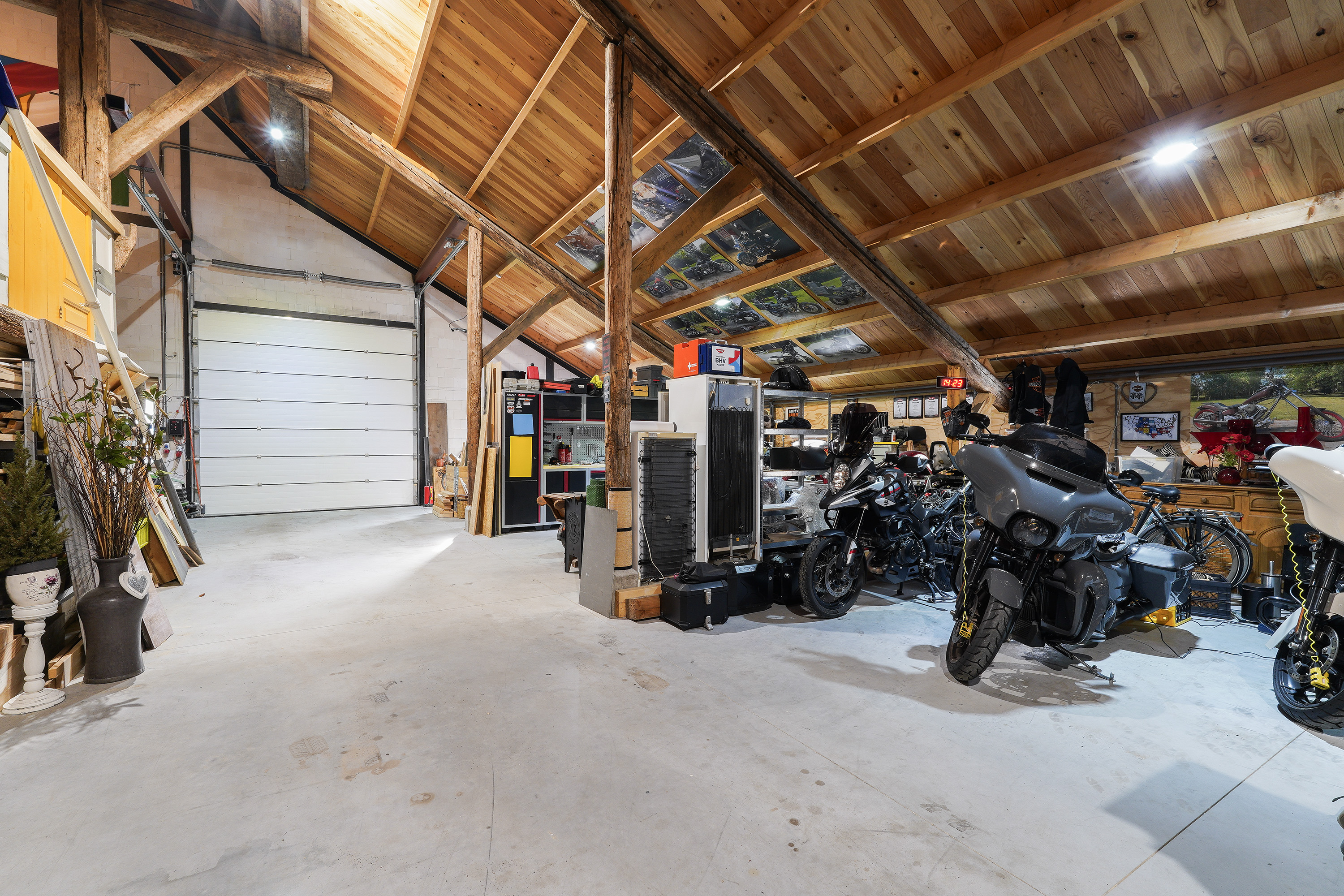 La cocina, definida por una gran isla y una mesa de comedor de madera, se abre a una acogedora zona de estar, ideal para reuniones tanto íntimas como numerosas. A su lado, un destacado espacio de bar incluye refrigeración, aseo y un espectacular altillo. El garaje, de casi 160 m² y con una puerta seccional de 3,5 metros, está pensado para coleccionistas, viajeros o artesanos.