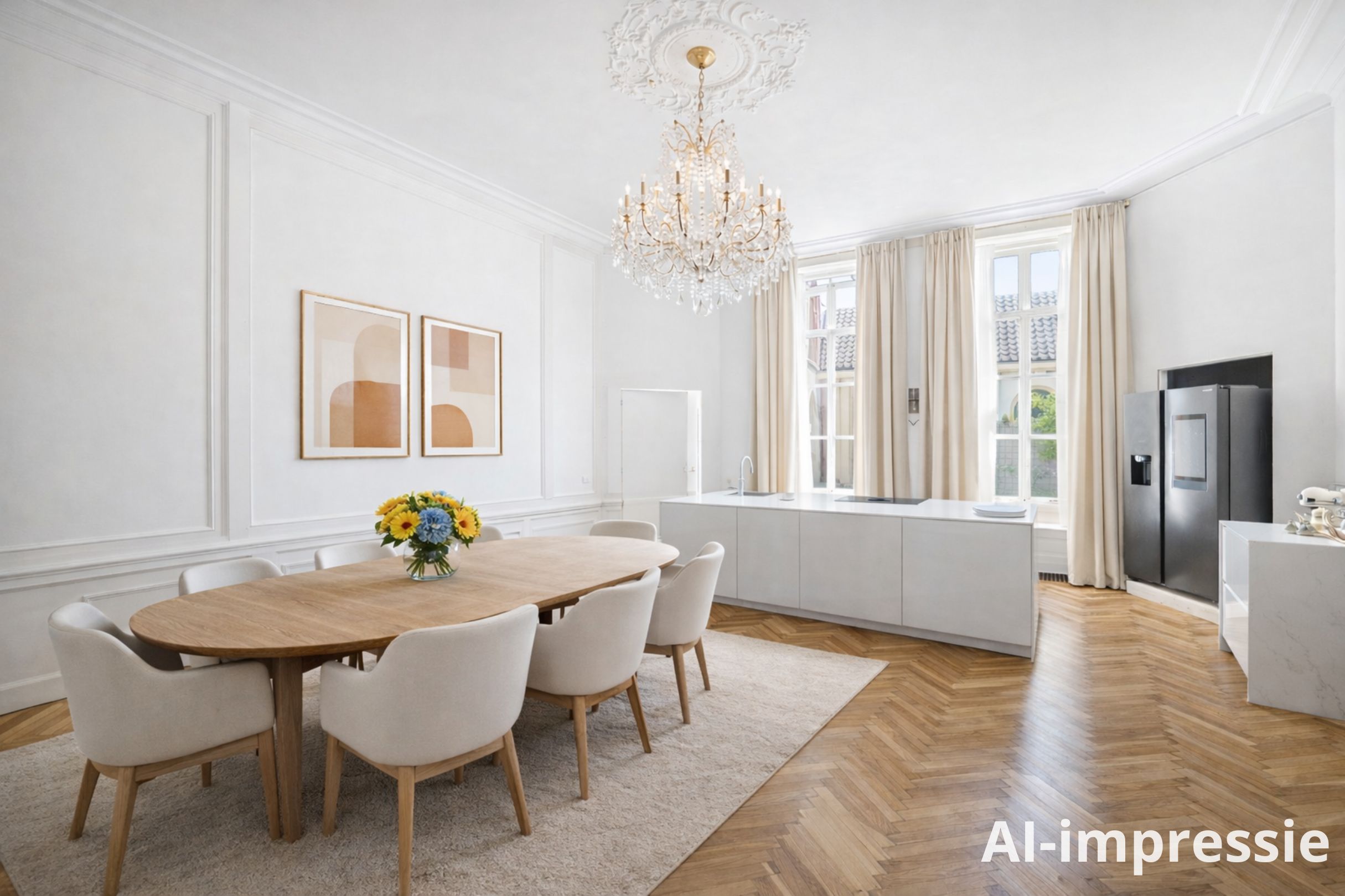 Cruzando la entrada doble clásica, el vestíbulo da la bienvenida con su suelo de mármol y abundante luz natural. Una zona de estar y cocina combinada de casi 100 m² ancla la planta principal. El salón, de 43 m², presenta bancos de ventana originales y una chimenea ornamental de época, mientras que los suelos de roble en espiga aportan calidez y elegancia. La cocina está equipada con muebles blancos sin tiradores, electrodomésticos de alta gama, incluyendo una placa de inducción con extractor integrado y un gran frigorífico-congelador.