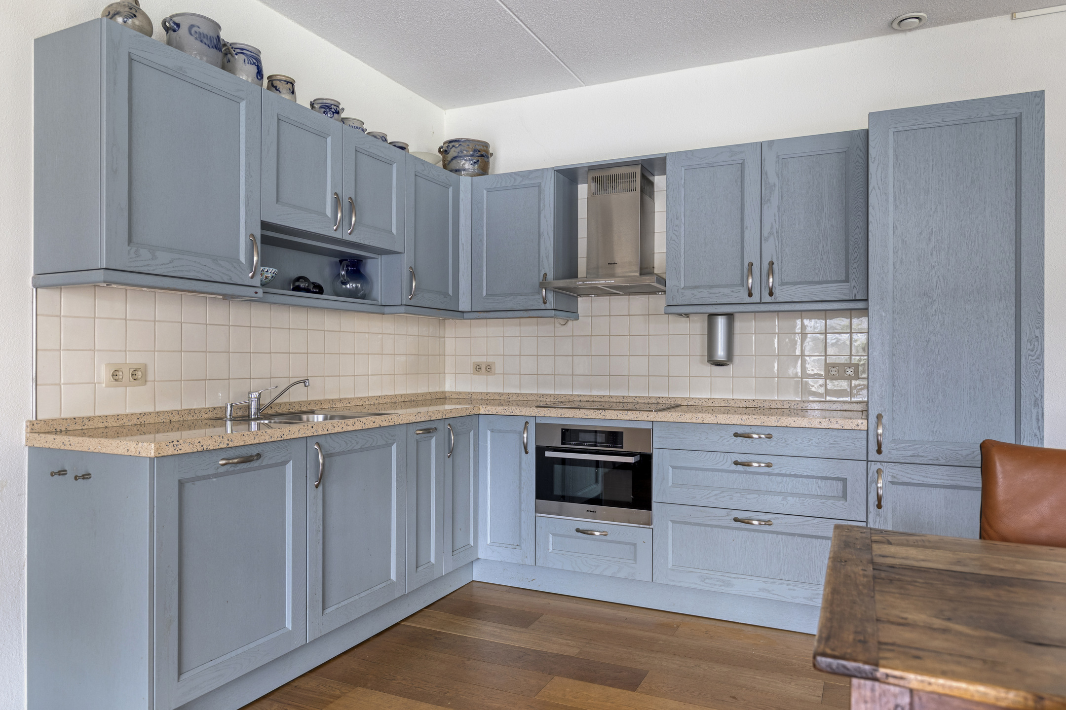 Vanuit de hal bereikt u de royale woonkamer met open keuken en toegang tot de praktische bijkeuken. De woonkamer is bijzonder ruim opgezet en biedt meer dan voldoende plaats voor meerdere zithoeken én een grote eettafel. De open keuken is netjes afgewerkt en voorzien van hoogwaardige Miele-inbouwapparatuur, waaronder een 4-pits inductiekookplaat, koelkast met vriesvak, combimagnetron en vaatwasser.