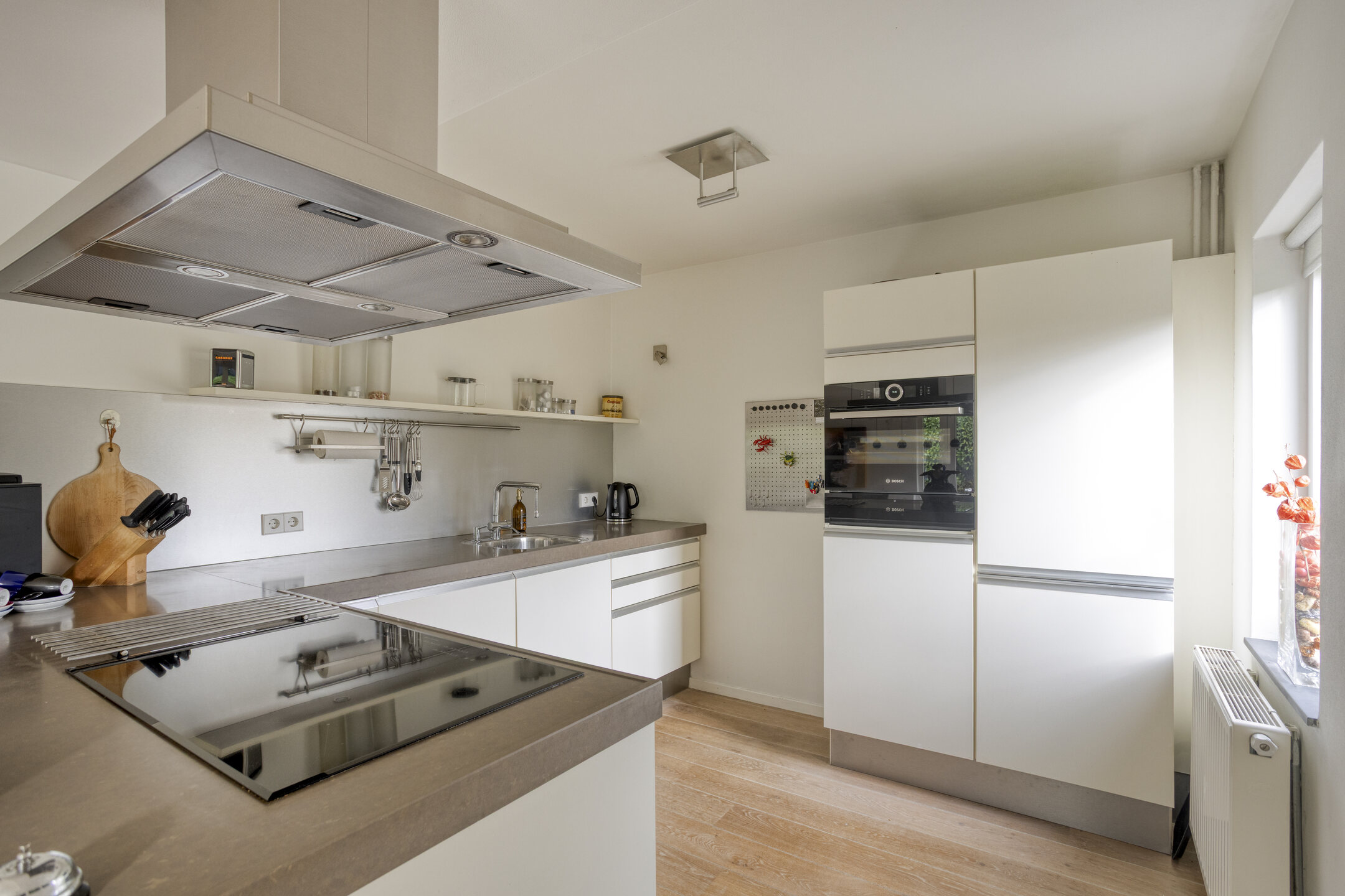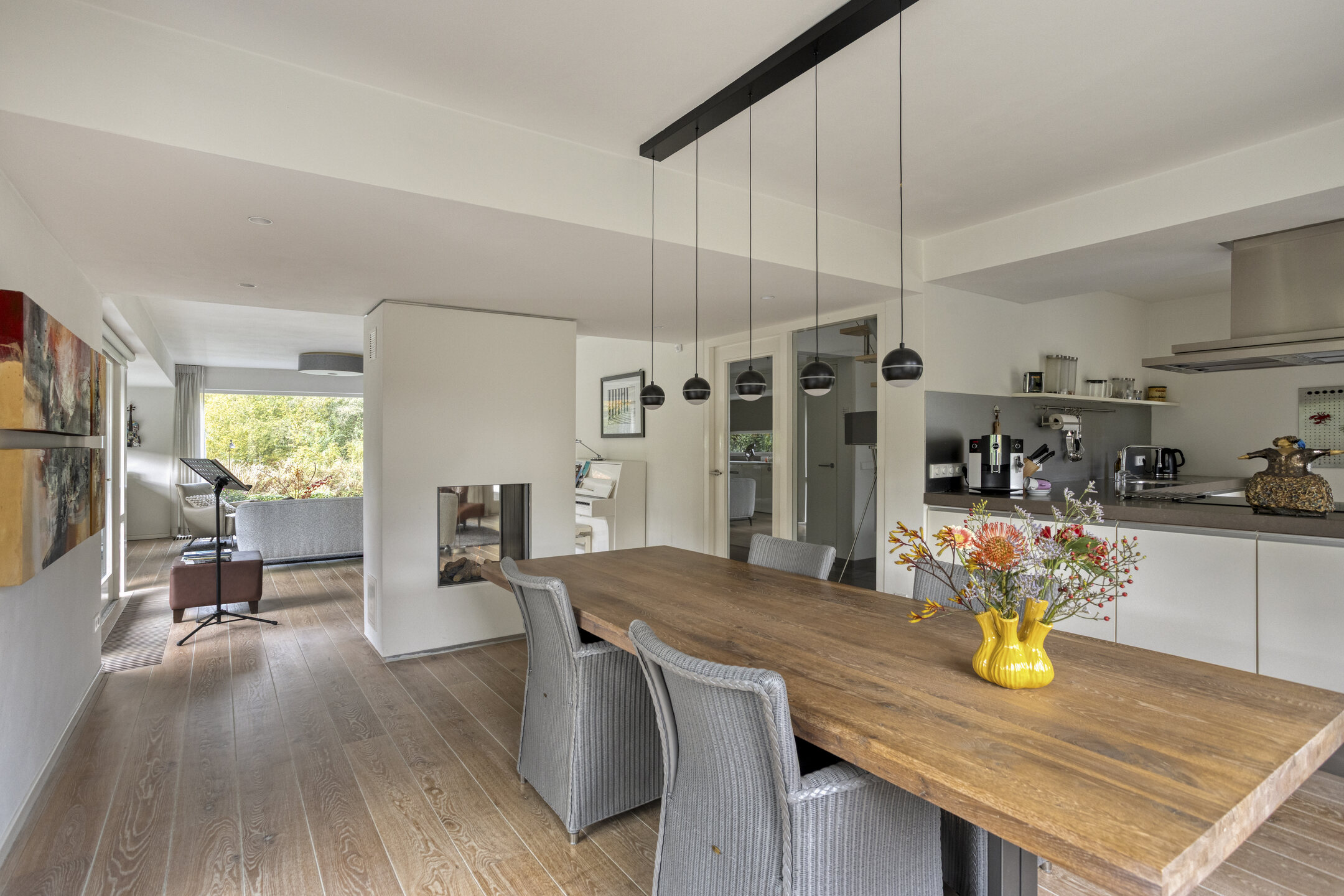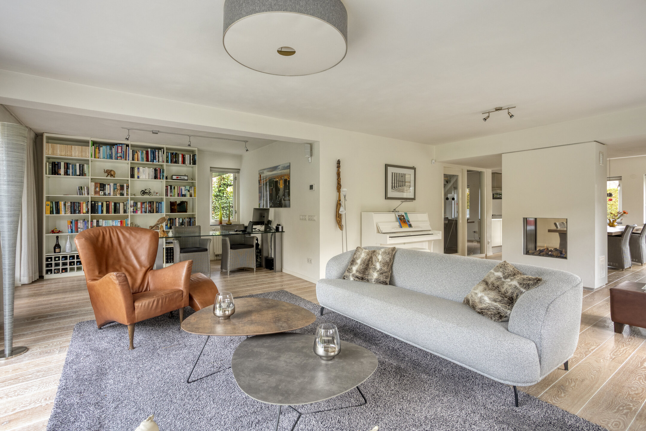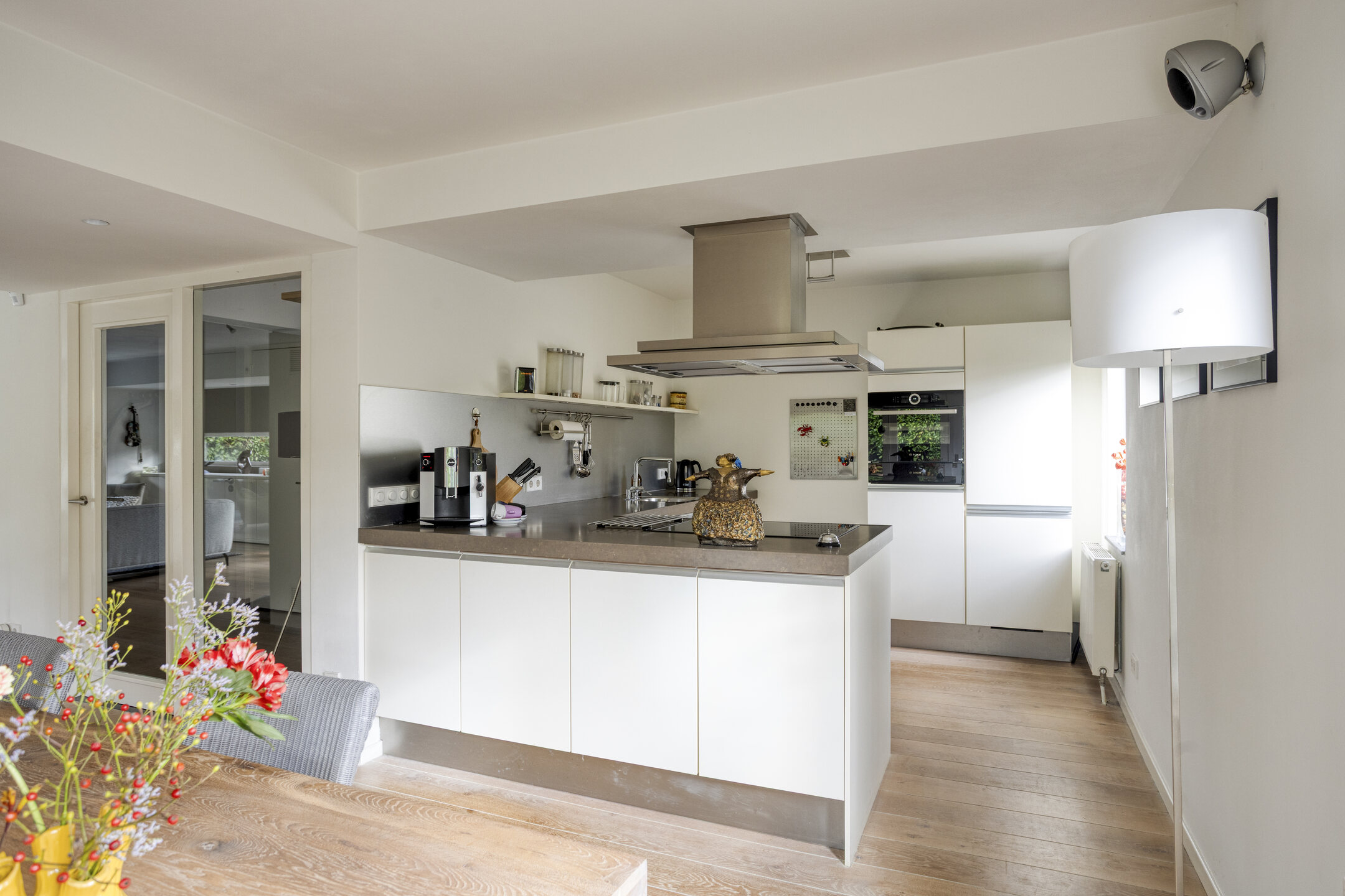 Aan de voorzijde van de woning ligt de luxe keuken. Deze is voorzien van een Belgisch zoetstenen werkblad en recent vervangen topapparatuur van Bosch, AEG en Gaggenau, zoals een vaatwasser, koel-vriescombinatie, stoomoven met bordenwarmer, 4pits inductiekookplaat en afzuigkap. Een genot voor iedere kookliefhebber! De tuingerichte woonkamer ligt aan de achterzijde van de woning en is door de grote glazen pui heerlijk licht. Hier heeft u ruimte voor een fijne zithoek met breed uitzicht op de prachtig aangelegde tuin aan het water en het natuurpark Egmonderhout.
