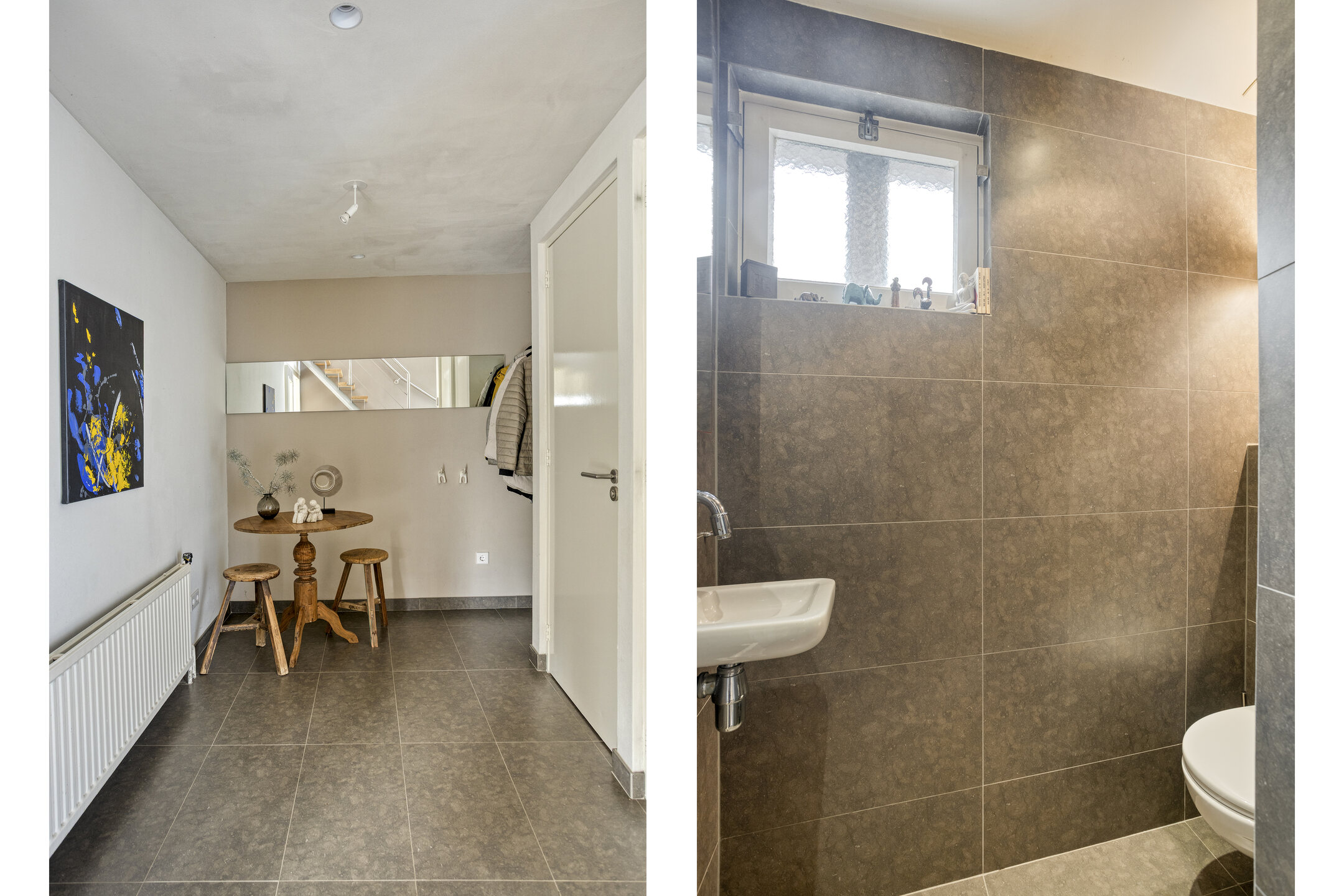 Zodra u binnenstapt, valt meteen de hoge hal met vide en prachtige houten open trap op. De hal biedt toegang tot het nette toilet met fontein, de meterkast en een handige bergkast achter de garderobe. Vanuit de hal loopt u via de glazen door naar de woonkamer en de woonkeuken. De massief eiken vloer geeft warmte, de strakke wanden en plafonds zorgen voor rust, en de Bellfire doorkijk gashaard verbindt de twee ruimtes op een heel stijlvolle manier.