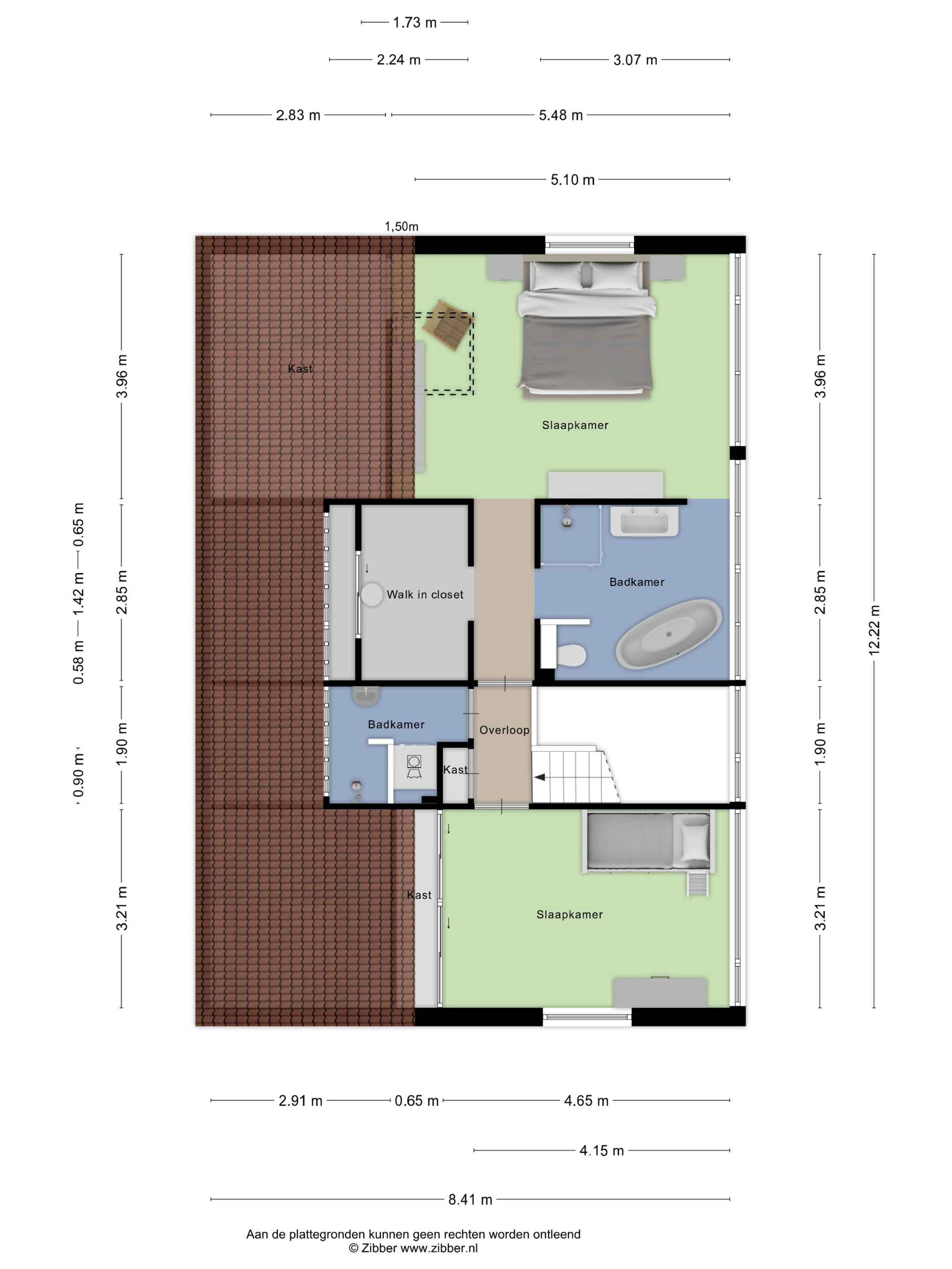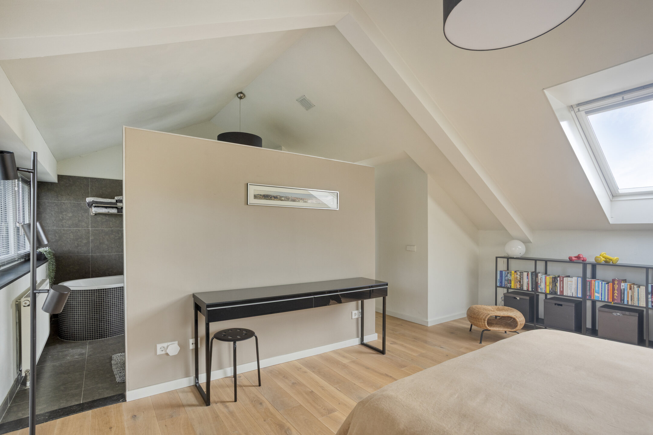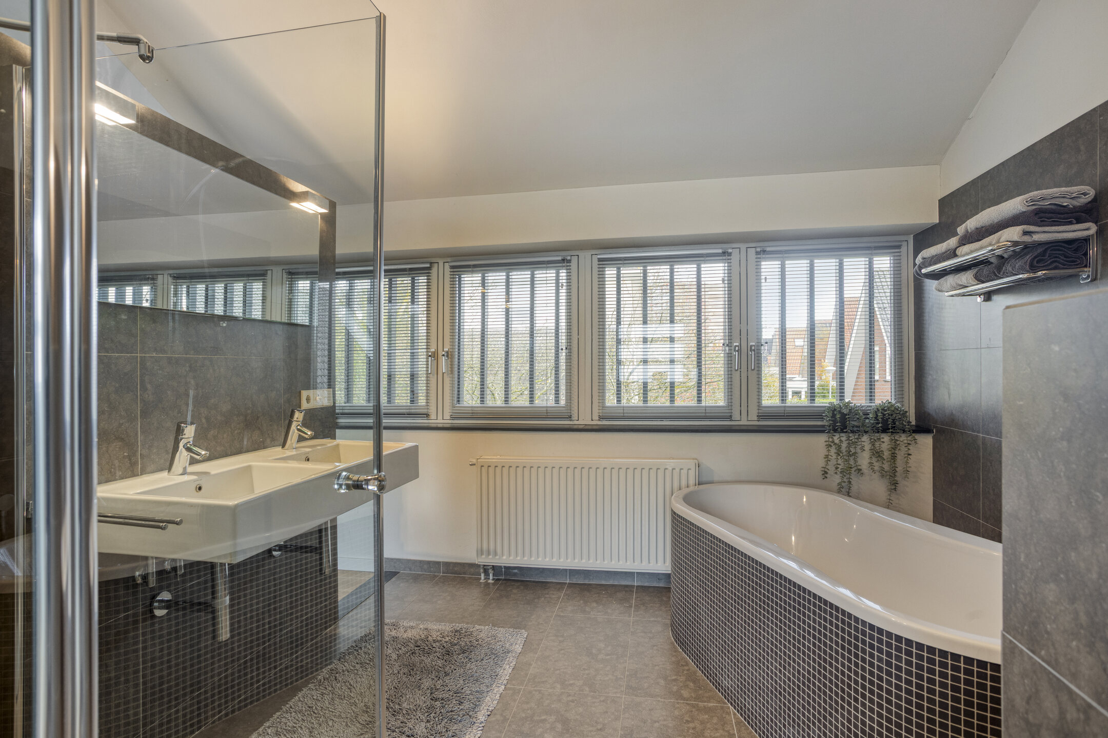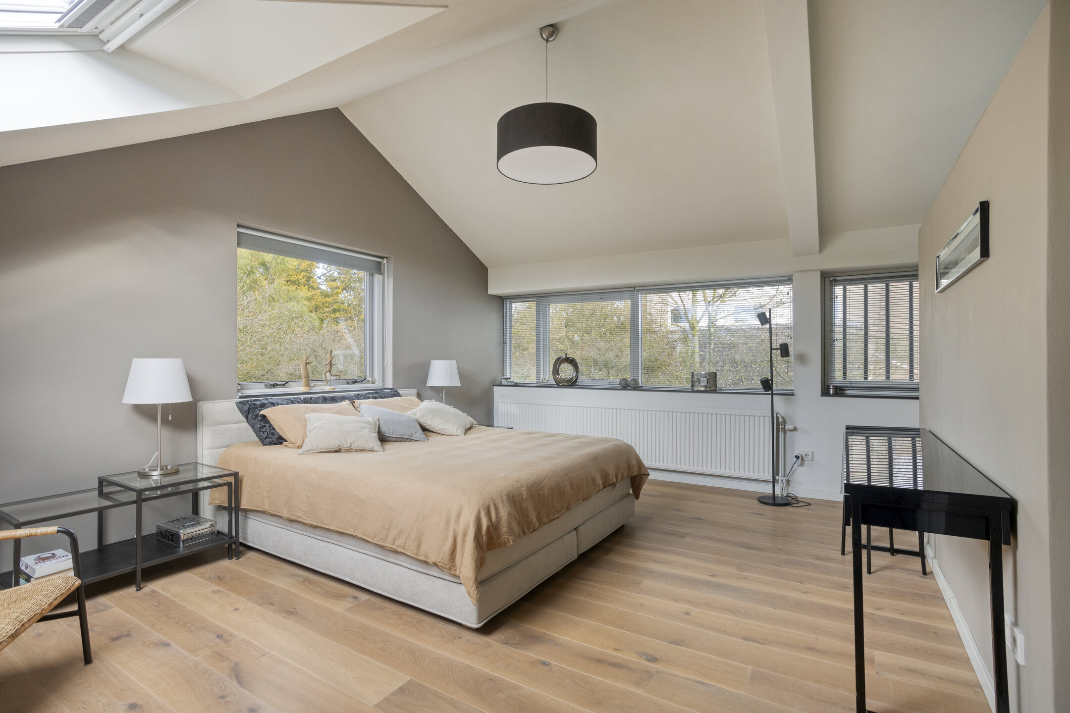 Via de trap komt u op de 1e verdieping, die geheel is afgewerkt met een houten vloer en gestucte wanden en plafonds. Hier bevind zich aan de voorzijde een ruime slaapkamer met een inbouwkast. Een compacte tweede badkamer met inloopdouche, wastafel en aansluiting voor wasmachine en droger is via de overloop te bereiken, evenals de CV-ruimte met CV-ketel uit 2024! Aan de achterzijde vind u de indrukwekkende master bedroom. Licht, ruim en voorzien van een ruime inloopkast en een luxe open badkamer met dubbele wastafel, inloopdouche en een heerlijk ligbad. Tevens bied deze slaapkamer uitzicht over de tuin en heeft het de beschikking over bergruimte in het knieschot.