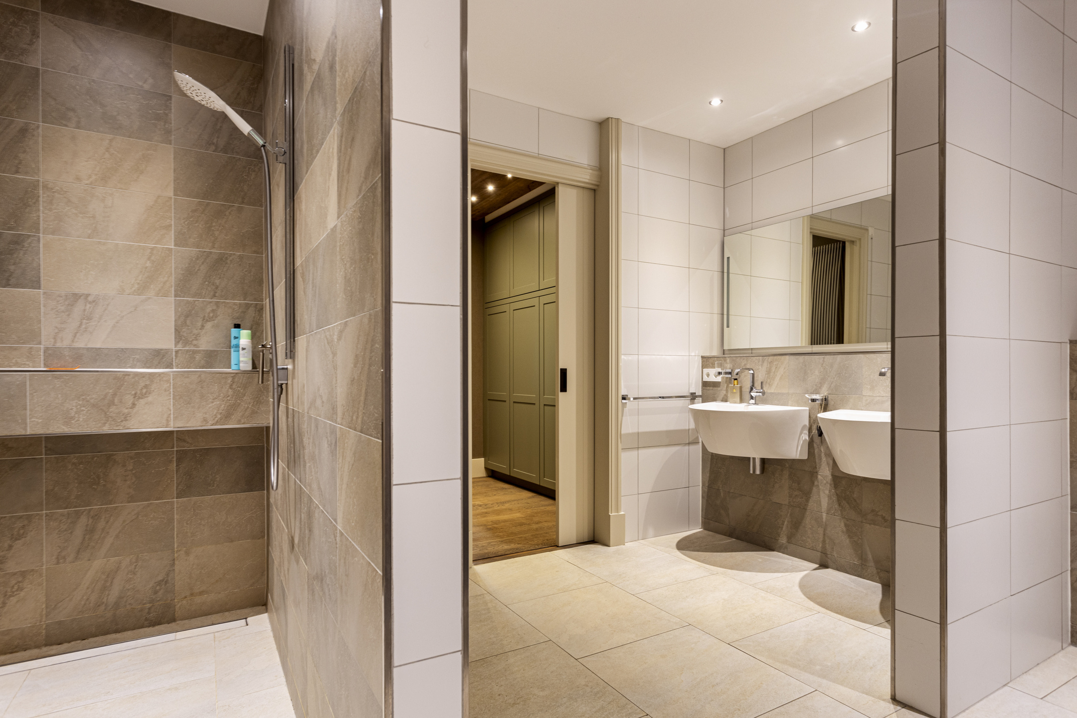 De grote slaapkamer is te bereiken middels de badkamer: met de allure van een exclusief resort, is deze voorzien van een dubbele douche met regendouche, een vrijstaand bad met uitzicht op de tuin, en een grote dubbele wastafel.