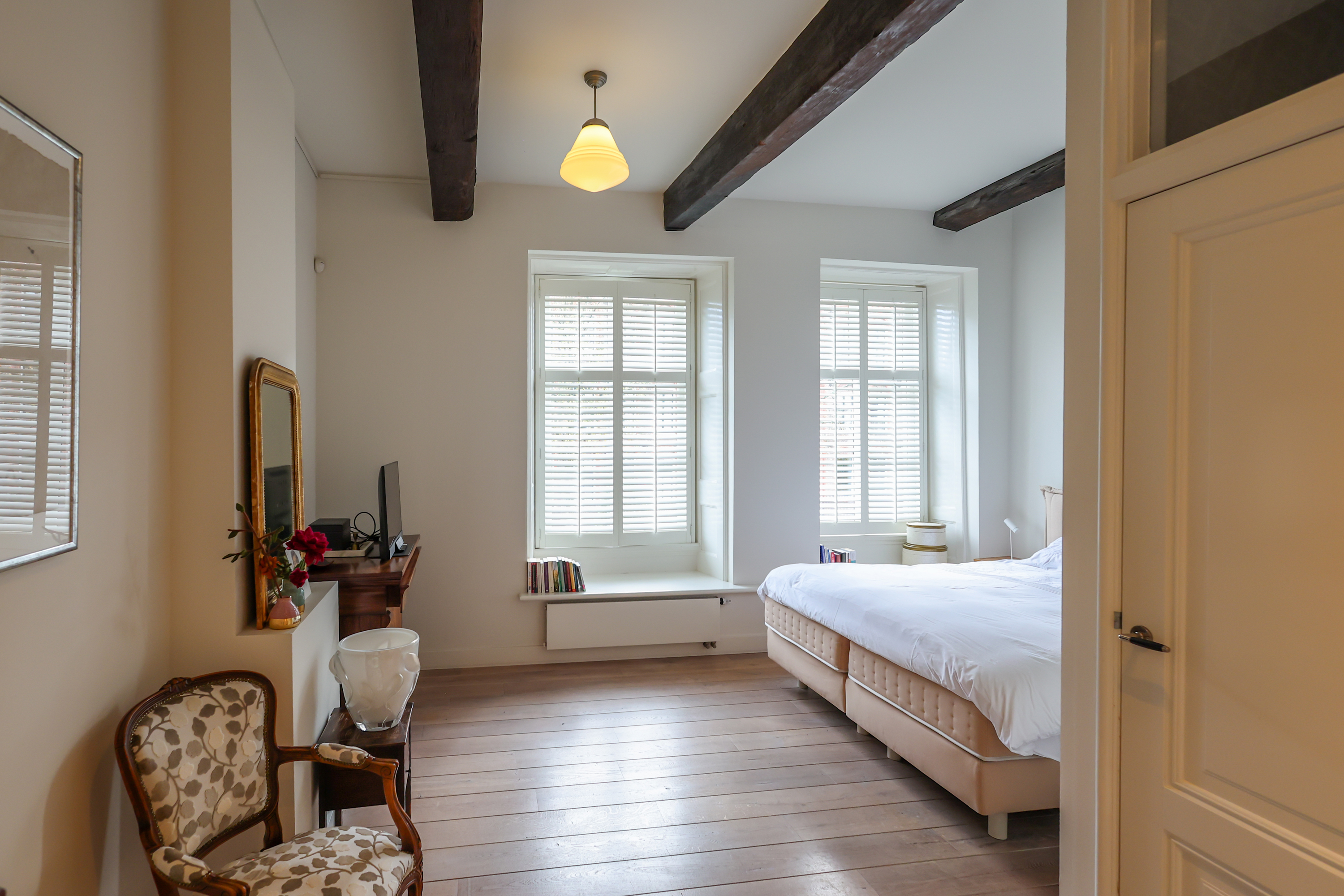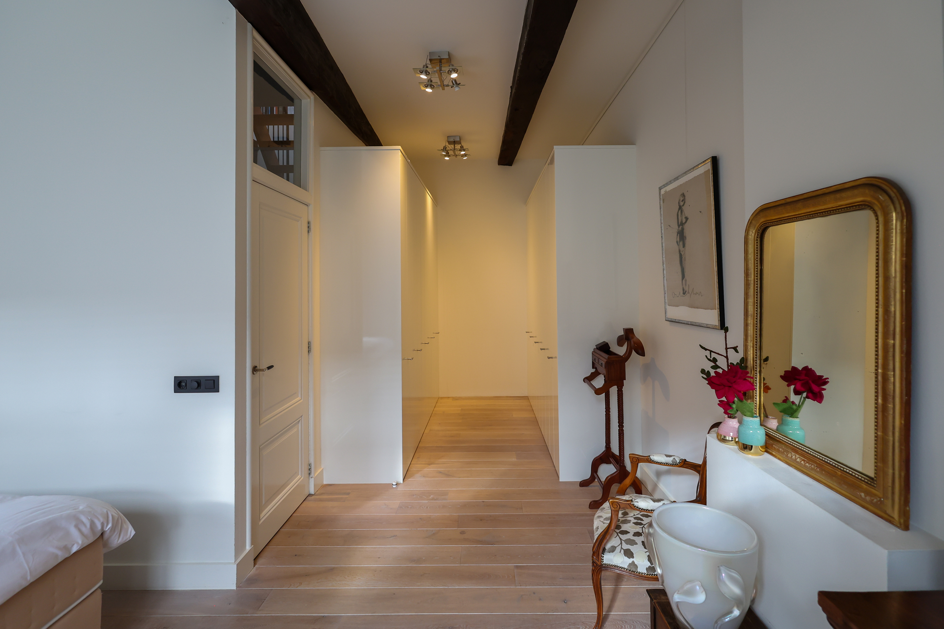 Op de eerste verdieping vind je een ruime ouderslaapkamer met walk in closet v.v. op maat gemaakte kledingkasten, een moderne stijlvolle badkamer met dubbele wastafelmeubels, bad en inloopdouche, op de overloop bevindt zich ook een praktische wasruimte/ toilet. De indrukwekkende werk-/slaapkamer met zichtbare oude stadswal en dakramen over de hele breedte is een heerlijke plek om te werken, spelen of tot rust te komen.