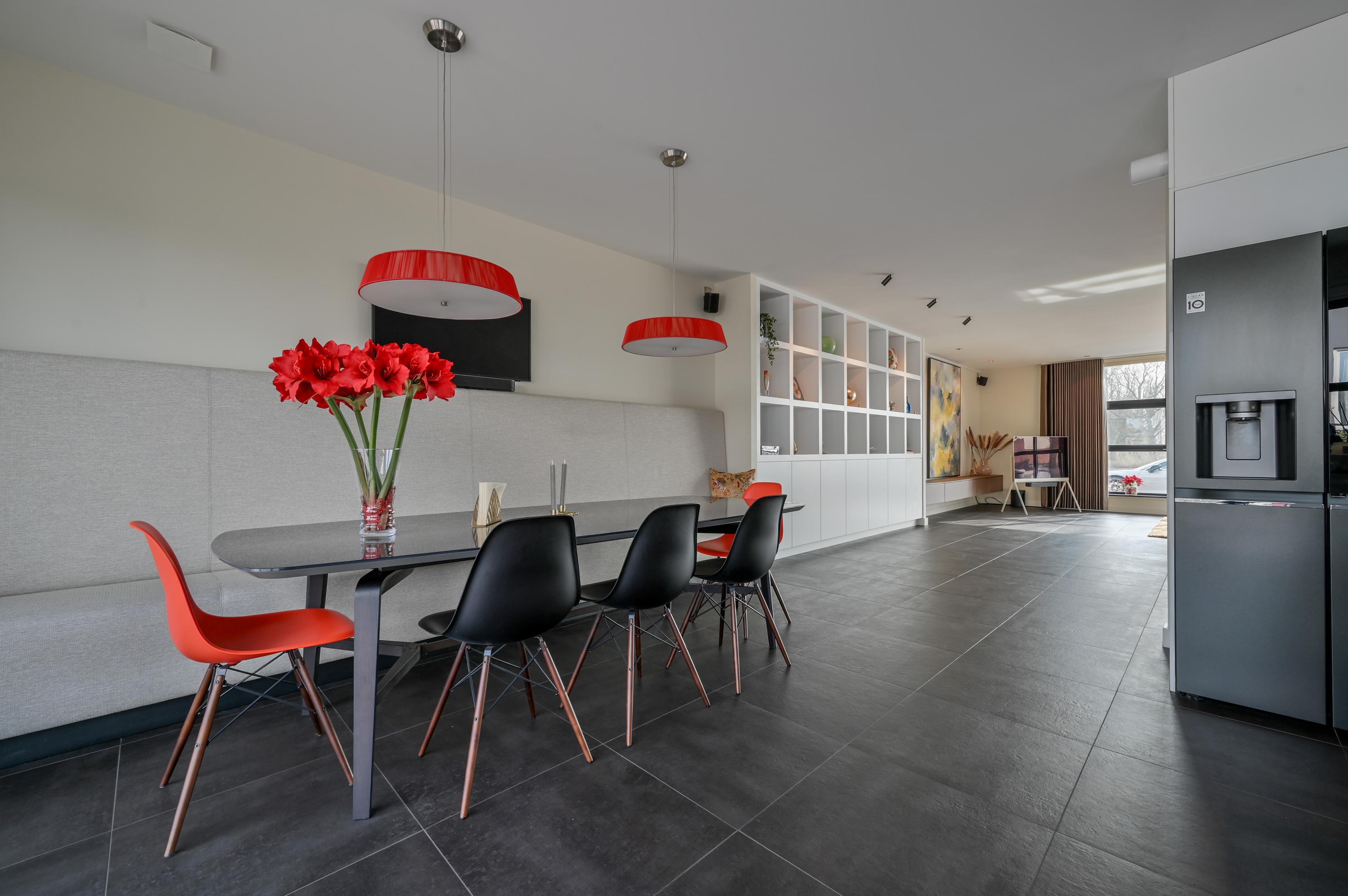 Aan de achterzijde bevindt zich de royale, luxe open keuken, ontworpen voor koken én leven. Het spoeleiland, de Qooker, vaatwasser, combi-ovens, inductiekookplaat met afzuigkap, grote LG-koelkast met vriezer en ijsblokjesmachine, Liebherr-wijnklimaatkast en uitgebreide kastruimte maken deze keuken tot een droom voor elke liefhebber van koken en gastvrijheid. Een vaste bank bij de grote eettafel zorgt voor een gezellige zithoek, terwijl dubbele openslaande deuren toegang geven tot de royale terrastuin, waar licht, ruimte en rust samenkomen.