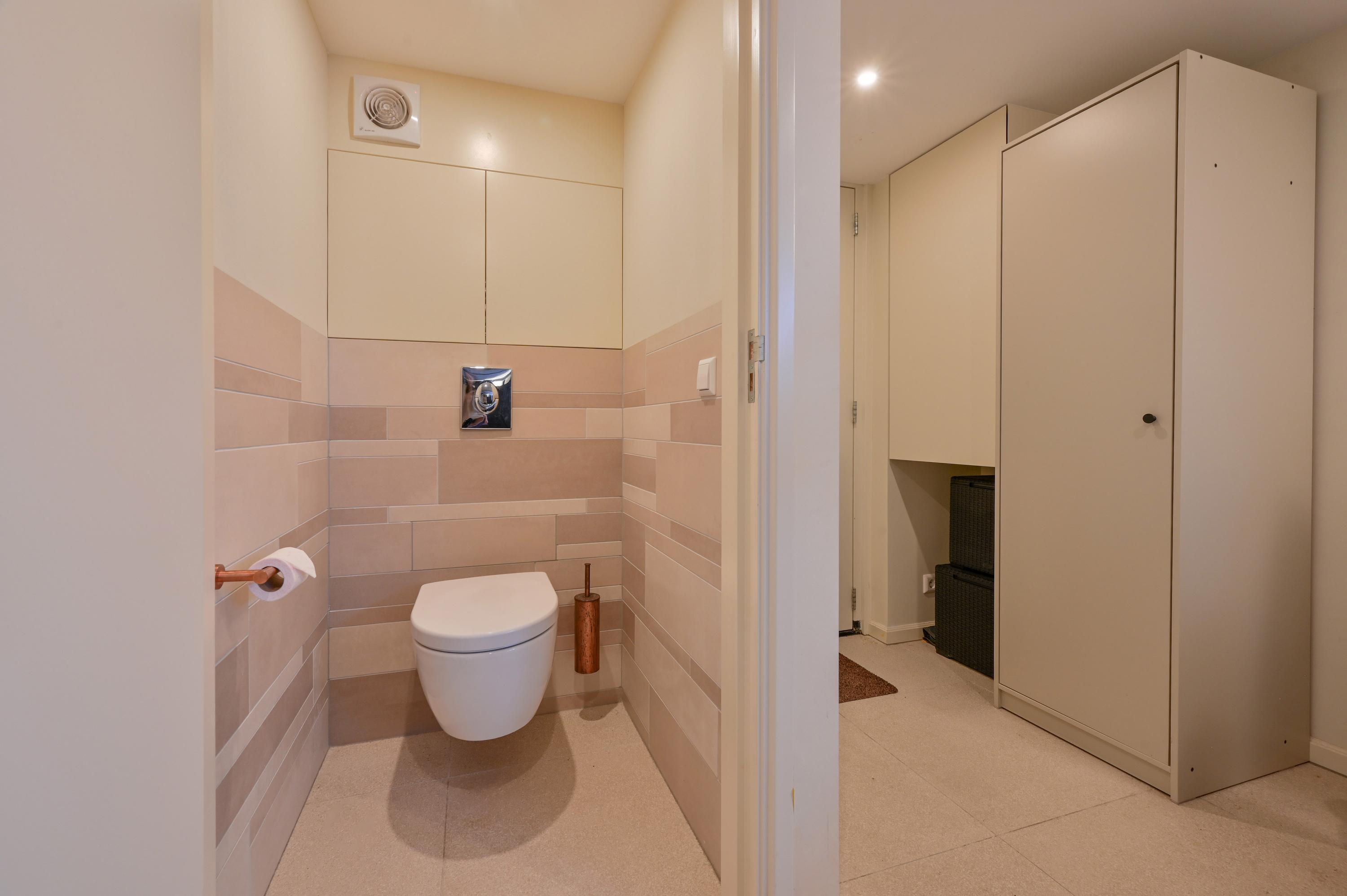 De gang biedt toegang tot de praktische stookruimte met CV-installatie en waar tevens de wasmachine en droger zijn geplaatst. Langs de gang en de trap naar het dakterras bevinden zich op maat gemaakte vaste kasten, die zorgen voor meer dan voldoende bergruimte en een overzichtelijke indeling van het gehele woonoppervlak.