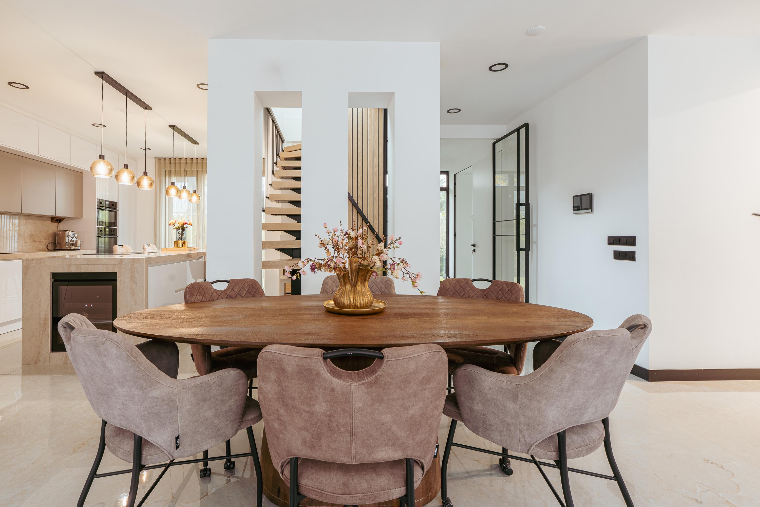 Middels de verzorgde voortuin bereikt u de entree van de woning. De ruime hal vormt een prettige binnenkomst. Vanuit de hal betreedt u de royale woonkamer, die wordt gekenmerkt door een overvloed aan daglicht. De woonkamer staat middels grote raampartijen en glazen deuren in directe verbinding met het terras in de tuin, waardoor binnen en buiten op natuurlijke wijze in elkaar overlopen. Aangrenzend bevindt zich de luxe woonkeuken, uitgevoerd met een royaal kookeiland dat tevens fungeert als gezellige bar om aan te zitten. De keuken is van alle gemakken voorzien en beschikt over een oven en combi-oven, inductiekookplaat met interne afzuiging, klimaatkast, Quooker, vaatwasser, koelkast en vriezer. Er is volop ruimte voor een grote eettafel. Tevens is er achter de keuken een ruime bijkeuken en berging met genoeg ruimte voor opslag van apparatuur en etenswaren.