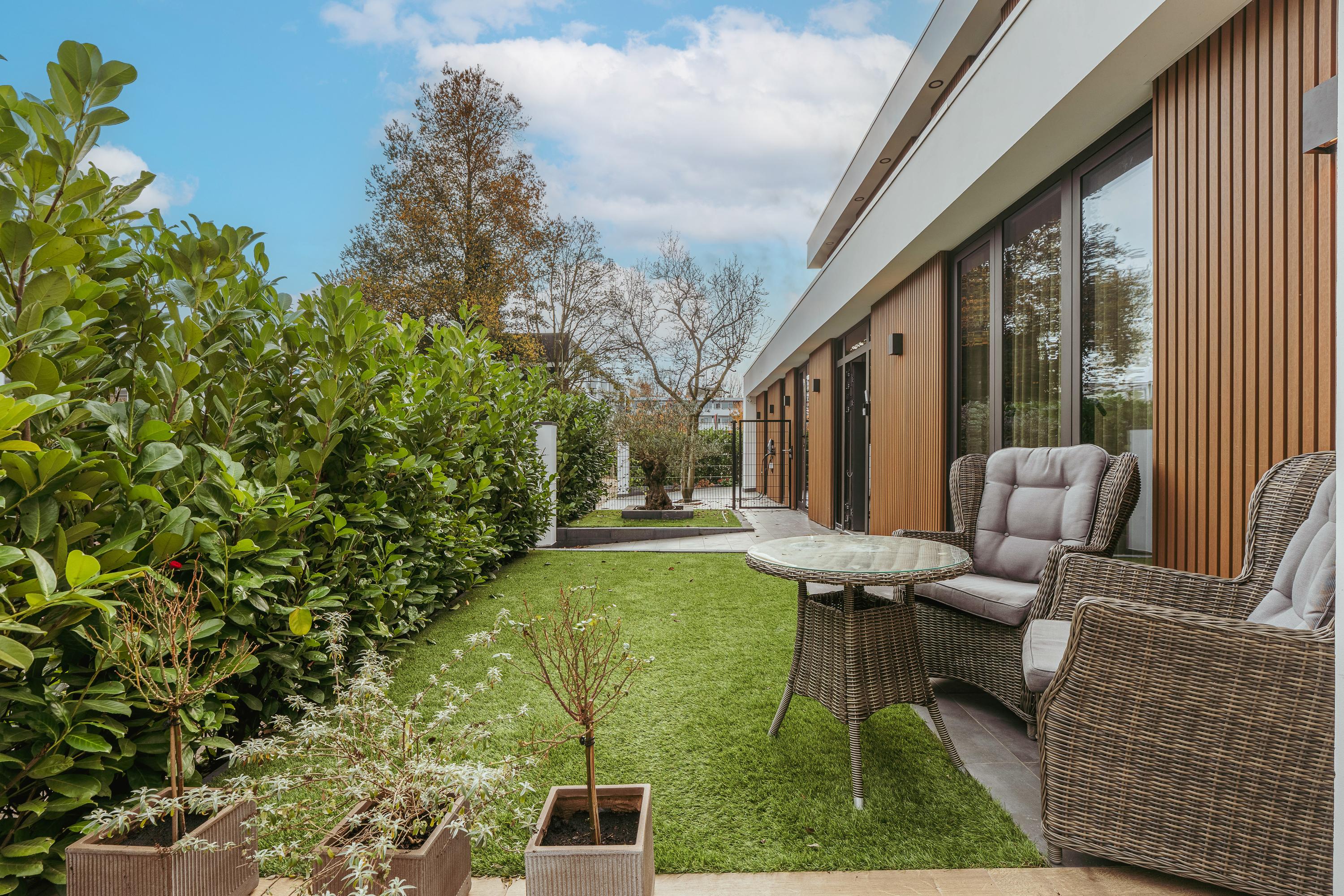 Op de begane grond bevindt zich de riante master bedroom met en-suite badkamer. Deze luxe badkamer is voorzien van een inloopdouche, dubbele wastafel met meubel en toilet. Het vrijstaande ligbad dat direct in de slaapkamer is gesitueerd draagt bij aan een hotelwaardige uitstraling. Daarnaast is er een comfortabel gastenverblijf aanwezig, eveneens met een eigen badkamer welke is uitegerust met wastafel met meubel, inloopdouce en toilet. Uniek is de volledig zelfstandige extra woonruimte op deze verdieping, bestaande uit een eigen woonkamer met keuken, slaapkamer en badkamer. Deze ruimte is uitermate geschikt voor bijvoorbeeld een au pair, mantelzorg, gastenverblijf of kantoor aan huis. Verder bevinden zich op deze verdieping een separaat toilet, de meterkast en diverse praktische bergruimtes. De fraai aangelegde tuin is op het zuiden gesitueerd. Er is een royaal terras met een vaste buitenkeuken en barbecue gerealiseerd, ideaal voor lange zomeravonden. Achter in de tuin bevindt zich een vrijstaand tuinhuis, dat uitstekend kan worden ingericht als home gym, hobbyruimte of werkplek aan huis.