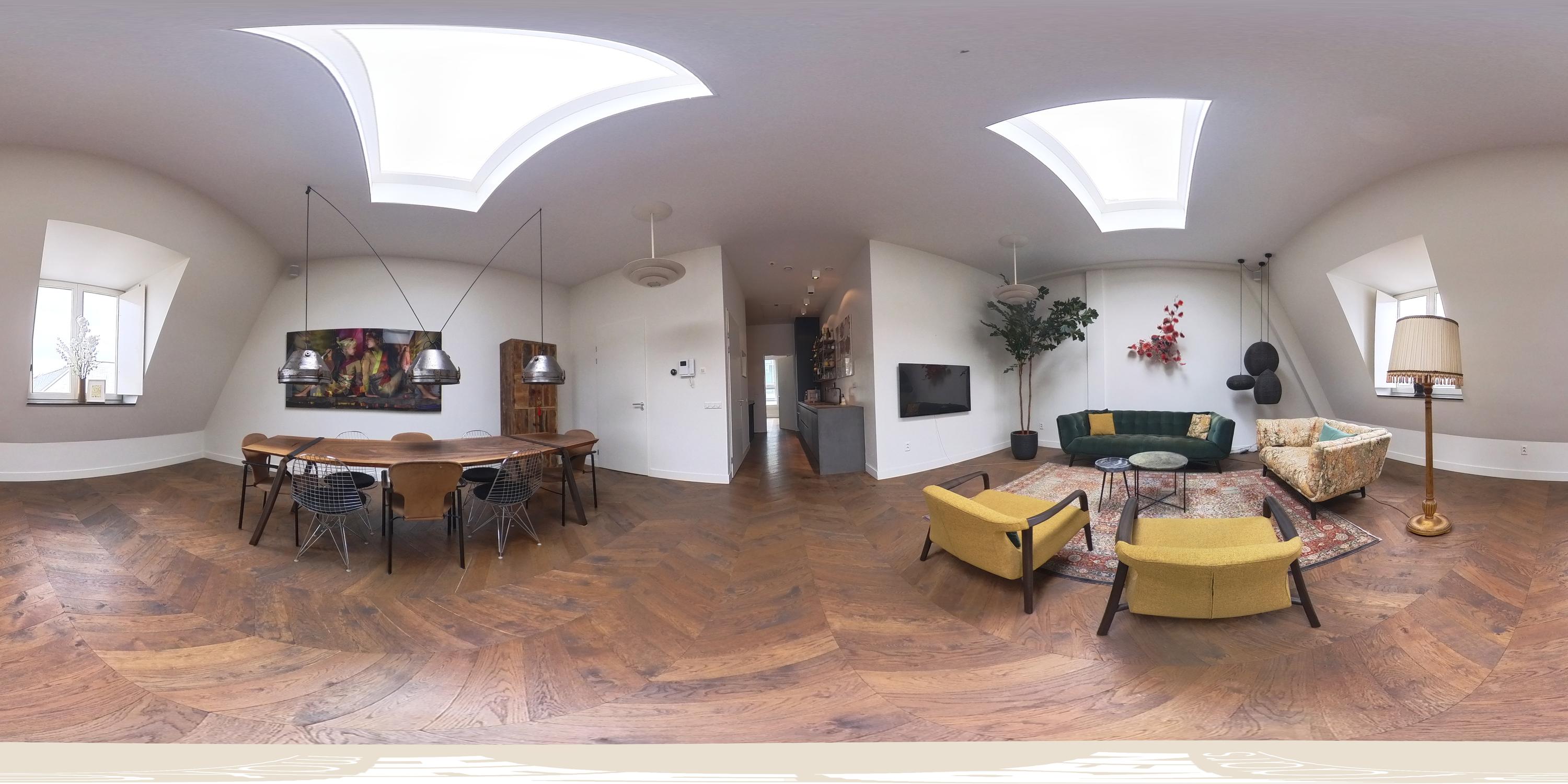 De derde verdieping vormt de woonverdieping van de woning. Hier bevindt zich de royale en lichte woonkamer met open keuken aan de voorzijde. Dankzij de indrukwekkende plafondhoogte en meerdere dakramen valt er veel daglicht naar binnen, wat de ruimte een bijzonder open en ruimtelijk karakter geeft. De houten vloer en de strakke afwerking zorgen voor een warme en moderne uitstraling.