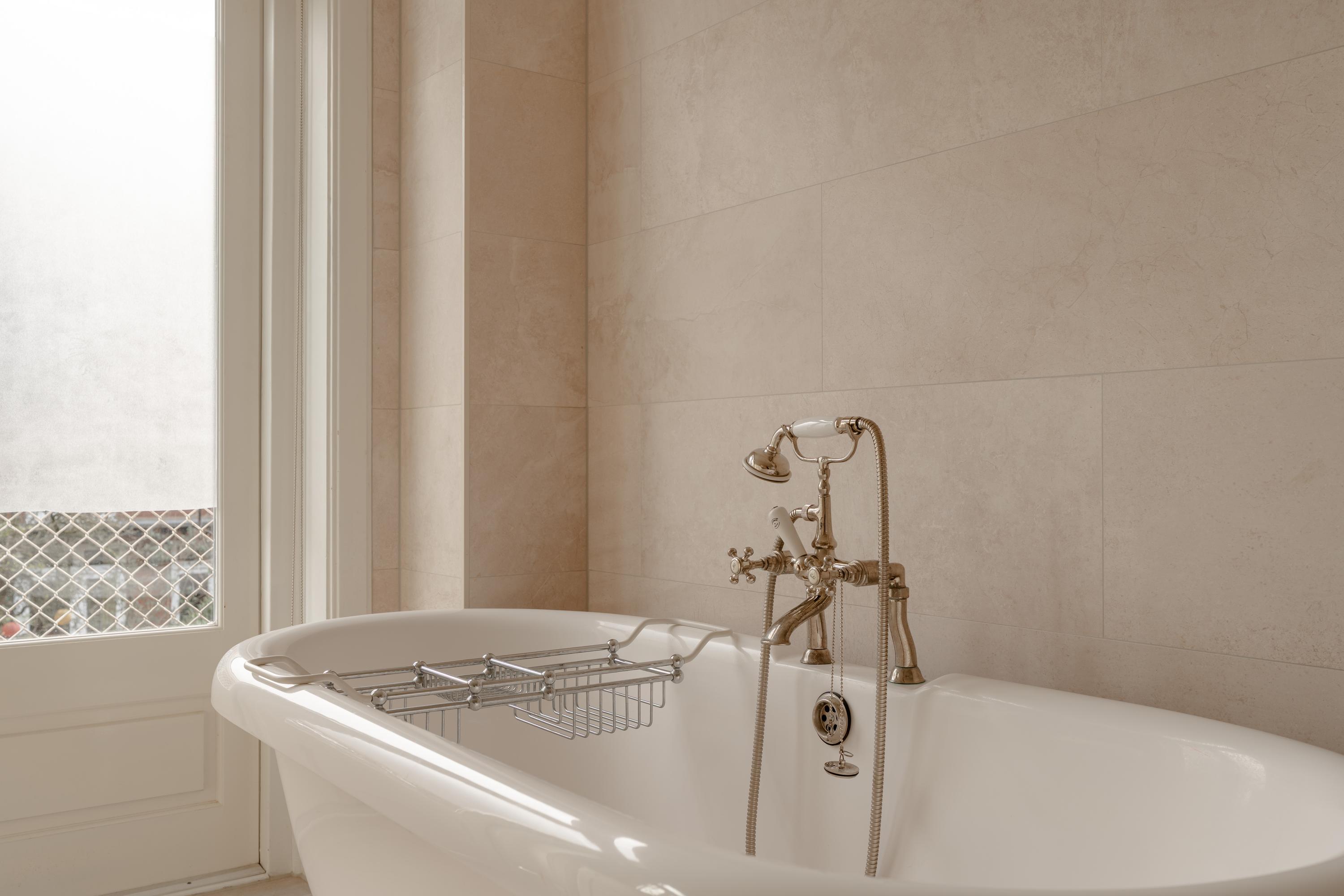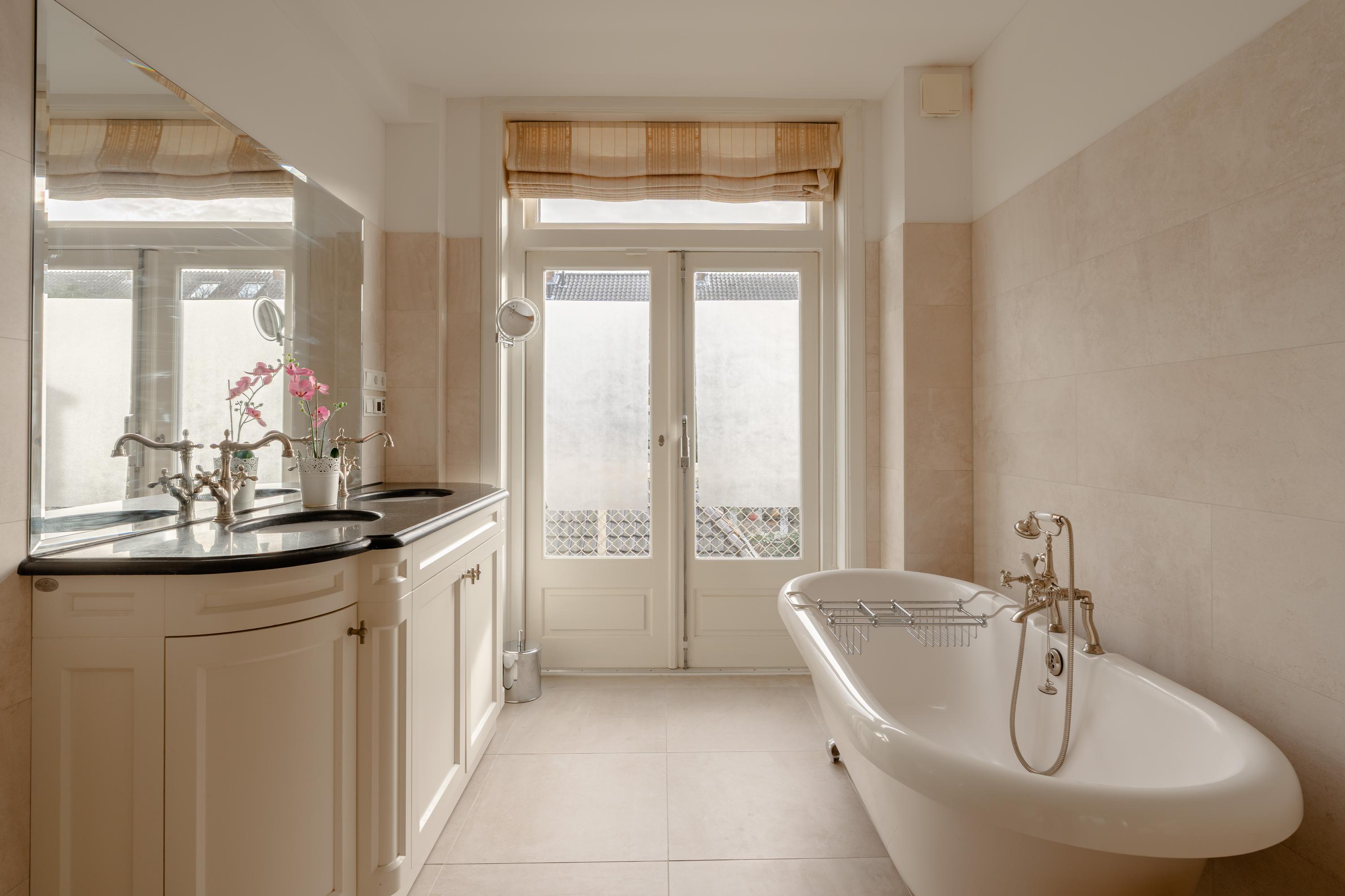 Aan de achterzijde van de woning bevindt zich de ruime master bedroom met toegang tot het balkon. De klassieke badkamer, uitgevoerd in beton ciré, beschikt over een douche, dubbele wastafel, handdoekradiator en een vrijstaand ligbad. Via de openslaande deuren in de badkamer heeft u eveneens toegang tot het balkon.