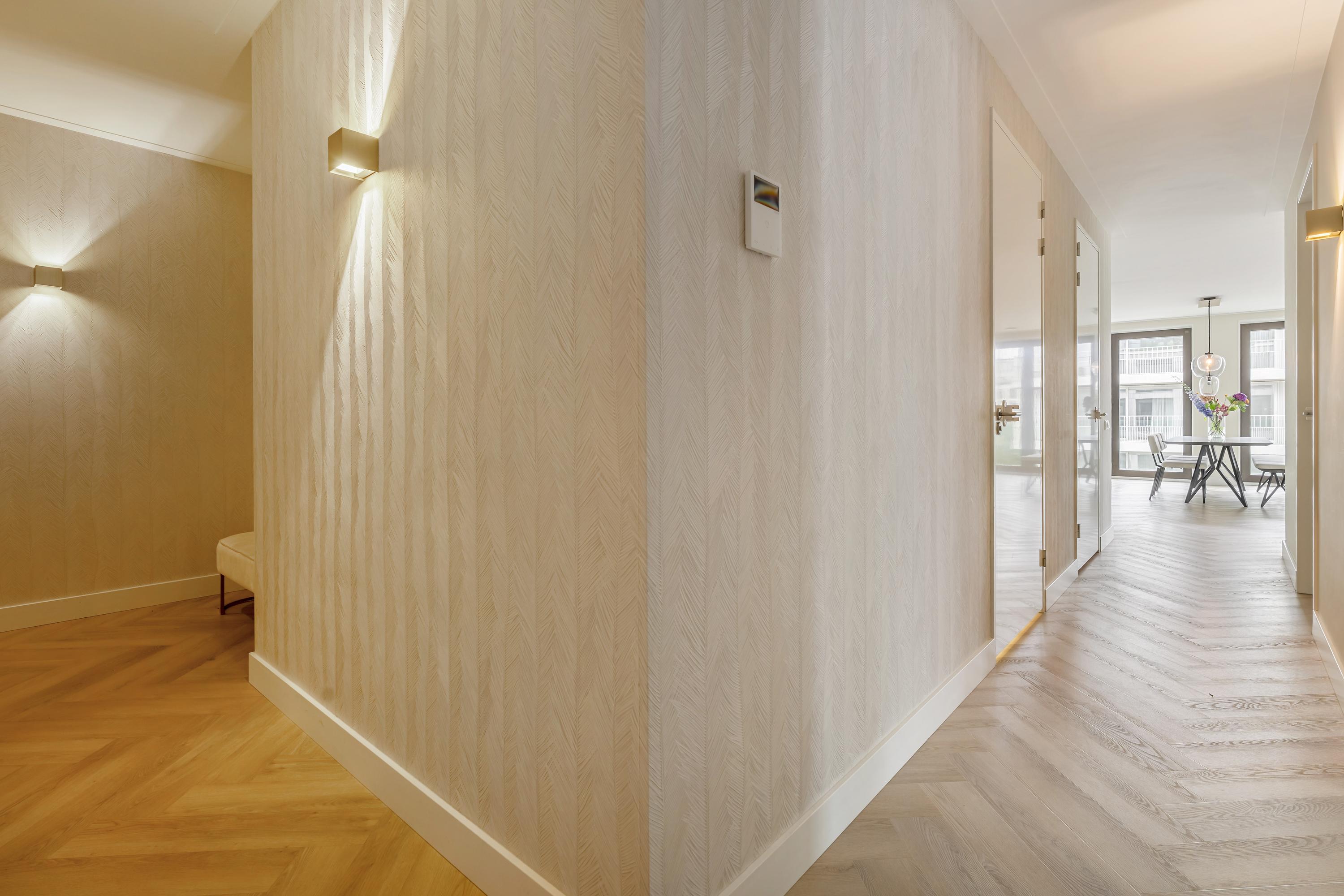 Bij binnenkomst in de ruime hal valt direct de verzorgde afwerking op: een lichte visgraatvloer, zachte tinten en subtiele wandverlichting geven het geheel een rustige, moderne uitstraling. De hal biedt toegang tot alle vertrekken en beschikt over een ruime berging, een aparte wasruimte met aansluitingen voor wasmachine en droger en een separaat toilet met fontein. De drie naast elkaar gelegen slaapkamers zijn licht en sfeervol dankzij de hoge ramen en warme kleurtonen. De kamers zijn goed bemeten en voorzien van imposante raampartijen.