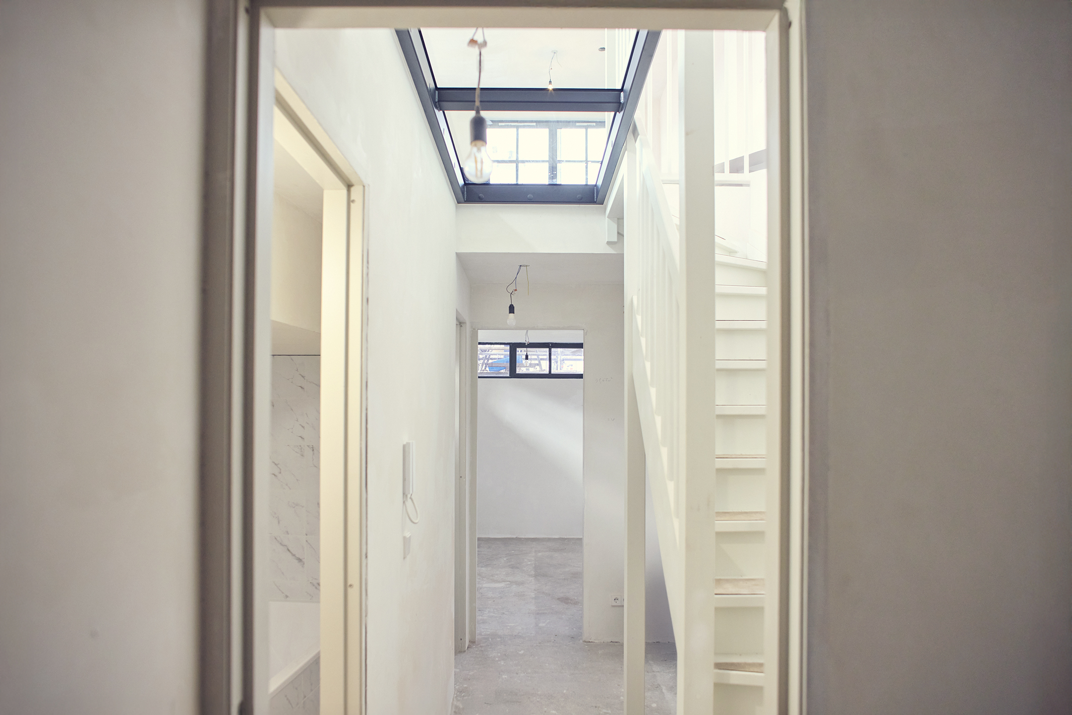 Daglicht komt binnen via koekoeken aan de voorzijde. Daarnaast zorgt het beloopbare glas tussen de begane grond en het souterrain voor extra lichttoetreding en een bijzondere visuele verbinding tussen de woonlagen.