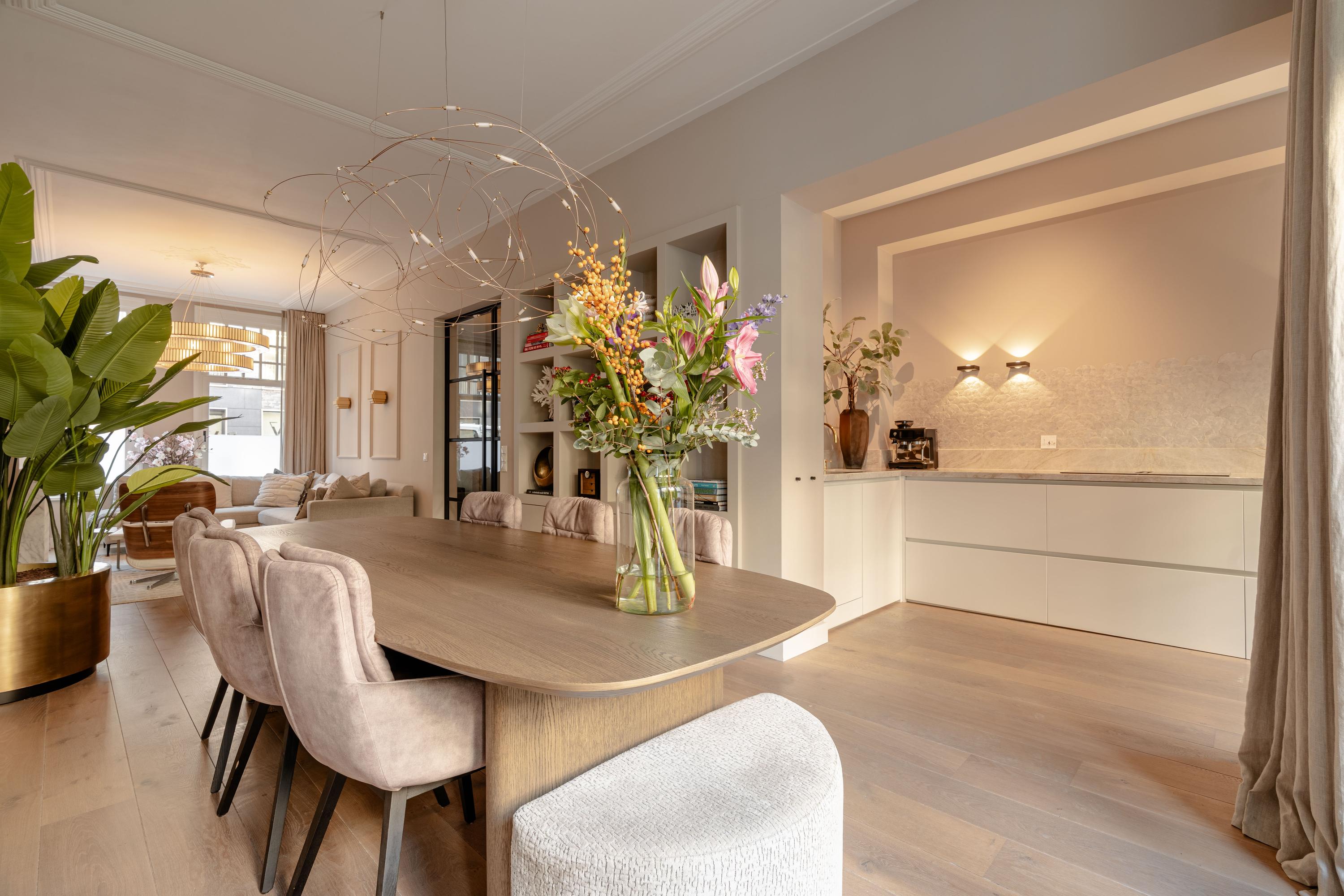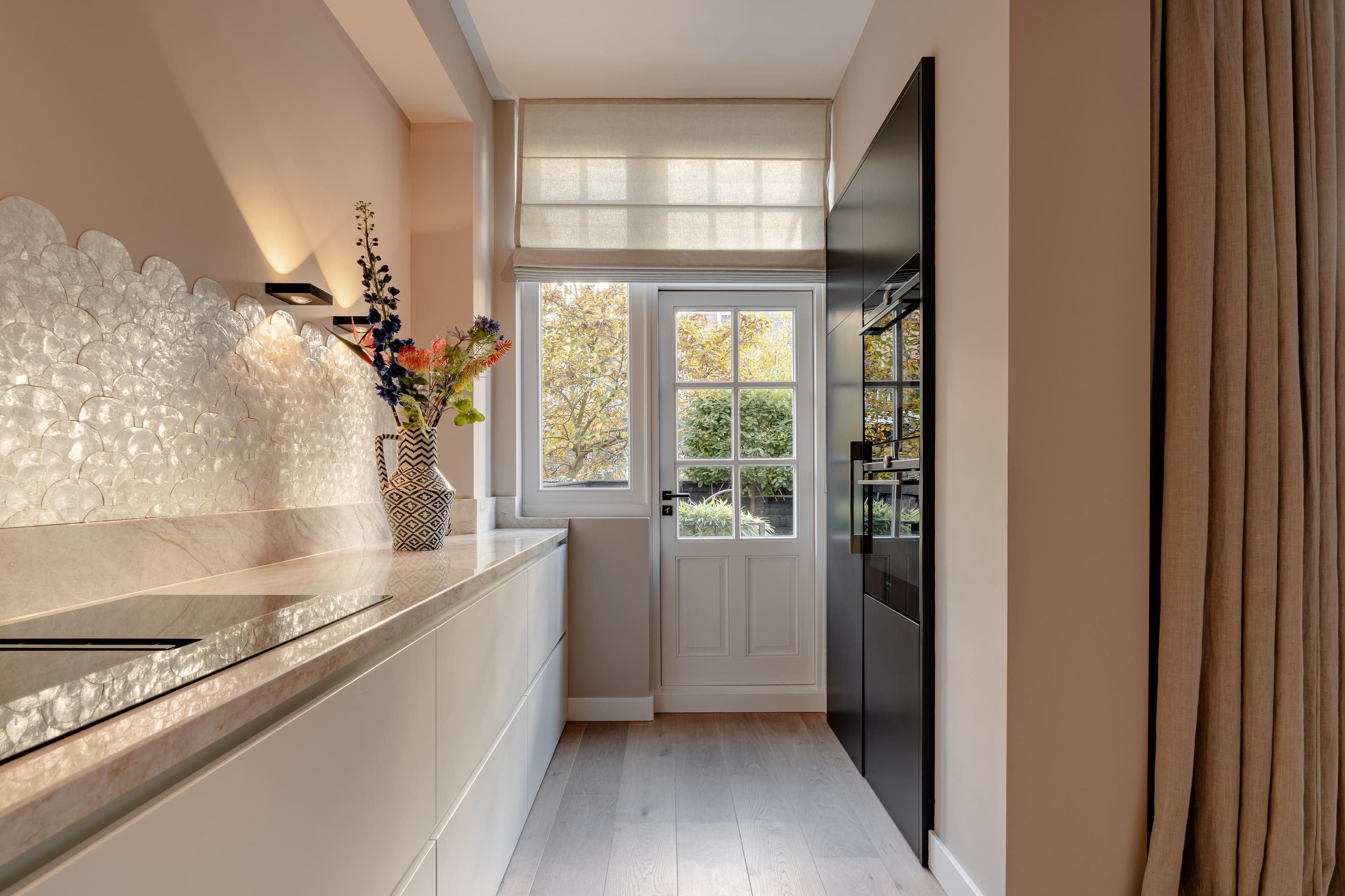 Middels de eigen entree bereikt u het tochtportaal en de hal, welke toegang biedt tot de vertrekken op de begane grond. Hier bevindt zich een separaat toilet met fontein en een praktische bergkast met toegang naar de kelder, bestaande uit twee goed bruikbare ruimtes, ideaal als opslag, hobbyruimte of wijnkelder. De royale woonkamer strekt zich uit over de volledige lengte van de woning en wordt betreden middels een stijlvolle stalen look deure. Dankzij het hoge plafond en grote raampartijen is de living bijzonder licht, met aan de voorzijde ruimte voor een comfortabele zithoek met gashaard en aan de achterzijde plek voor een ruime eettafel. De moderne keuken is gelegen aan de achterzijde en is uitgerust met een inductiekookplaat met ingebouwde afzuiging, ijskast, vriezer, oven, combi-oven, vaatwasser en een spoelbak met Quooker-kraan. Zowel vanuit de keuken als vanuit de eetkamer bereikt u middels openslaande deuren het terras. Vanaf het terras leidt een trap naar de royale achtertuin: een heerlijke plek met volop ruimte voor loungesets, een eettafel en een veilige speelplek voor kinderen.