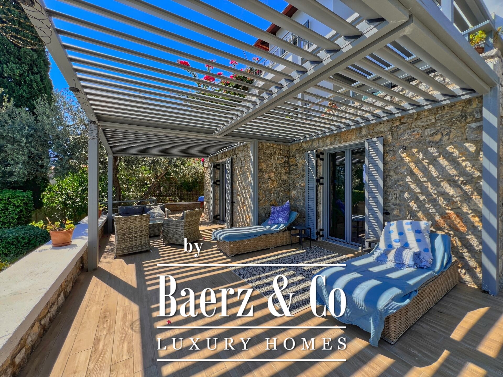 Verspreid over drie verdiepingen combineert de architectuur traditioneel metselwerk met moderne lijnen en panoramisch uitzicht op zee en bergen. De begane grond herbergt een zelfstandig appartement met drie slaapkamers, een woonruimte, keuken en twee toiletten, waarbij elk vertrek directe toegang tot de weelderige tuin heeft. Het middelste niveau omvat een lichte woon- en eetkamer, hoofdkeuken, toilet en toegang tot de bovenliggende slaapkamers. Op de eerste verdieping bevinden zich nog twee slaapkamers en een ruime badkamer, alle voorzien van veranda’s die uitnodigen tot het genieten van het vrije uitzicht en het natuurlijke licht.