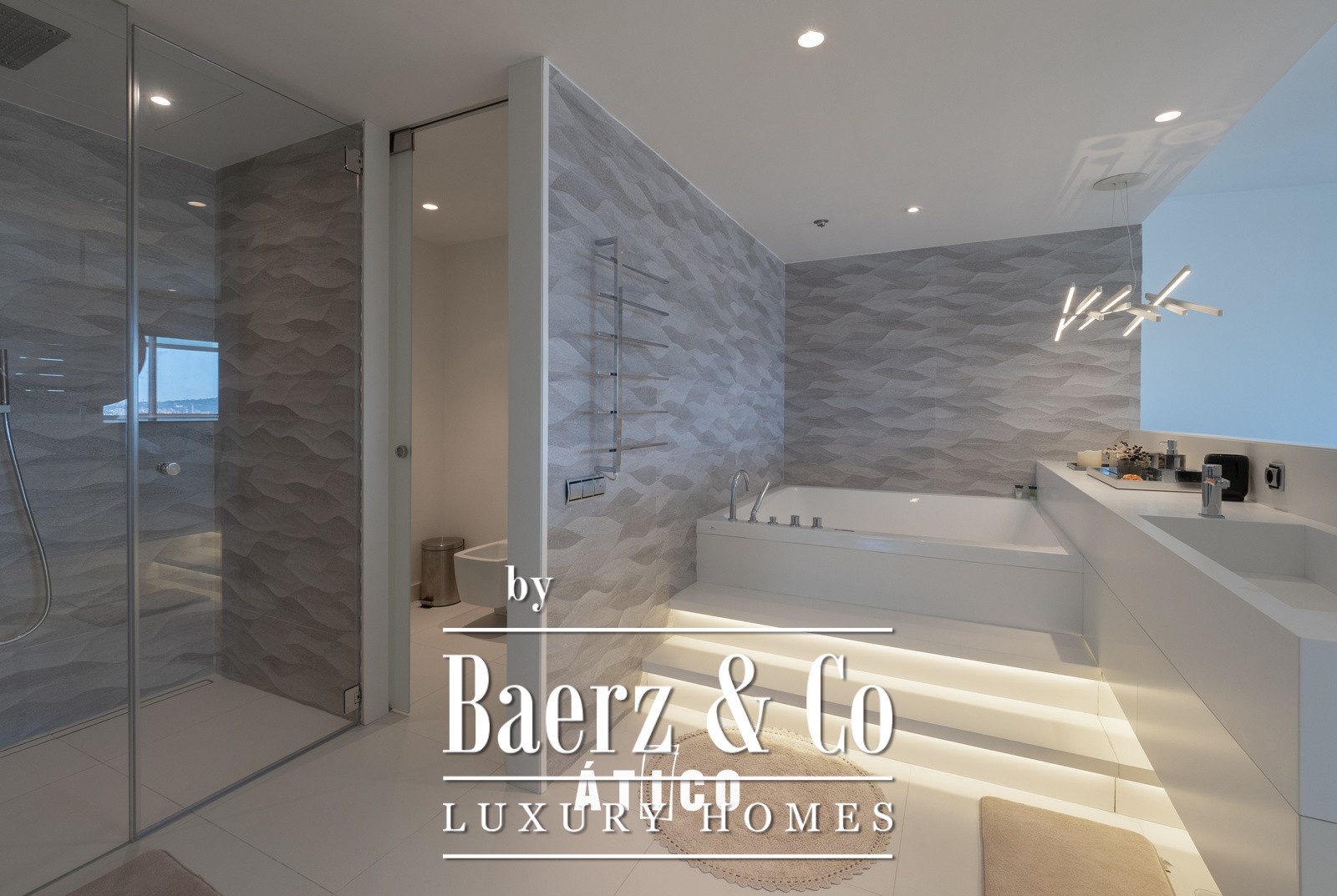 De woonkamer baadt in natuurlijk licht door grote ramen en loopt moeiteloos over in een terras dat de woning omringt. Hier nodigt een privézwembad uit tot ontspannen momenten boven de stad, terwijl het zachte geluid van watervallen en de uitzichten op Barcelona voor een kalme vitaliteit zorgen. De geïntegreerde keuken is uitgerust met roestvrij staal en kwarts en combineert eigentijds design met functionaliteit. Ideaal voor een ontspannen diner of sfeervolle ontvangst thuis.