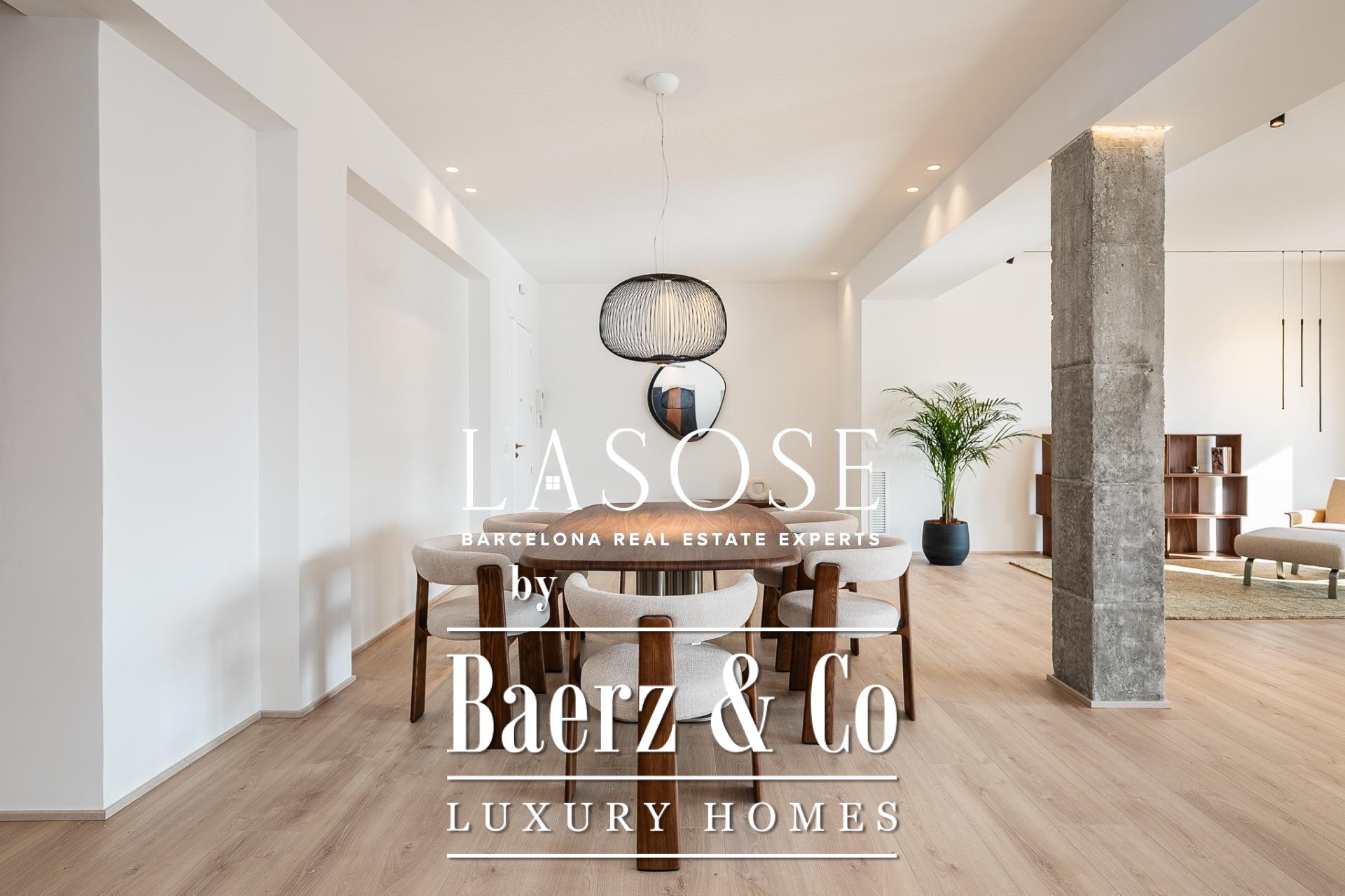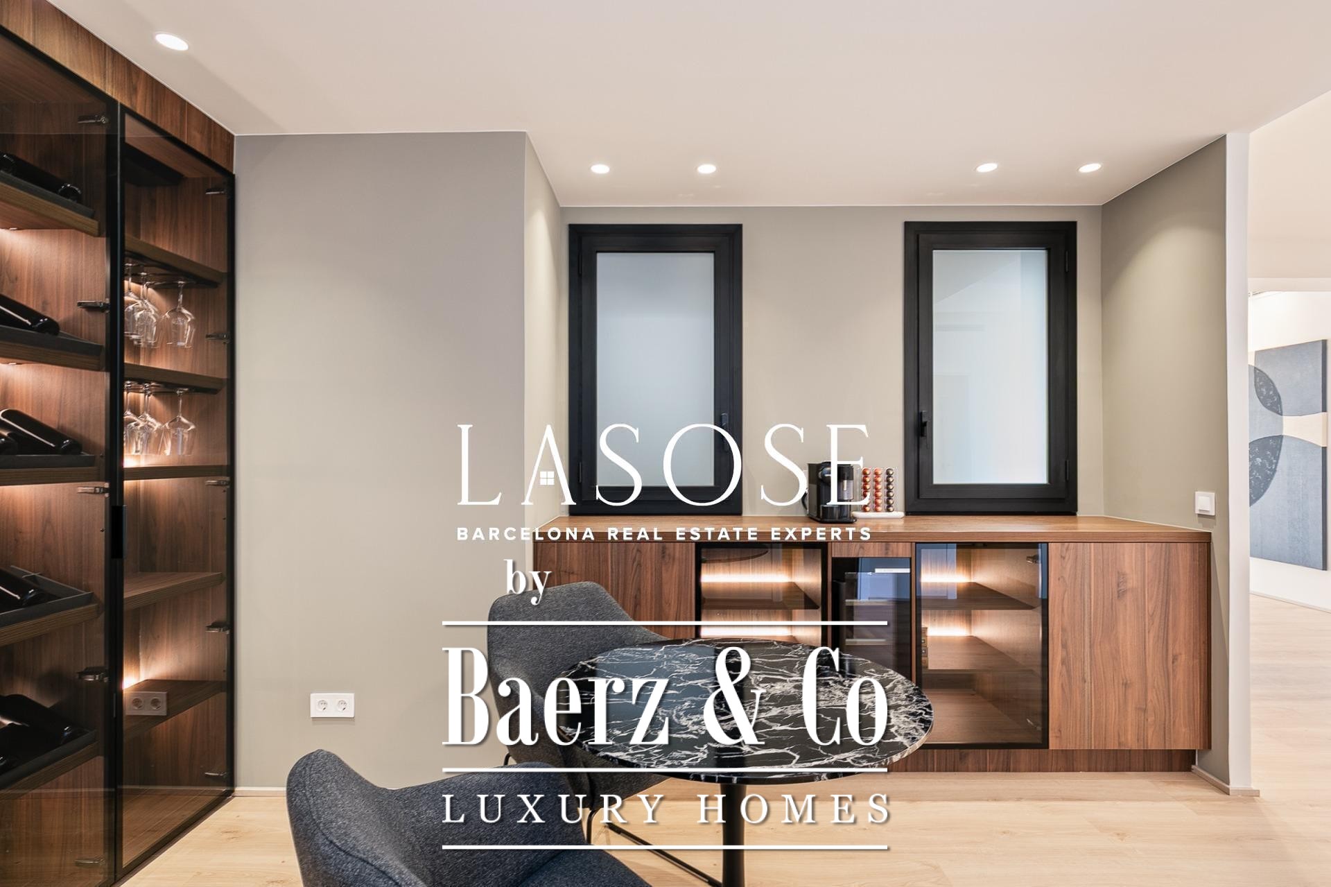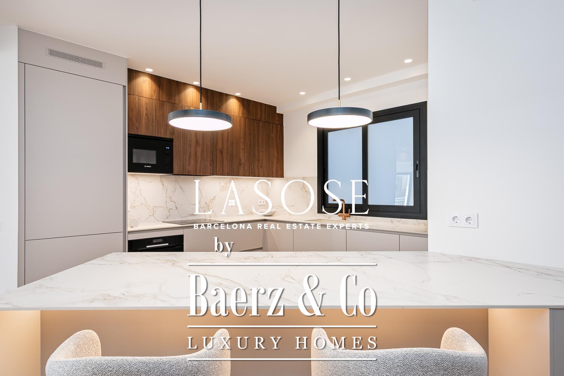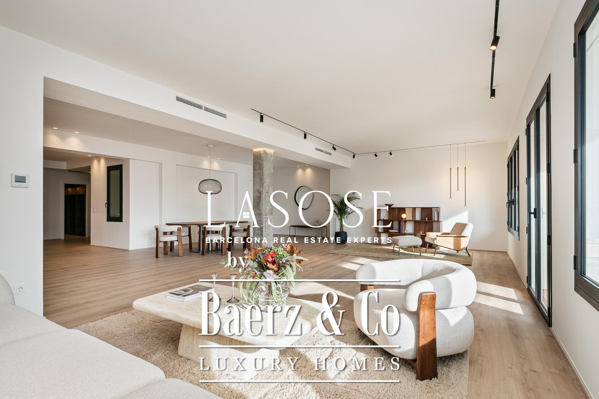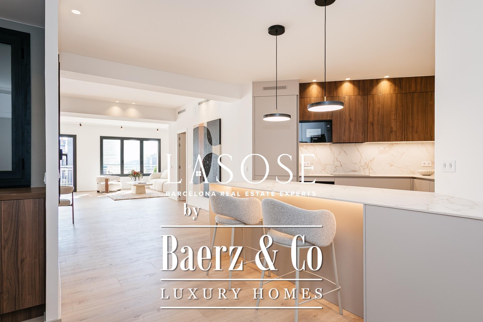 Het appartement is volledig gerenoveerd met hoogwaardige materialen. Dankzij de royale, zuidoostgerichte ramen baadt het interieur in het licht en vormt de open woonkamer met eetgedeelte van 90 m² een uitnodigende leefruimte. Vanuit hier geven deuren toegang tot een panoramisch hoekterras met uitzicht over de met bomen omzoomde boulevards en Plaça Mossèn Jacint Verdaguer. De keuken, van Santos en voorzien van Bosch-apparatuur, is ingericht rond een sociaal kookeiland met geïntegreerde wijnkast en koffienis; aangrenzend bevindt zich een bijkeuken voor discrete opslag.