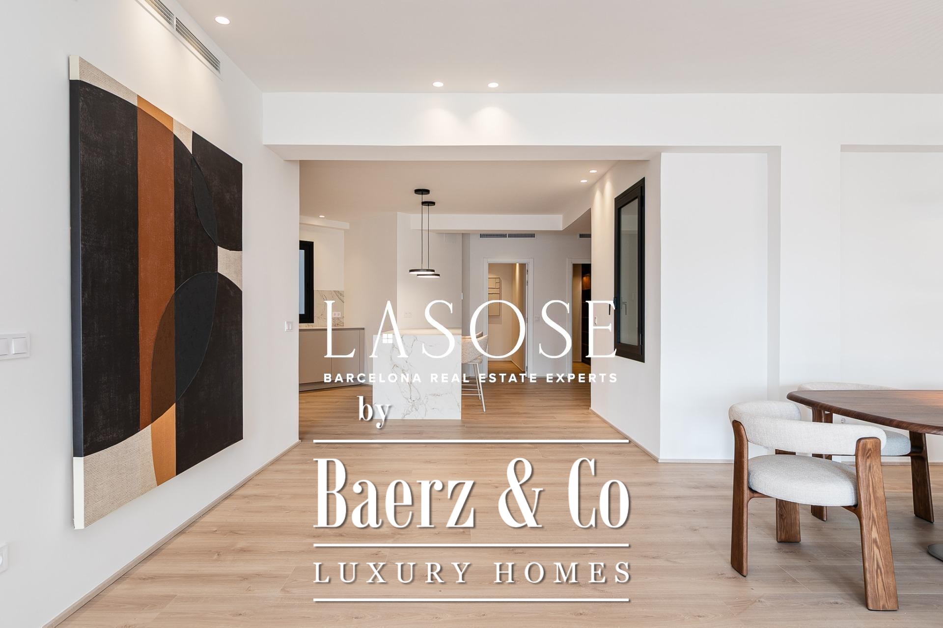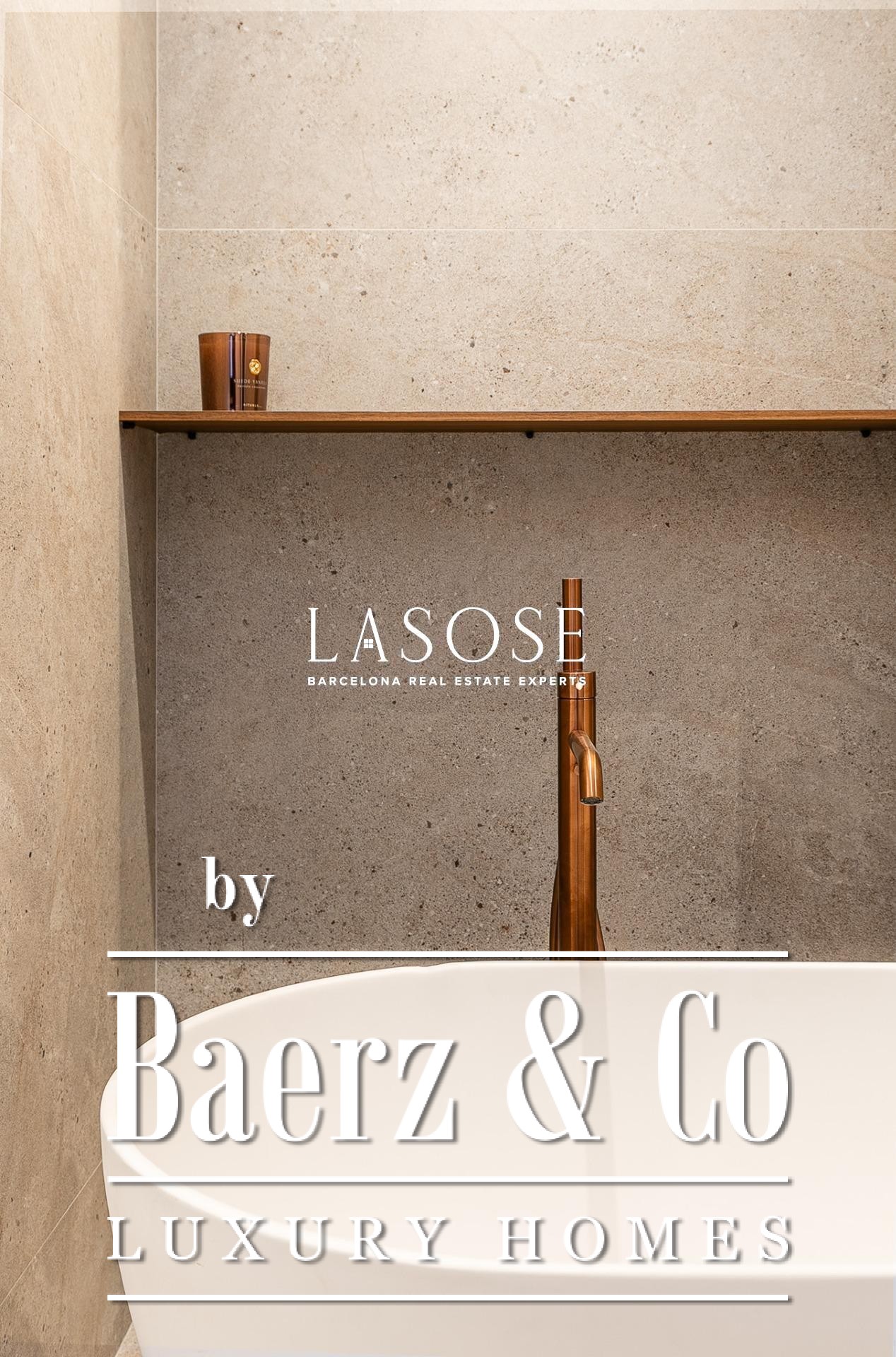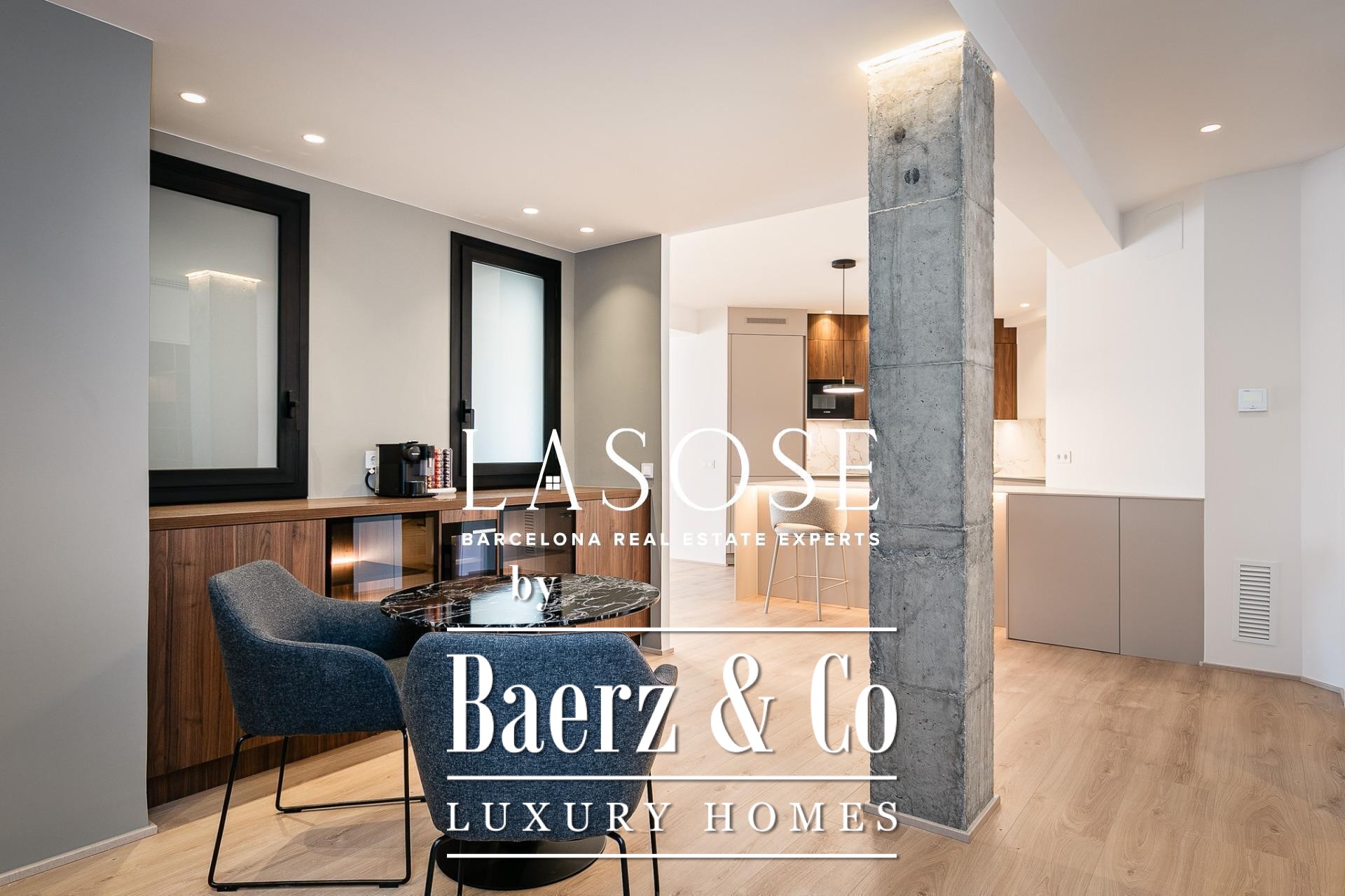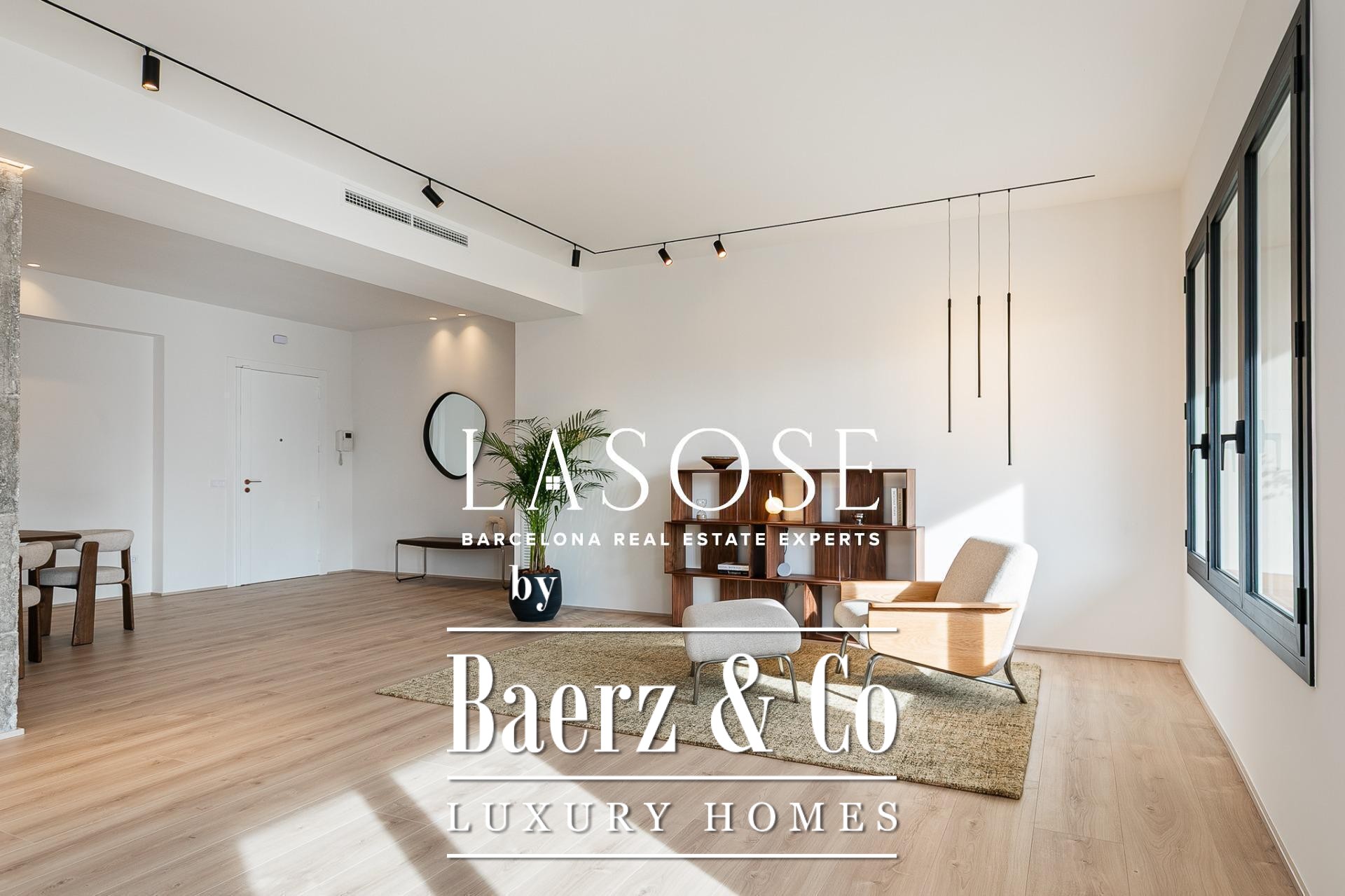 Het appartement is volledig gerenoveerd met hoogwaardige materialen. Dankzij de royale, zuidoostgerichte ramen baadt het interieur in het licht en vormt de open woonkamer met eetgedeelte van 90 m² een uitnodigende leefruimte. Vanuit hier geven deuren toegang tot een panoramisch hoekterras met uitzicht over de met bomen omzoomde boulevards en Plaça Mossèn Jacint Verdaguer. De keuken, van Santos en voorzien van Bosch-apparatuur, is ingericht rond een sociaal kookeiland met geïntegreerde wijnkast en koffienis; aangrenzend bevindt zich een bijkeuken voor discrete opslag.