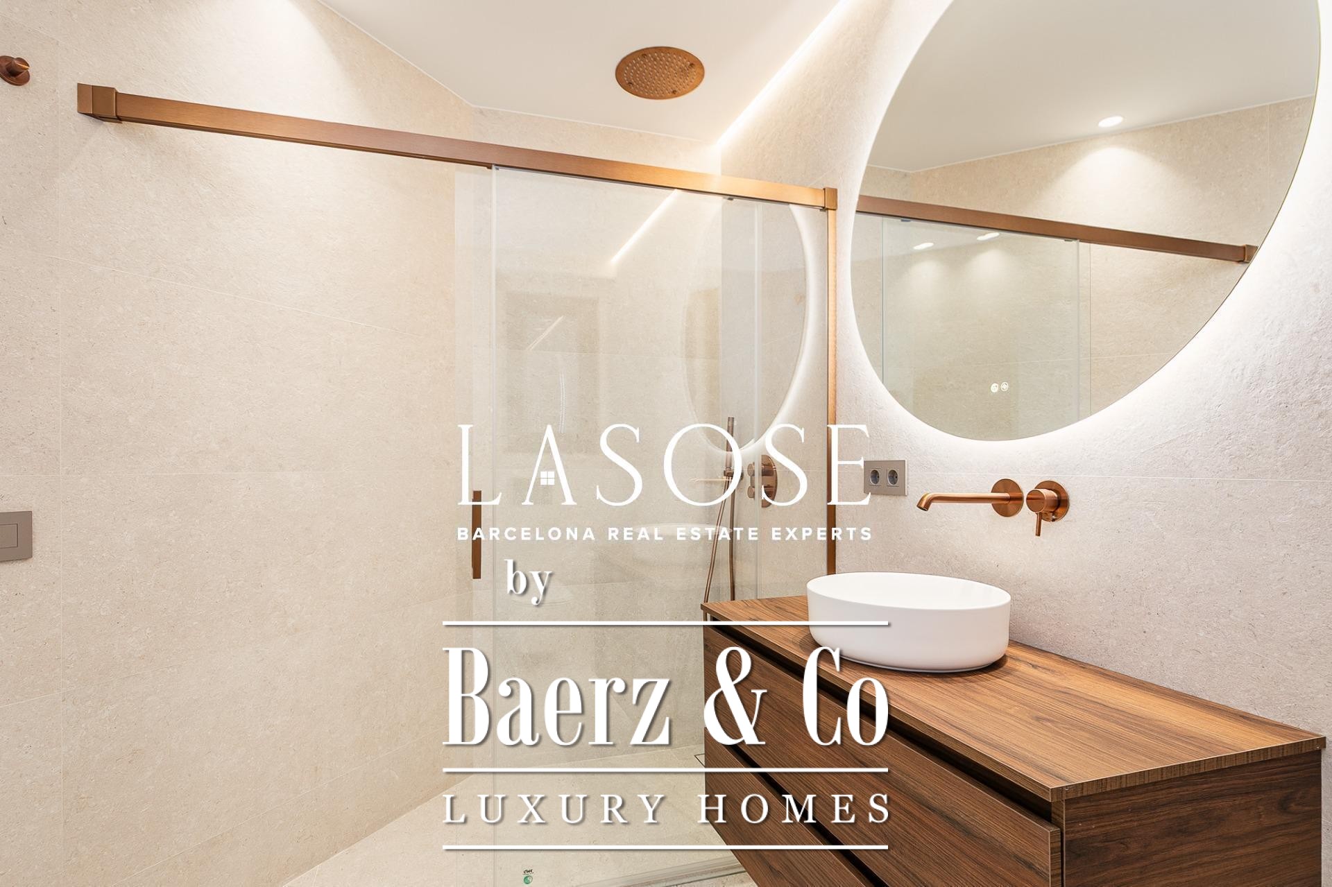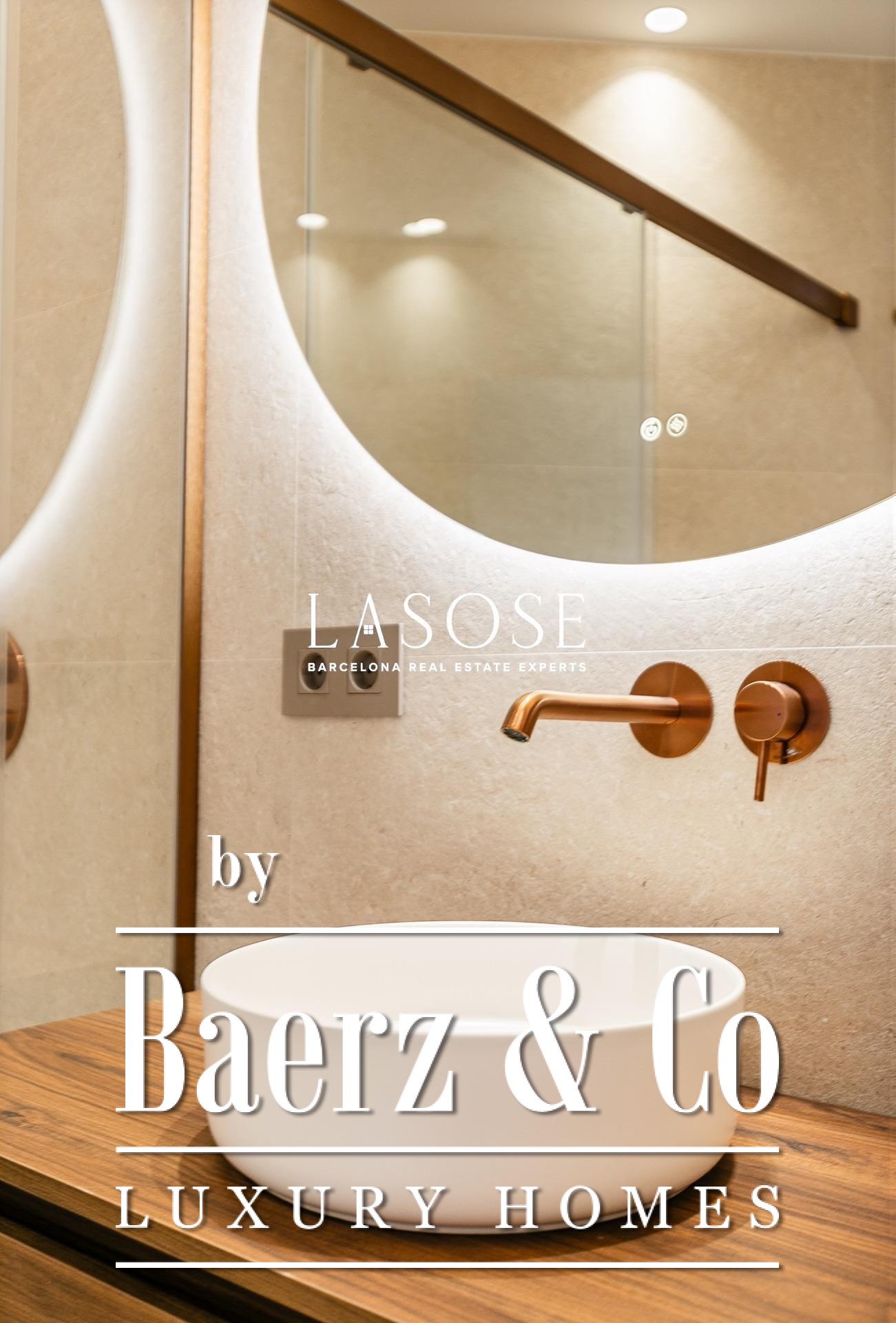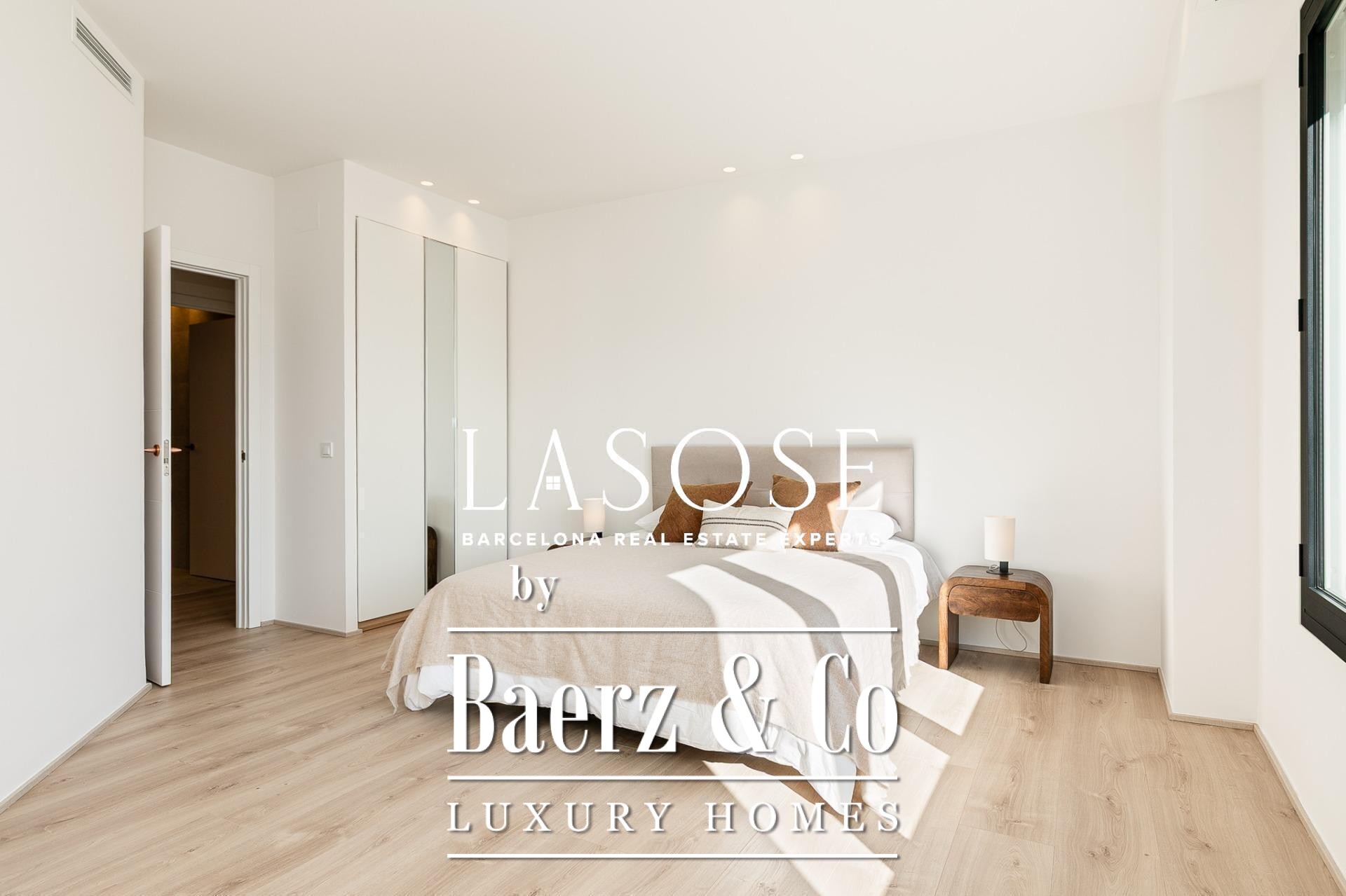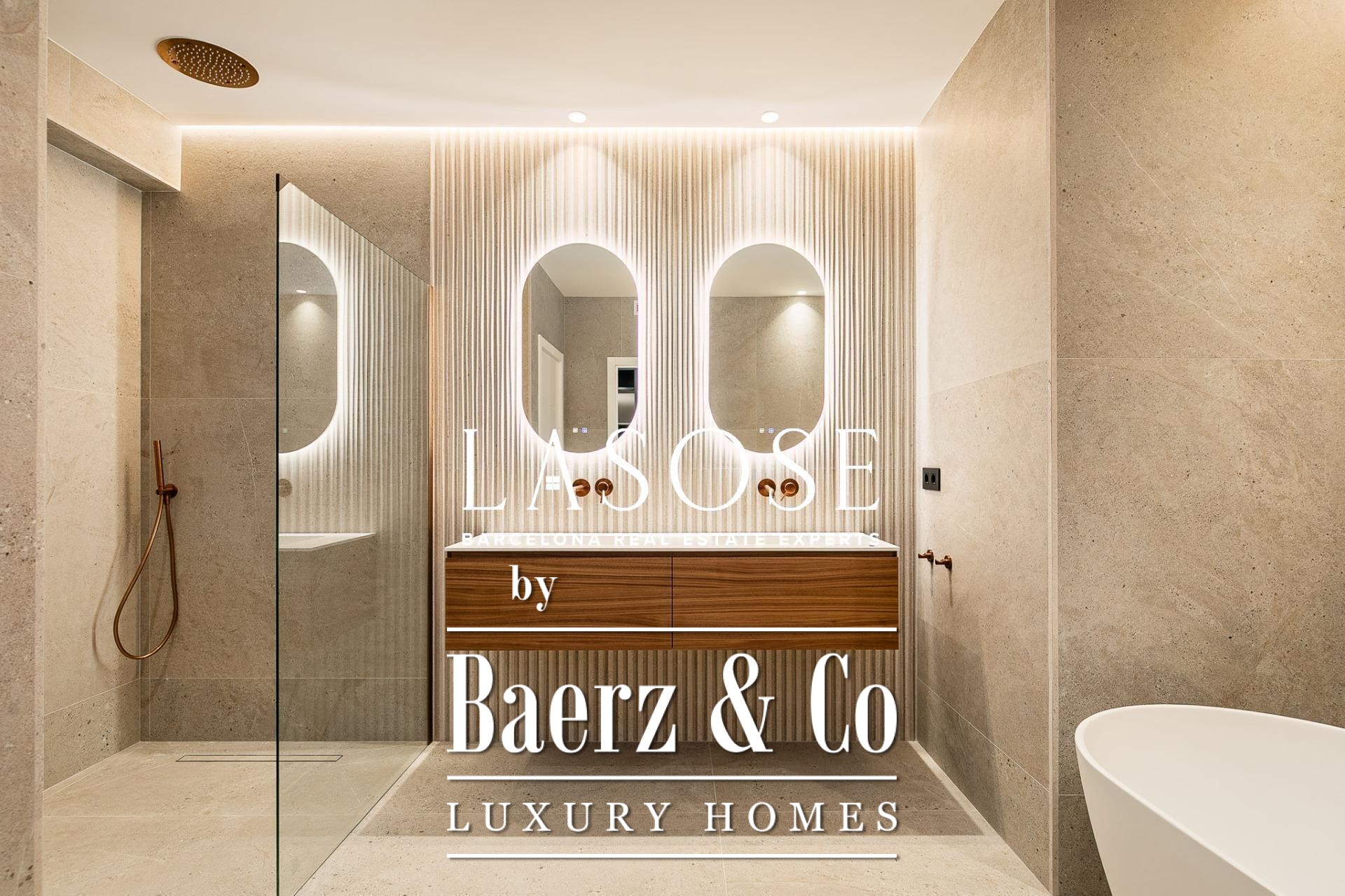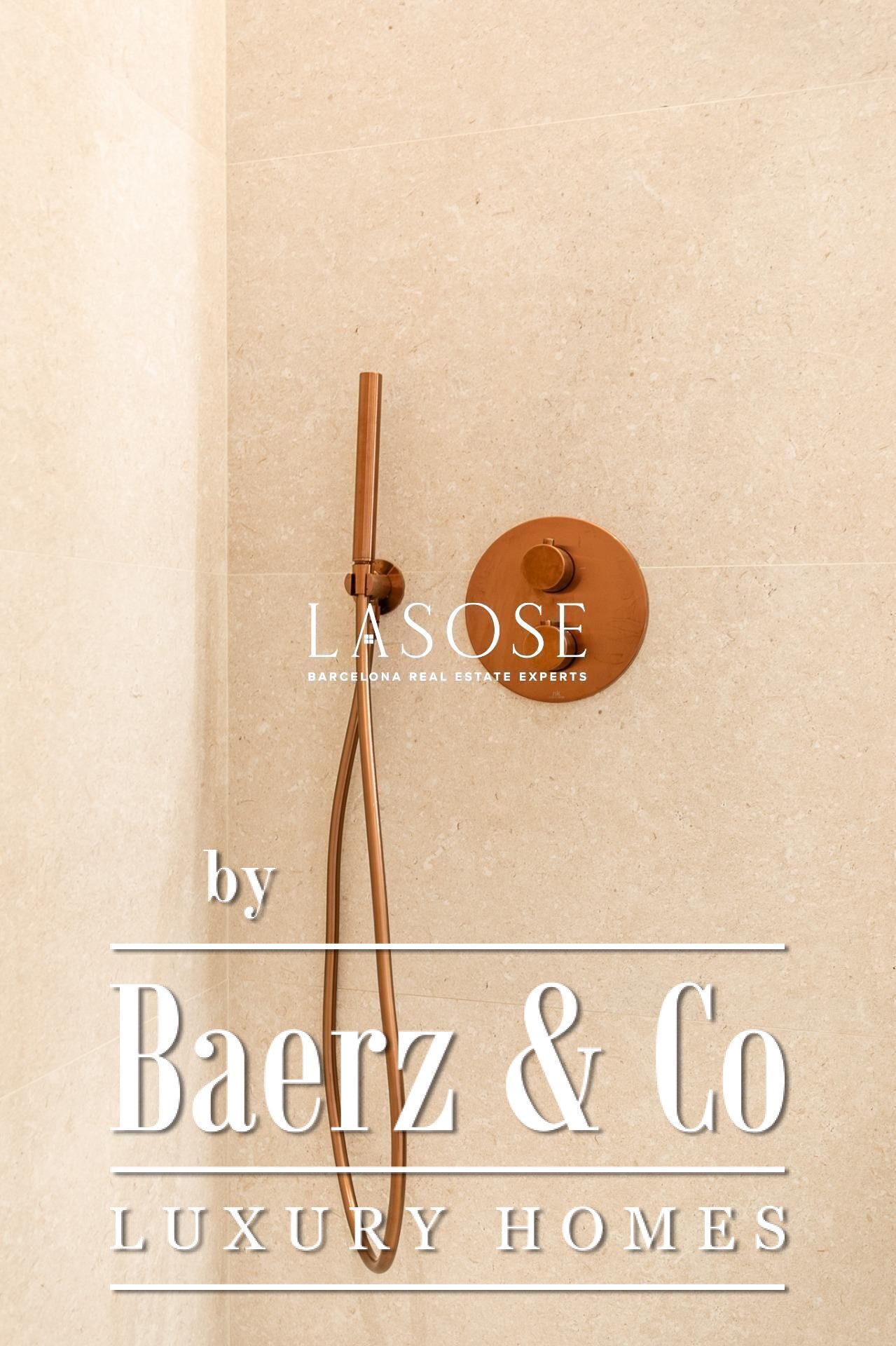 Het appartement is volledig gerenoveerd met hoogwaardige materialen. Dankzij de royale, zuidoostgerichte ramen baadt het interieur in het licht en vormt de open woonkamer met eetgedeelte van 90 m² een uitnodigende leefruimte. Vanuit hier geven deuren toegang tot een panoramisch hoekterras met uitzicht over de met bomen omzoomde boulevards en Plaça Mossèn Jacint Verdaguer. De keuken, van Santos en voorzien van Bosch-apparatuur, is ingericht rond een sociaal kookeiland met geïntegreerde wijnkast en koffienis; aangrenzend bevindt zich een bijkeuken voor discrete opslag.