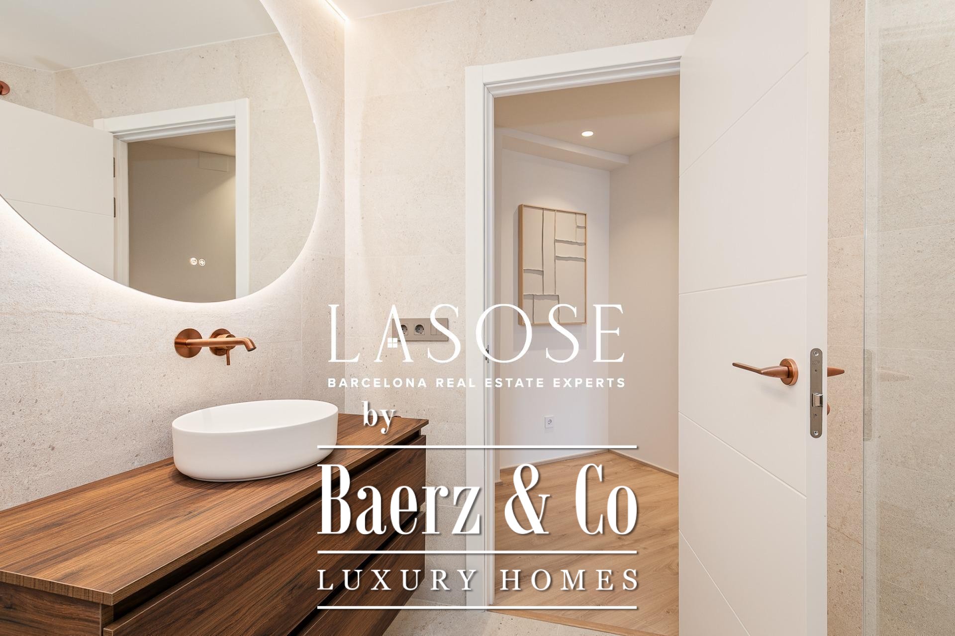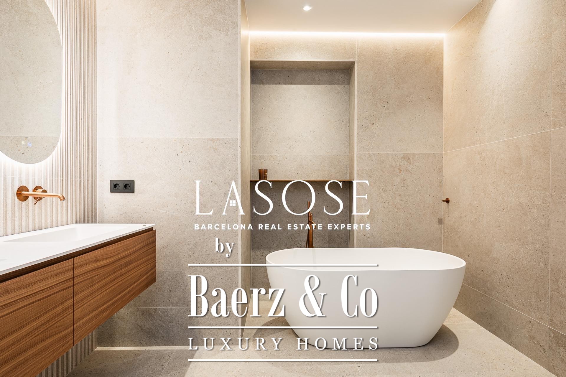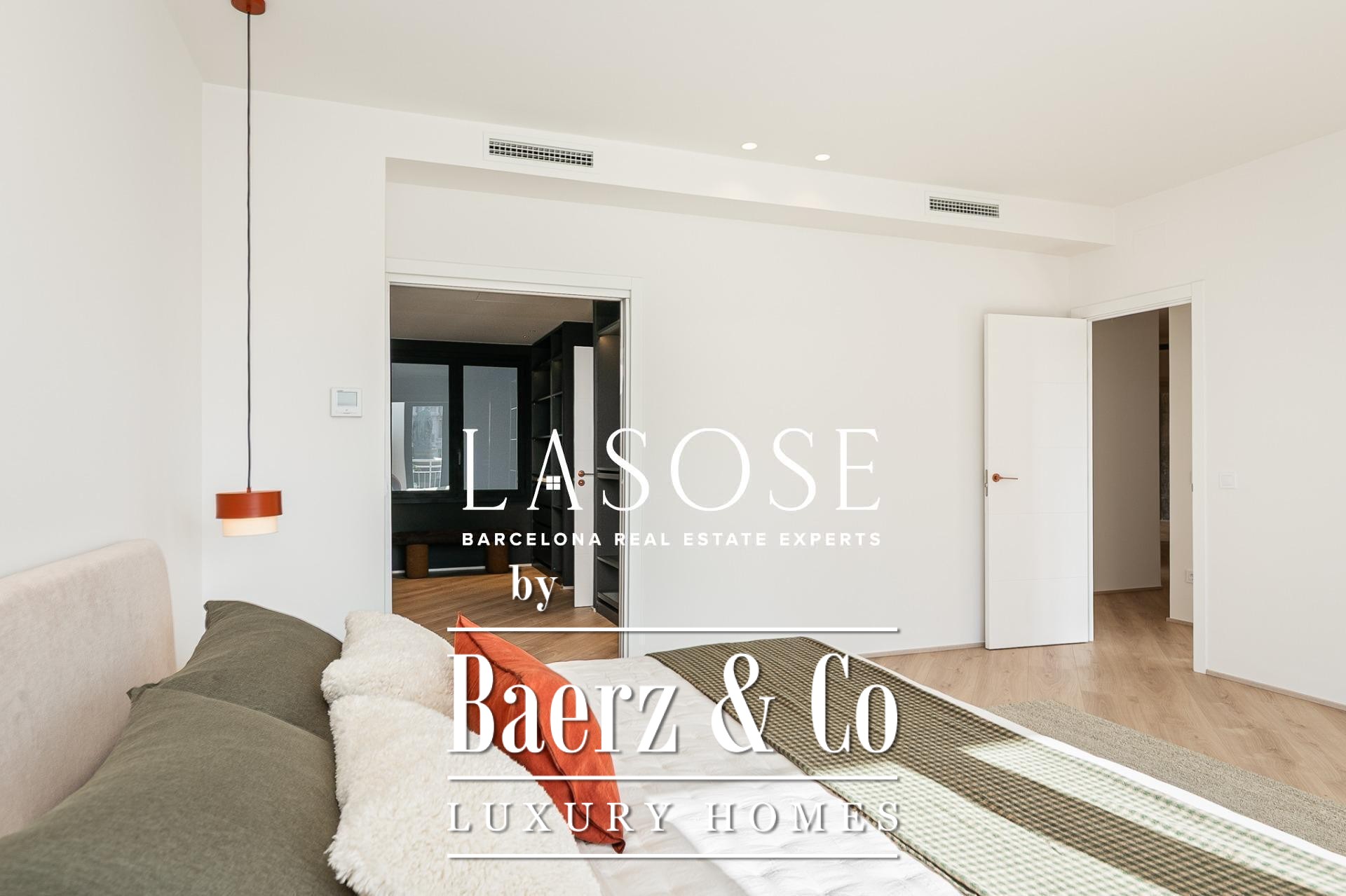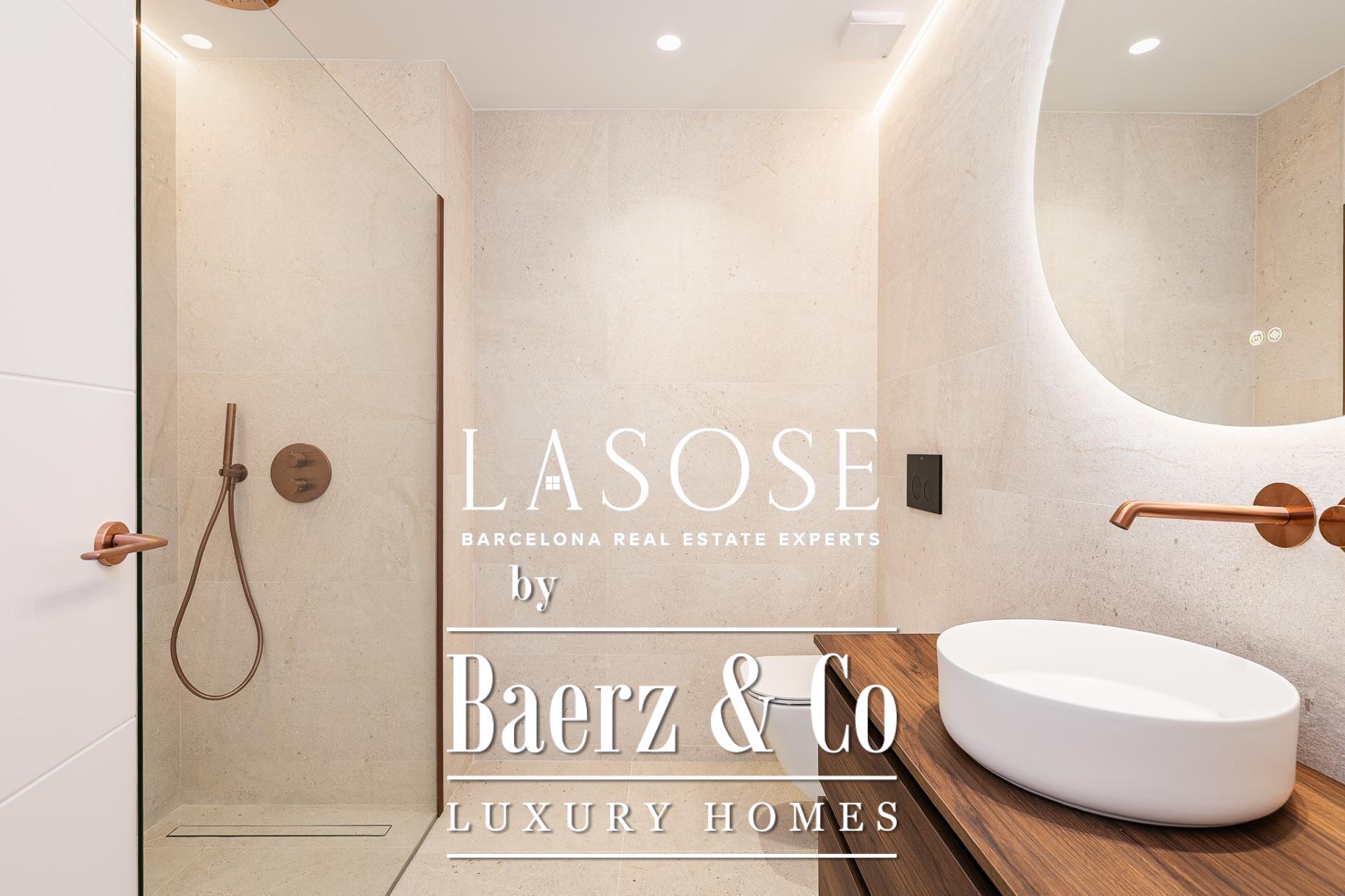 Het appartement is volledig gerenoveerd met hoogwaardige materialen. Dankzij de royale, zuidoostgerichte ramen baadt het interieur in het licht en vormt de open woonkamer met eetgedeelte van 90 m² een uitnodigende leefruimte. Vanuit hier geven deuren toegang tot een panoramisch hoekterras met uitzicht over de met bomen omzoomde boulevards en Plaça Mossèn Jacint Verdaguer. De keuken, van Santos en voorzien van Bosch-apparatuur, is ingericht rond een sociaal kookeiland met geïntegreerde wijnkast en koffienis; aangrenzend bevindt zich een bijkeuken voor discrete opslag.