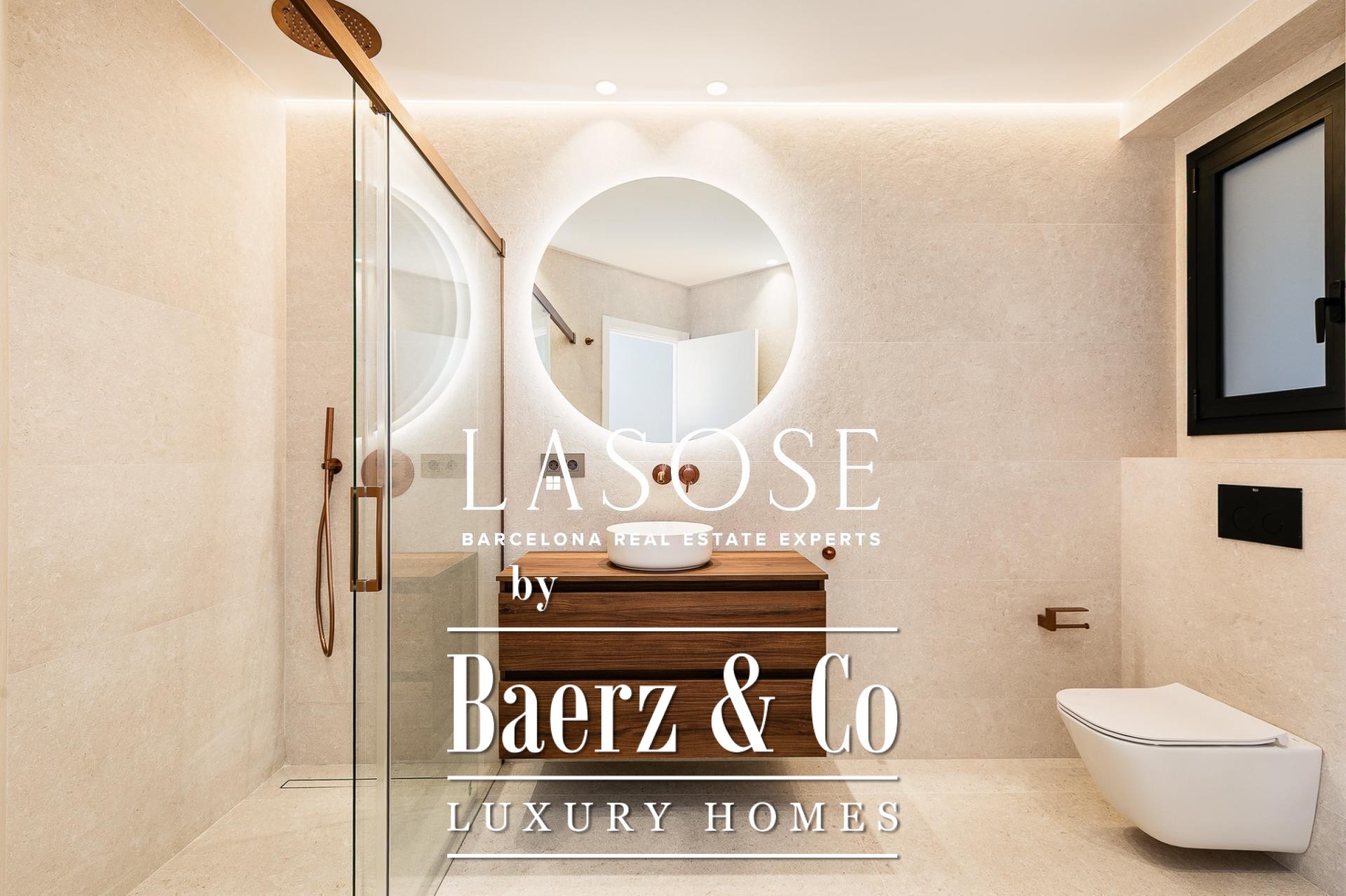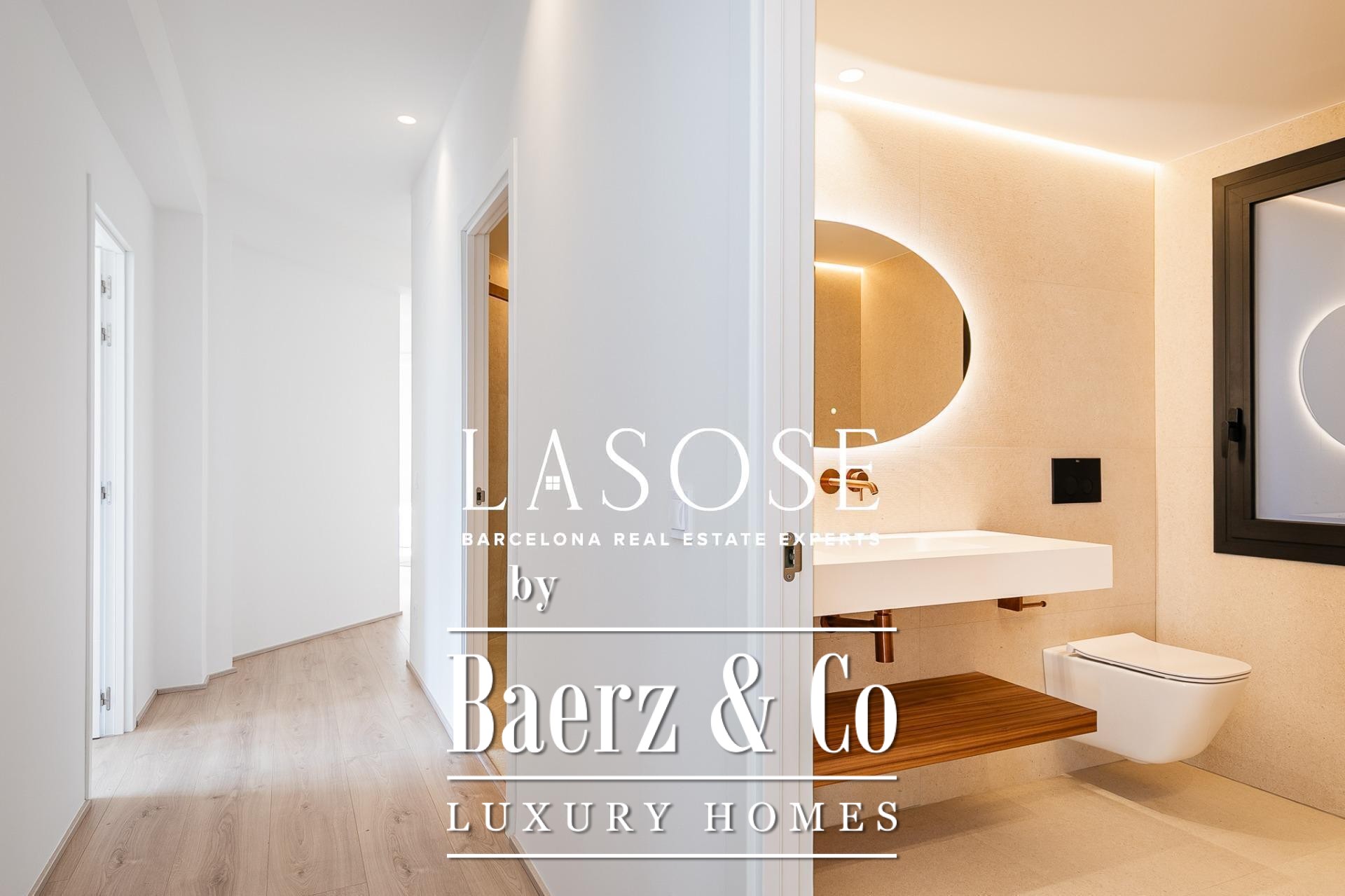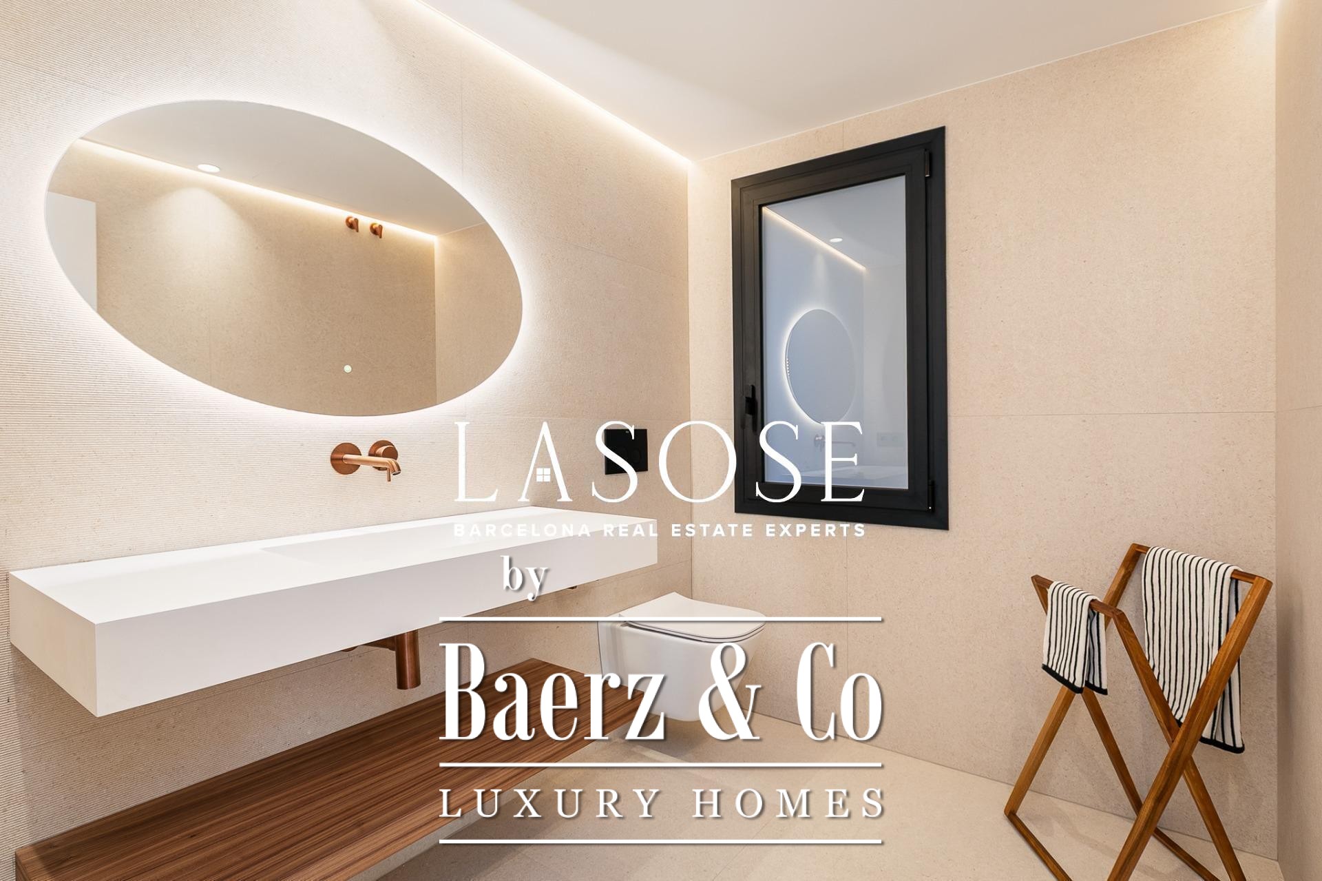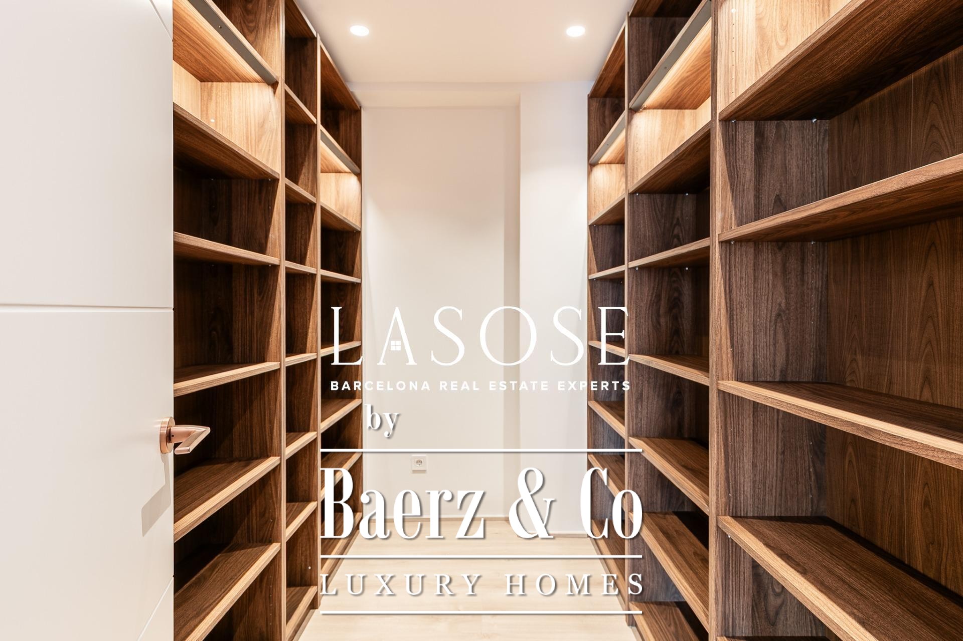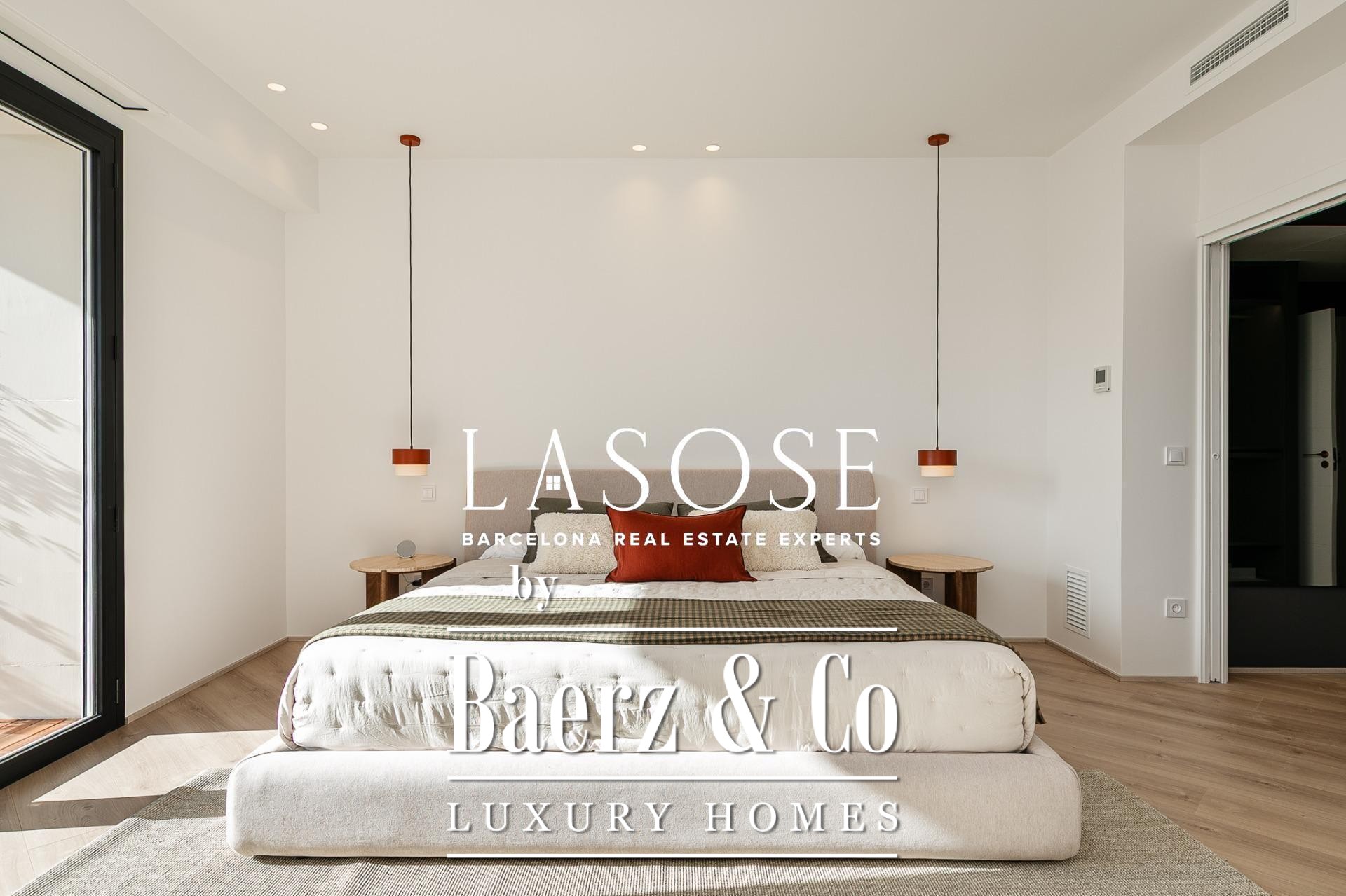 Het appartement is volledig gerenoveerd met hoogwaardige materialen. Dankzij de royale, zuidoostgerichte ramen baadt het interieur in het licht en vormt de open woonkamer met eetgedeelte van 90 m² een uitnodigende leefruimte. Vanuit hier geven deuren toegang tot een panoramisch hoekterras met uitzicht over de met bomen omzoomde boulevards en Plaça Mossèn Jacint Verdaguer. De keuken, van Santos en voorzien van Bosch-apparatuur, is ingericht rond een sociaal kookeiland met geïntegreerde wijnkast en koffienis; aangrenzend bevindt zich een bijkeuken voor discrete opslag.