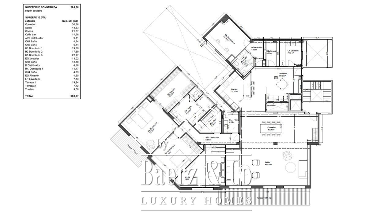 Het slaapgedeelte bestaat uit vier tweepersoonsslaapkamers. De master suite beschikt over een privéterras, een inloopkast en een en-suite badkamer met vrijstaand bad. Een tweede slaapkamer met eigen badkamer biedt comfort voor gasten, terwijl Porcelanosa natuursteen en Noken kranen alle badkamers een verfijnde afwerking geven. Verder beschikt de woning over een berging, wasruimte, servicegedeelte en geavanceerde domotica: volledige huisautomatisering, Mitsubishi klimaatsysteem per zone, aerothermische verwarming en dubbele beglazing.