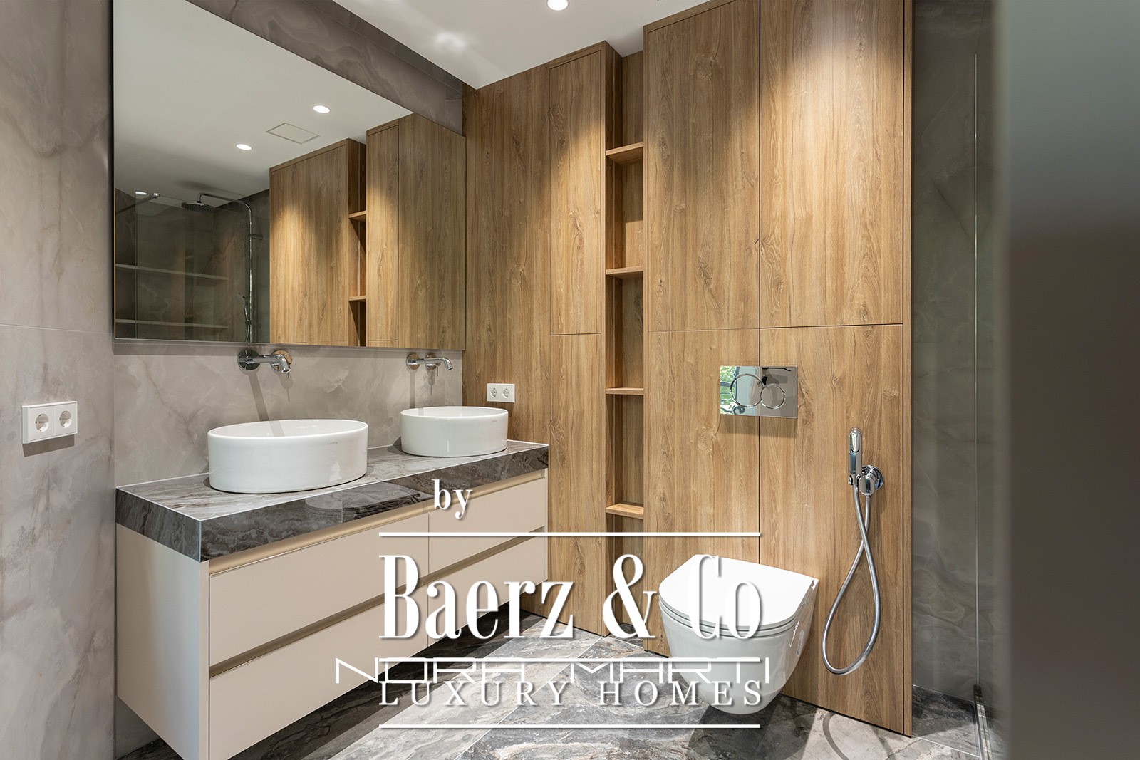 Een royale open woon-, eet- en keukenruimte van circa 51 m² vormt het middelpunt van het appartement en loopt moeiteloos over in een van de twee terrassen, samen goed voor circa 12 m². De keuken is zowel functioneel als elegant, voorzien van Bosch-apparatuur en op maat gemaakte kasten en opbergruimte. Drie dubbele slaapkamers vormen rustige, privé toevluchtsoorden, waaronder een master suite met kleedruimte, eigen badkamer en directe toegang tot het terras. Twee aanvullende dubbele slaapkamers delen een complete badkamer, aangevuld met een discrete gastentoilet.