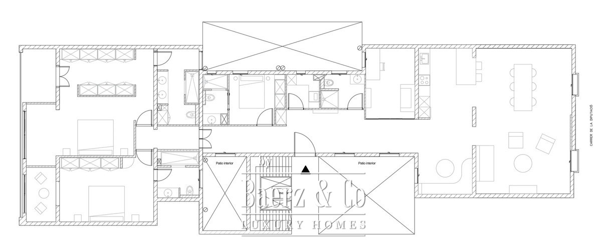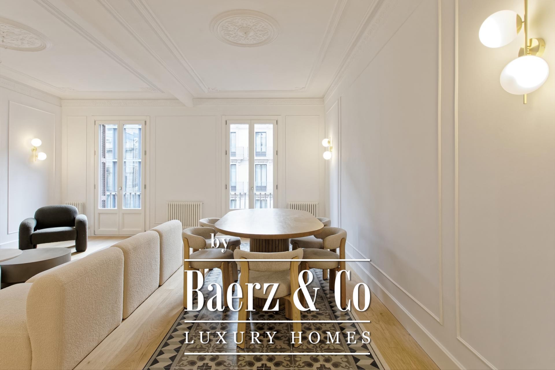 De woon- en eetruimtes zijn ingericht voor zowel geborgen comfort als rustige gastvrijheid en sluiten aan op een volledig uitgeruste keuken en een aparte wasruimte. Dit zorgvuldig gerenoveerde appartement behoudt authentieke elementen, introduceert moderne afwerkingen en biedt toegang via een lift, waardoor het geheel een sfeer uitstraalt van ingetogen, historisch wonen in Barcelona.