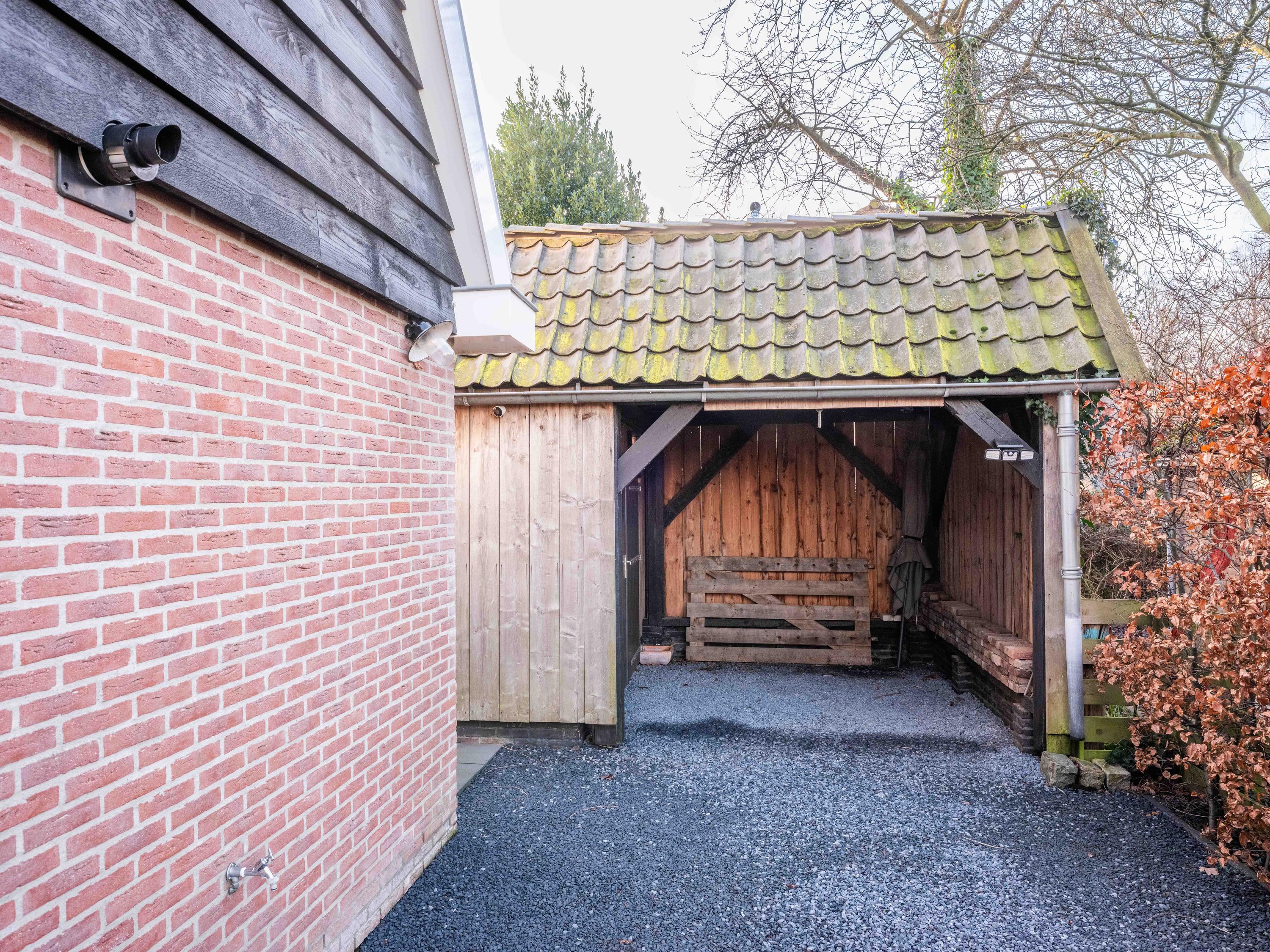 Rondom de woning ligt een prachtig aangelegde tuin met natuurlijke erfafscheiding, die volop privacy biedt. Het totale perceel meet officieel 537 m2. Aan de voorzijde bevindt zich een ruim oprijpad met parkeergelegenheid voor meerdere auto’s. Een vrijstaande berging is voorzien van een overdekte carport. De tuin grenst aan een gemeentelijk plantsoen – een ligging die een uniek gevoel van ruimte en vrijheid geeft, terwijl het centrum van Bergen slechts een paar minuten verderop ligt.