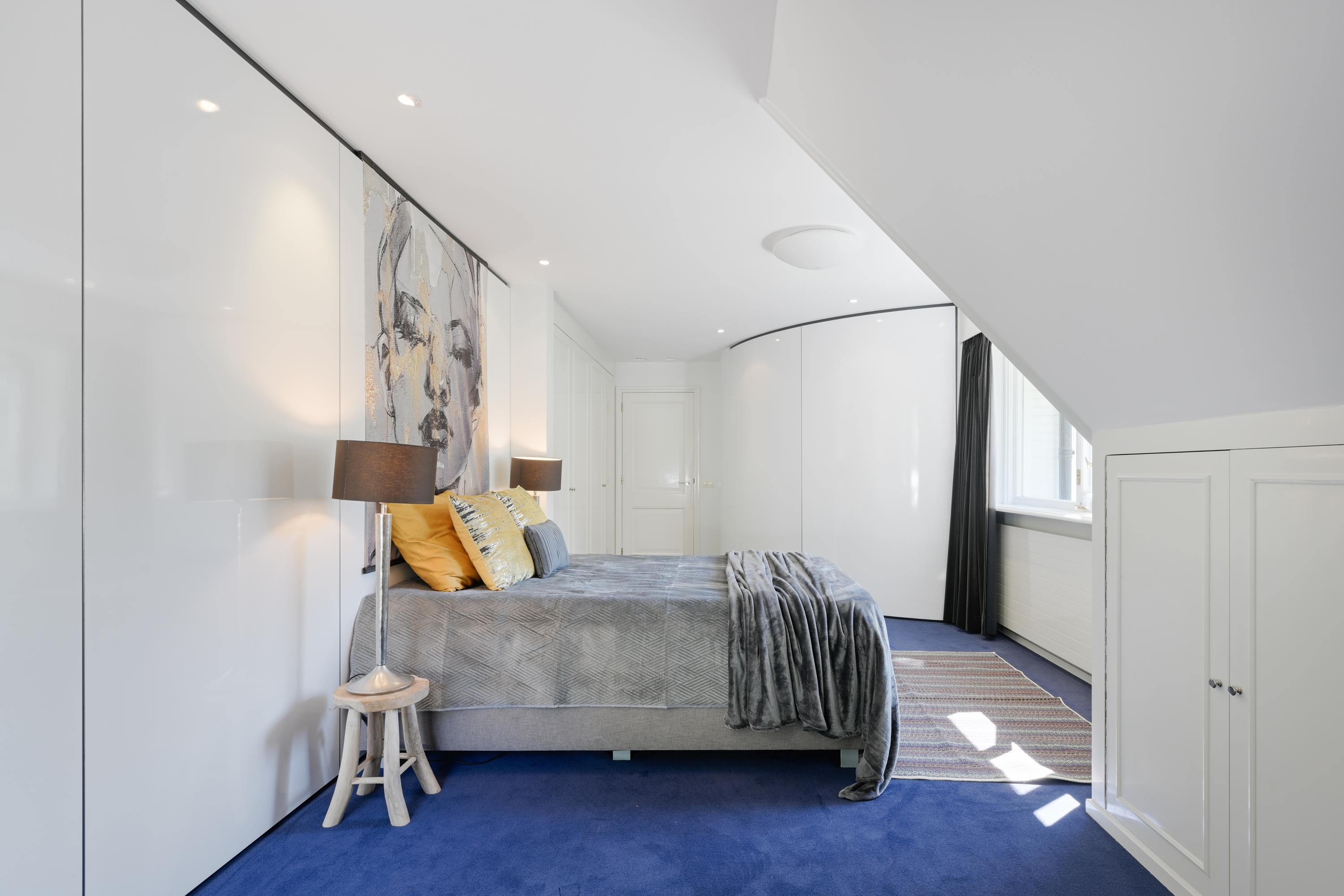 Hal met bordestrap en lift, werkkamer met ronde erker met prachtig uitzicht, ruime slaapkamer met toegang tot balkon, tweede grote (ouder-)slaapkamer met beschut balkon met fraai uitzicht over de tuin, gang naar kleedkamer en eigen badkamer met ligbad, douche, dubbele wastafel in meubel, urinoir en toilet, vloerverwarming. Derde slaapkamer en vierde slaapkamer beide met dakkapel en beide met toegang naar badkamer met bad, douche, toilet, urinoir, wastafelmeubel en vloerverwarming.