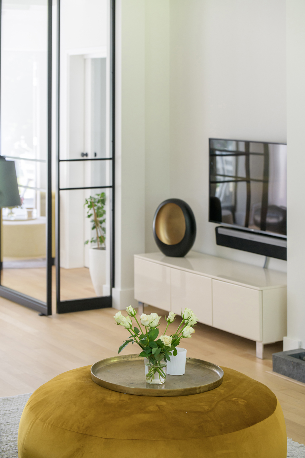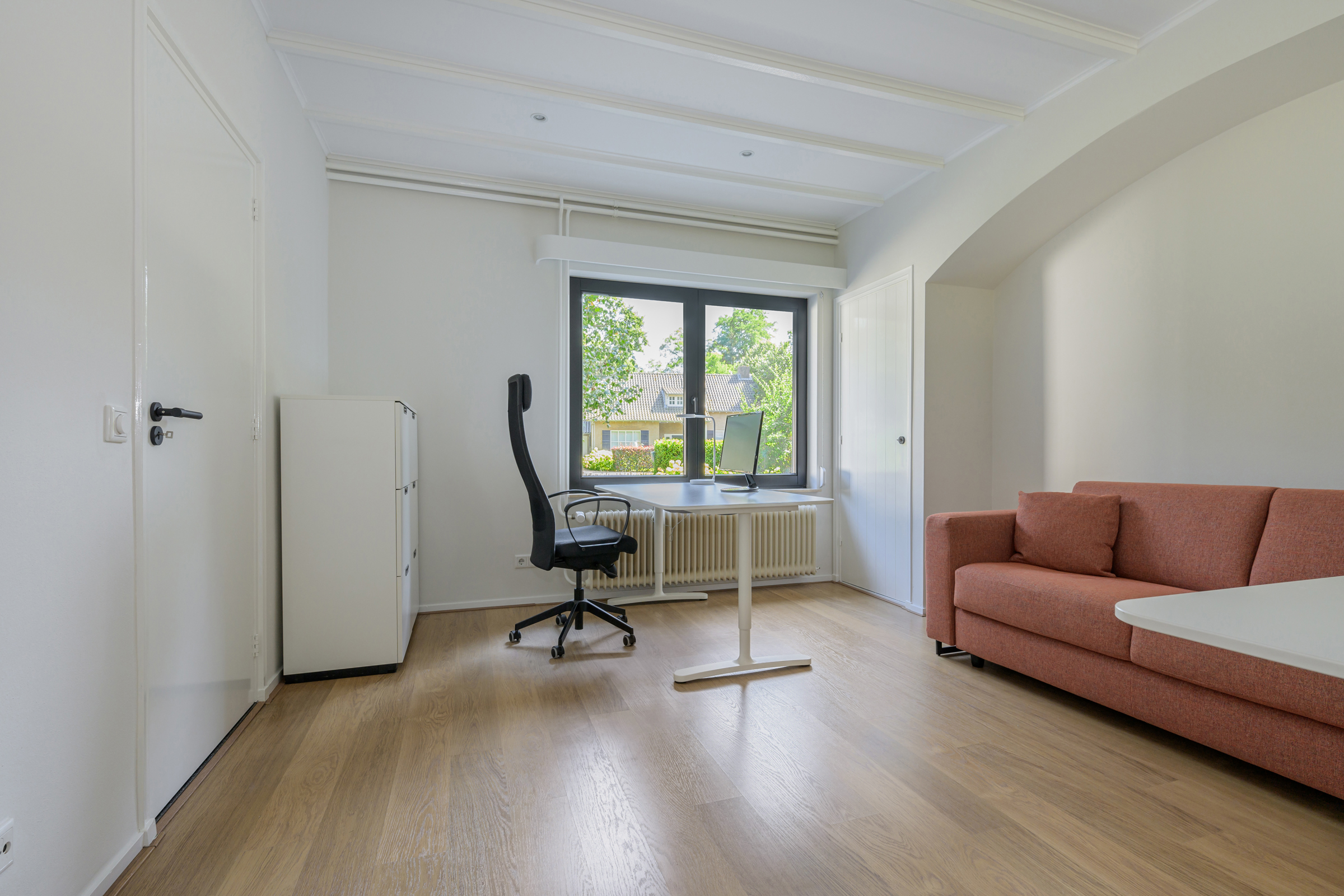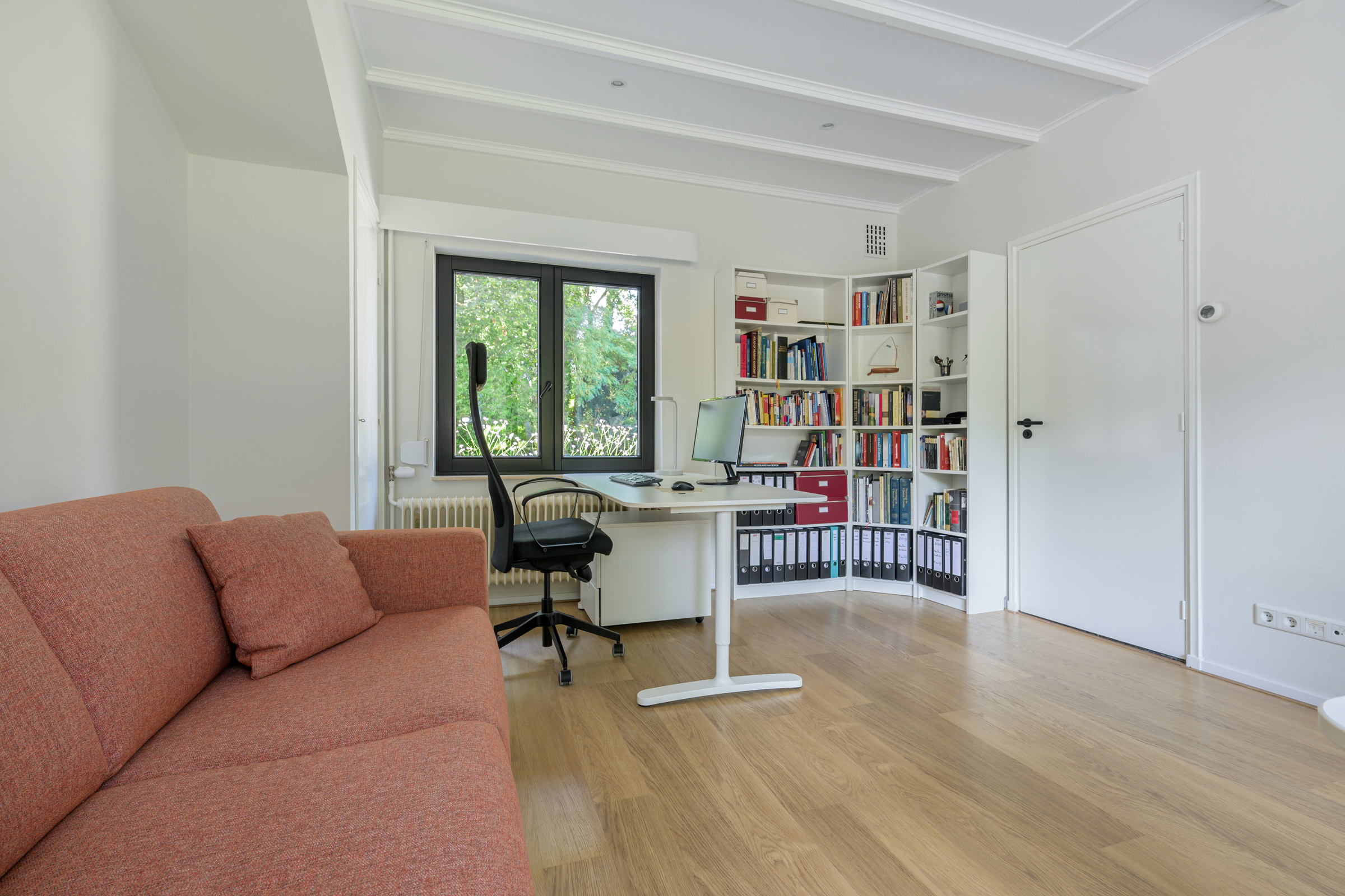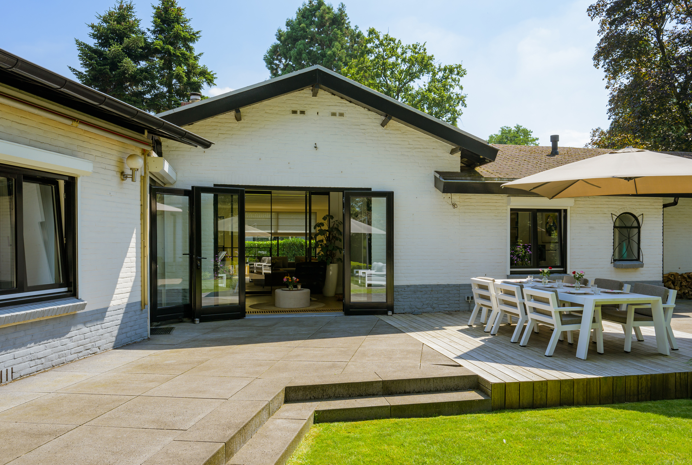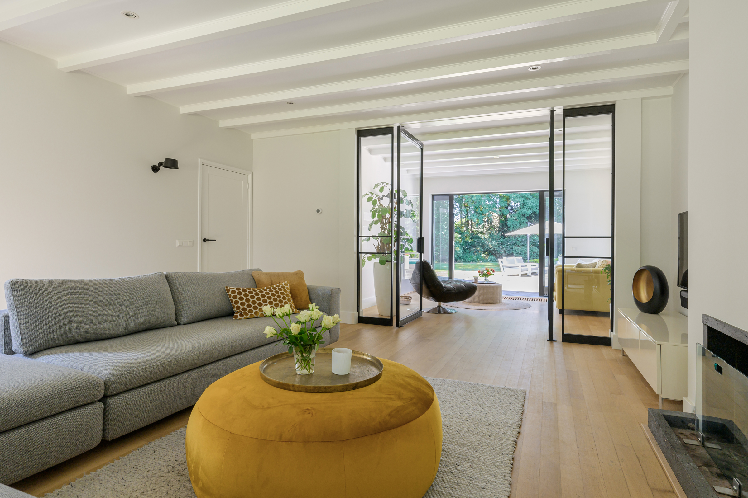 De stalen deuren geven toegang tot de aparte zitkamer, grenzend aan de achtertuin. Twee openslaande deuren geven toegang tot de achtertuin.
