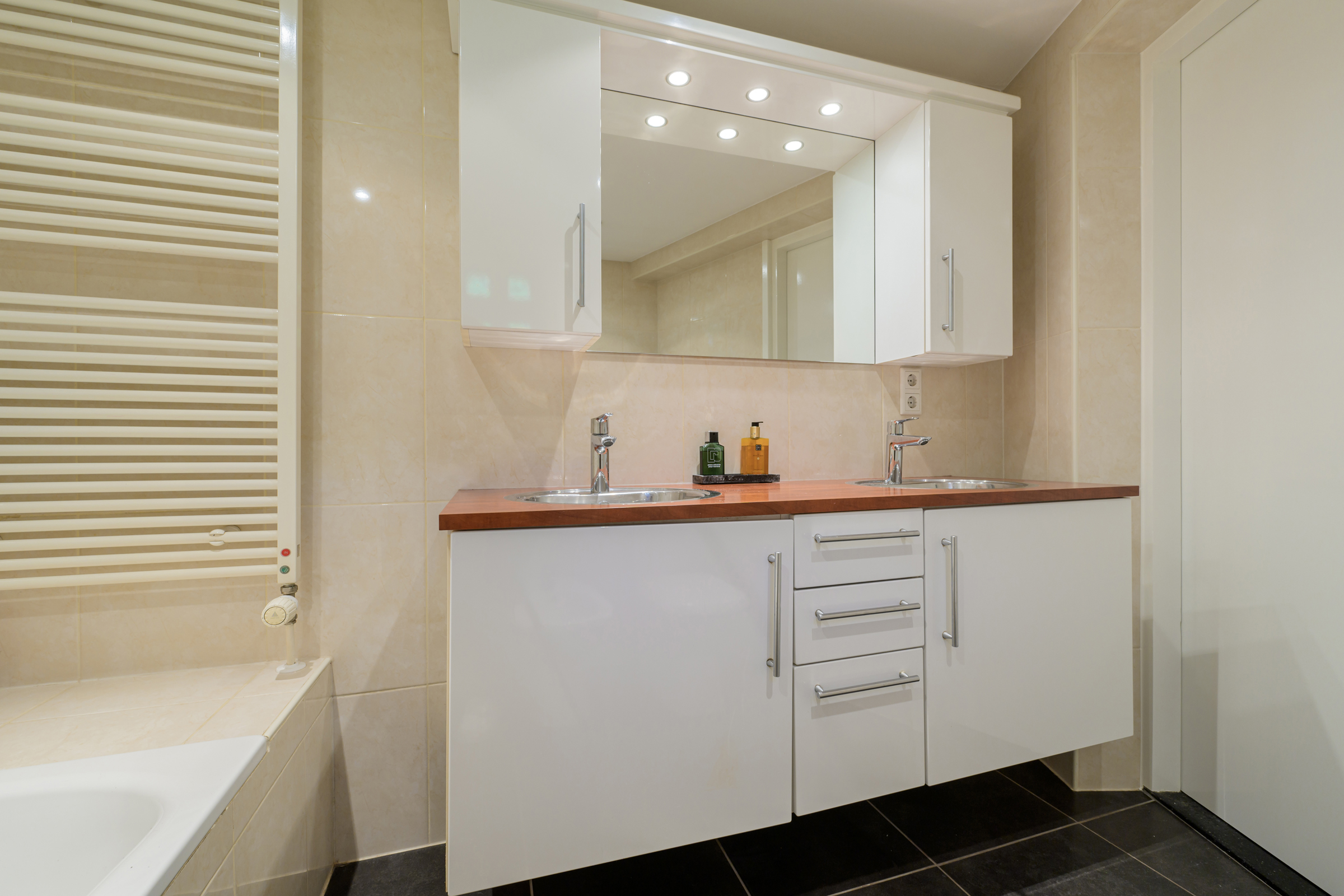 Badkamer met douche, wastafelmeubel en handdoekradiator.
