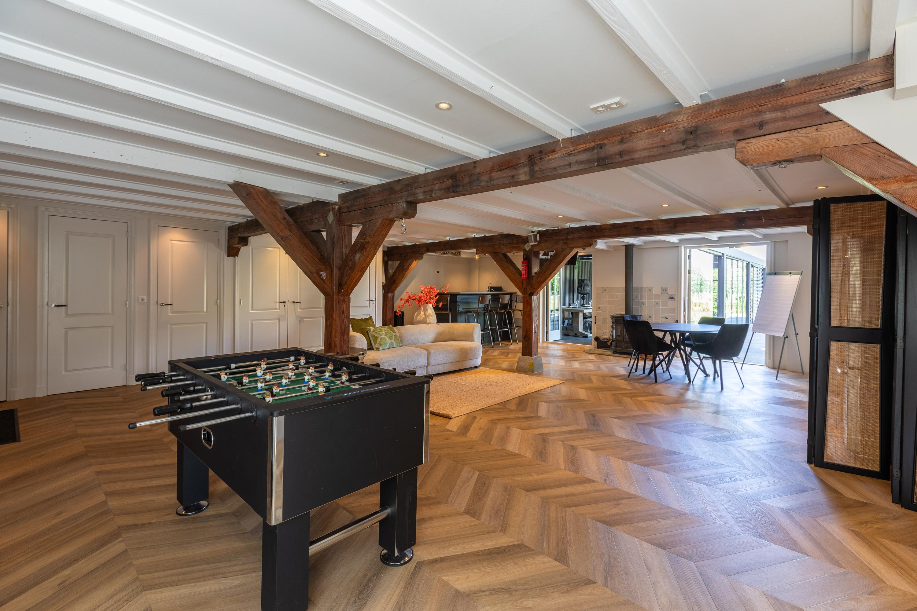 Daarnaast beschikt de begane grond over een tweede moderne keuken bij het terras en een multifunctionele ruimte van ca. 85 m² in de voormalige stal, voorzien van een bar, pantry, toilet en toegang tot de garages en bergruimte. Aan de andere zijde van deze ruimte betreedt u de royale aanbouw met wellness, compleet ingericht met jacuzzi, Finse sauna, infraroodsauna en voldoende plek voor een grote eettafel of een lounge set– een heerlijke plek om te ontspannen en samen te genieten.