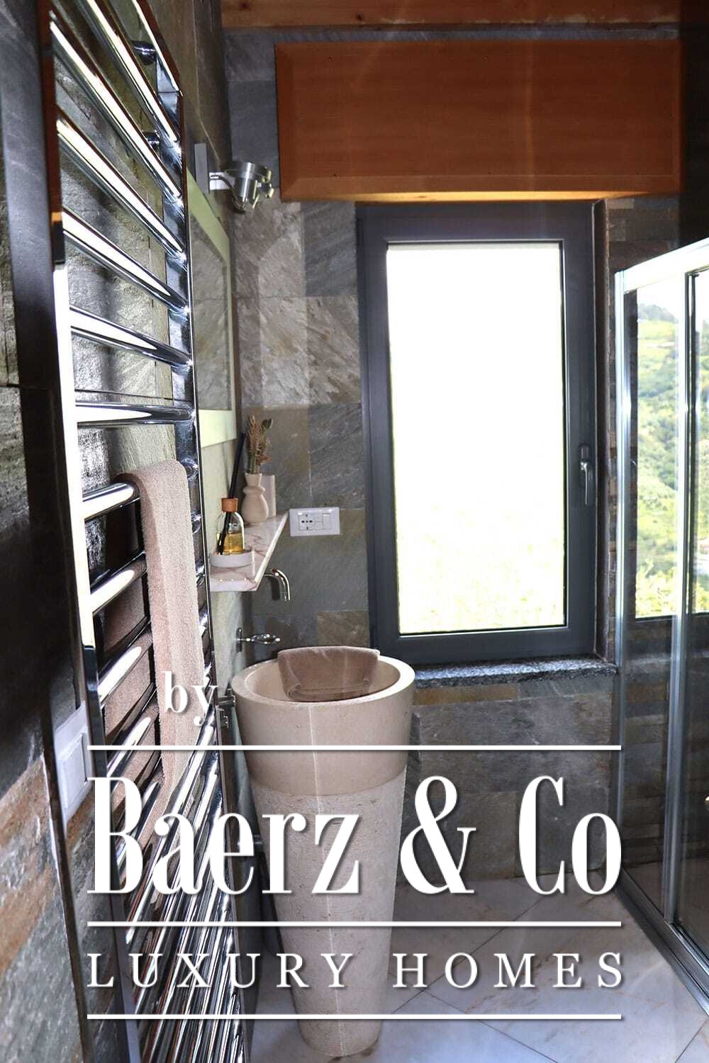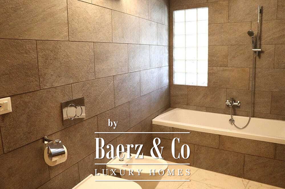 Het huis beslaat twee verdiepingen en beschikt over vier slaapkamers en vier badkamers. Drie slaapkamers op de begane grond openen via openslaande deuren naar een lager gelegen terras met uitzicht op de bergen. De master suite heeft een ruime badkamer met losstaand bad, aparte douche, dubbele marmeren wastafels en designafwerking, wat zorgt voor een sfeer van rust en privacy. De studeerkamer met eigen ingang biedt flexibele mogelijkheden voor gasten of werk. Boven grenst een woonkamer met balkenplafond en open haard aan een keuken van walnoothout en roestvrij staal, uitgerust met hoogwaardige Miele-apparatuur. Hoge glazen deuren leiden naar een lounge met tweede open haard en toegang tot terrassen met granieten tafels en Philippe Starck-stoelen.