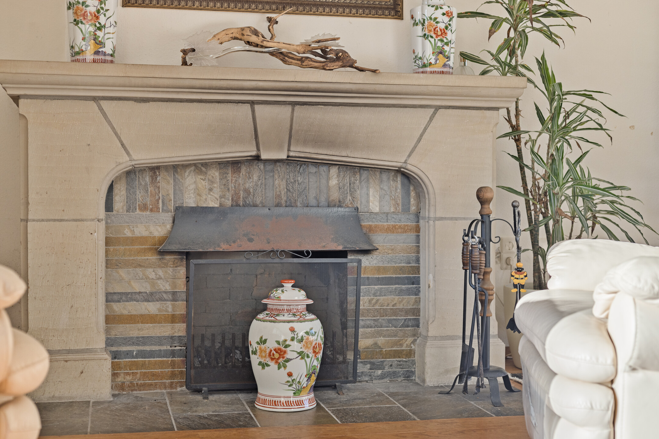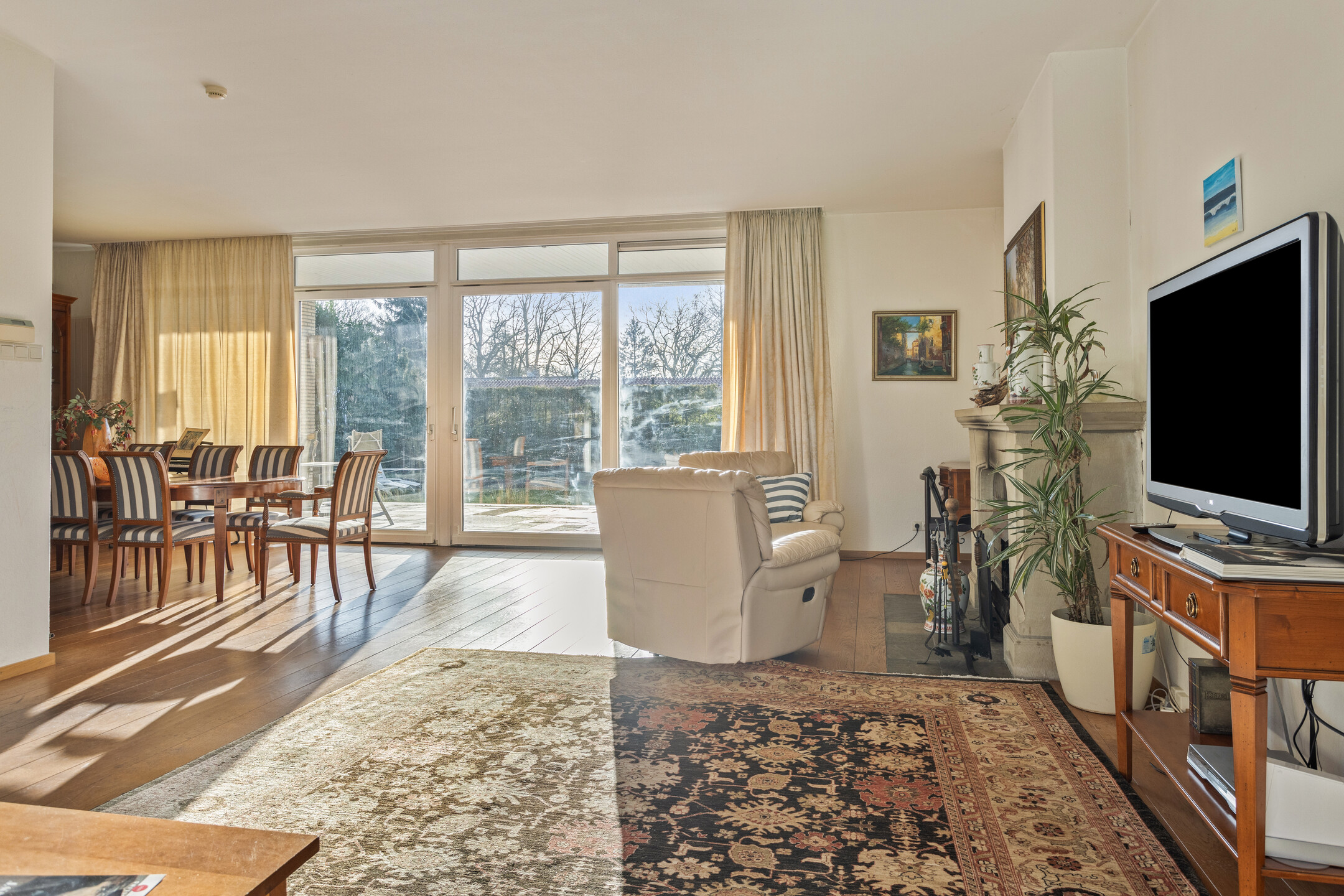 - Een lichte, royale woonkamer met panoramisch uitzicht op de tuin, open haard van Bentheimer zandsteen en directe toegang tot het overdekte terras.