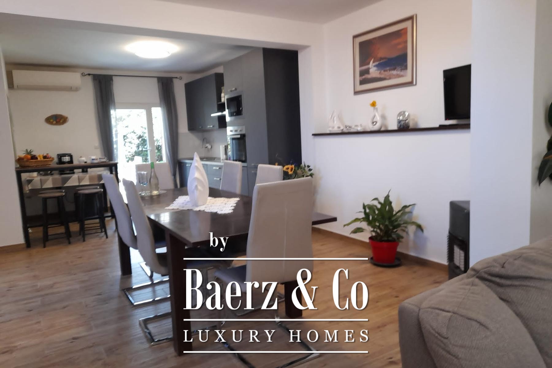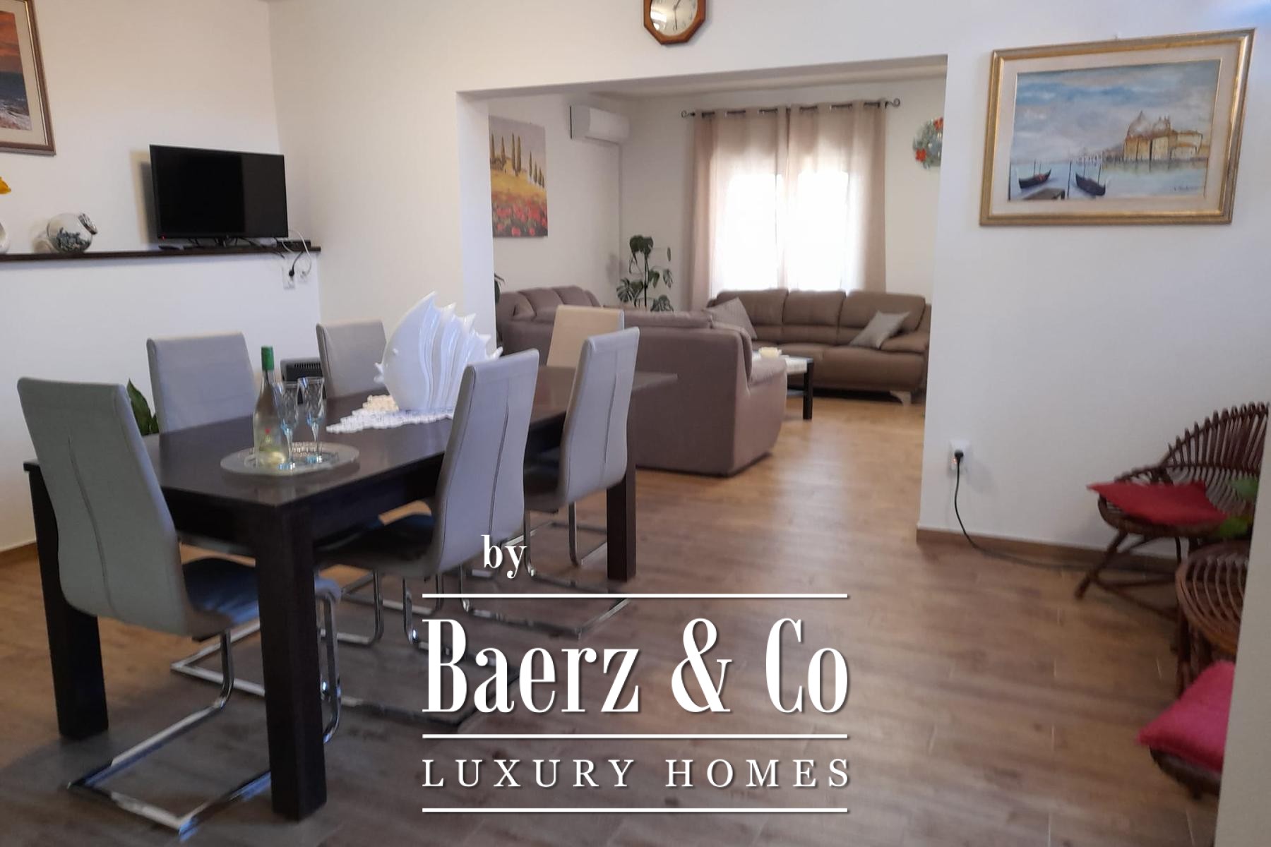 Het huis is verdeeld over twee woonlagen. Op de begane grond gaan licht en ruimte samen in een royale living, een volledig uitgeruste keuken en een badkamer, allen georiënteerd op het terras en het 48 m² zwembad. Een subtiel geïntegreerde garage vloeit moeiteloos mee in het geheel. De tuin met zwembad en buitenhaard omlijst het geheel met bescheiden Kroatische allure.