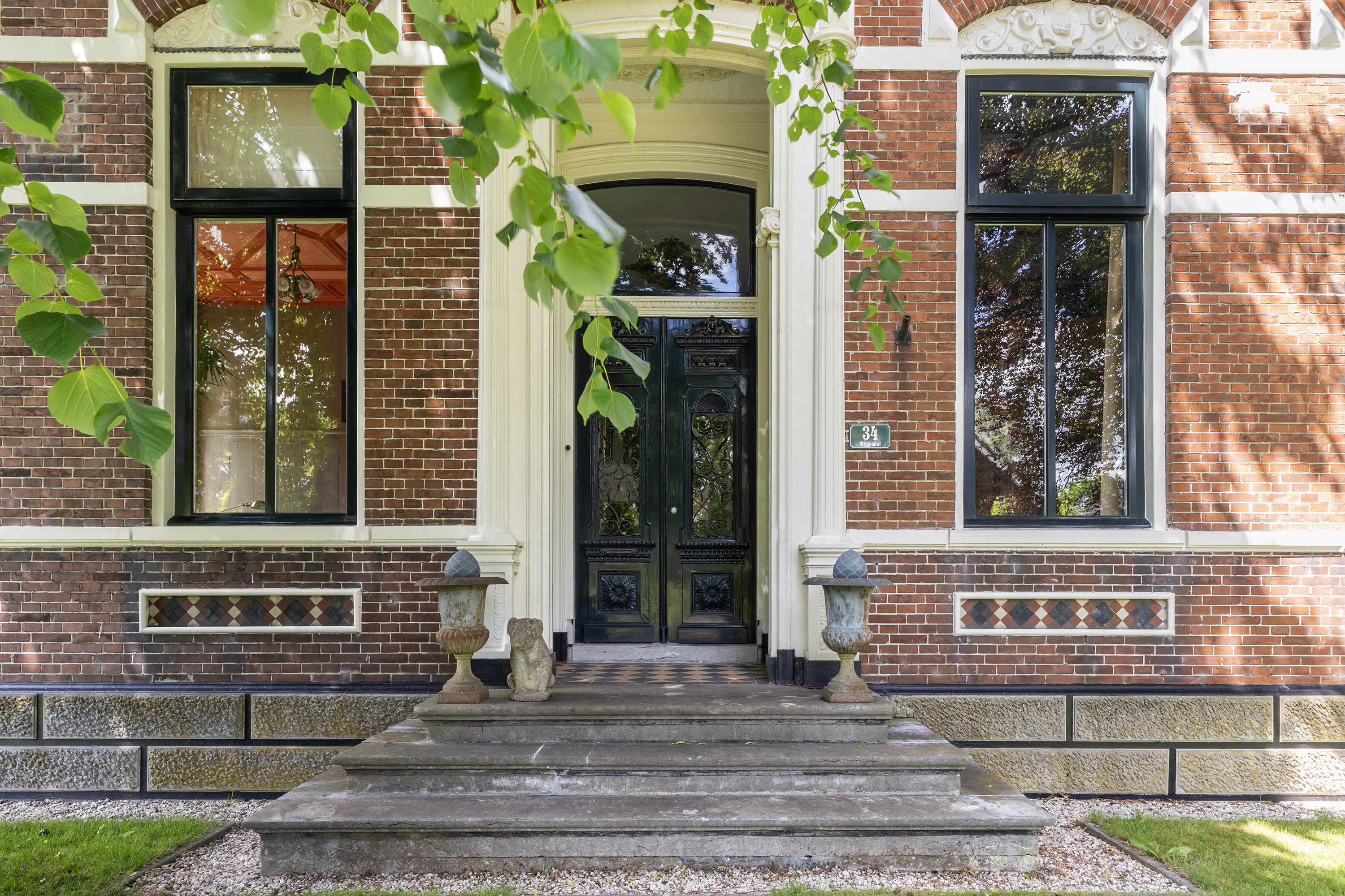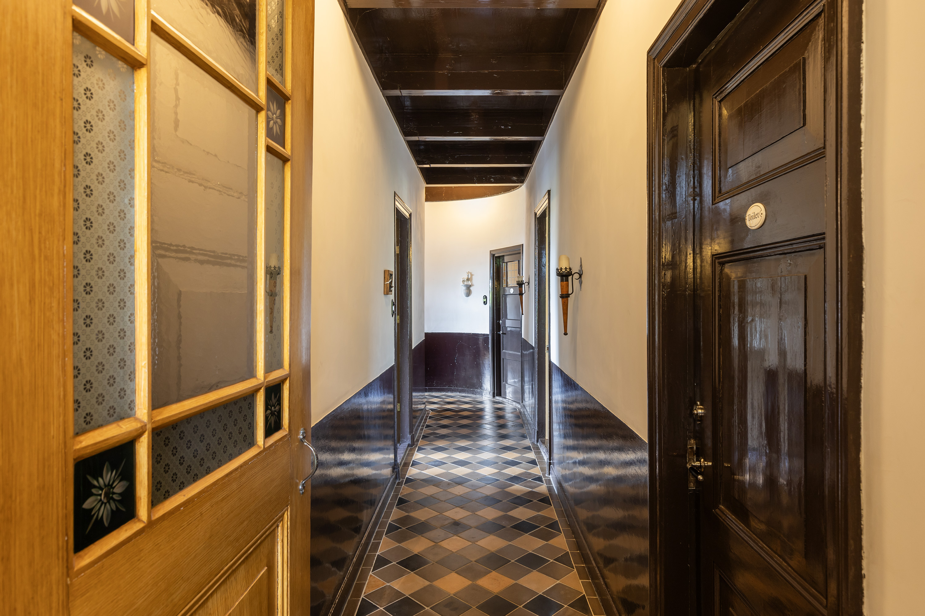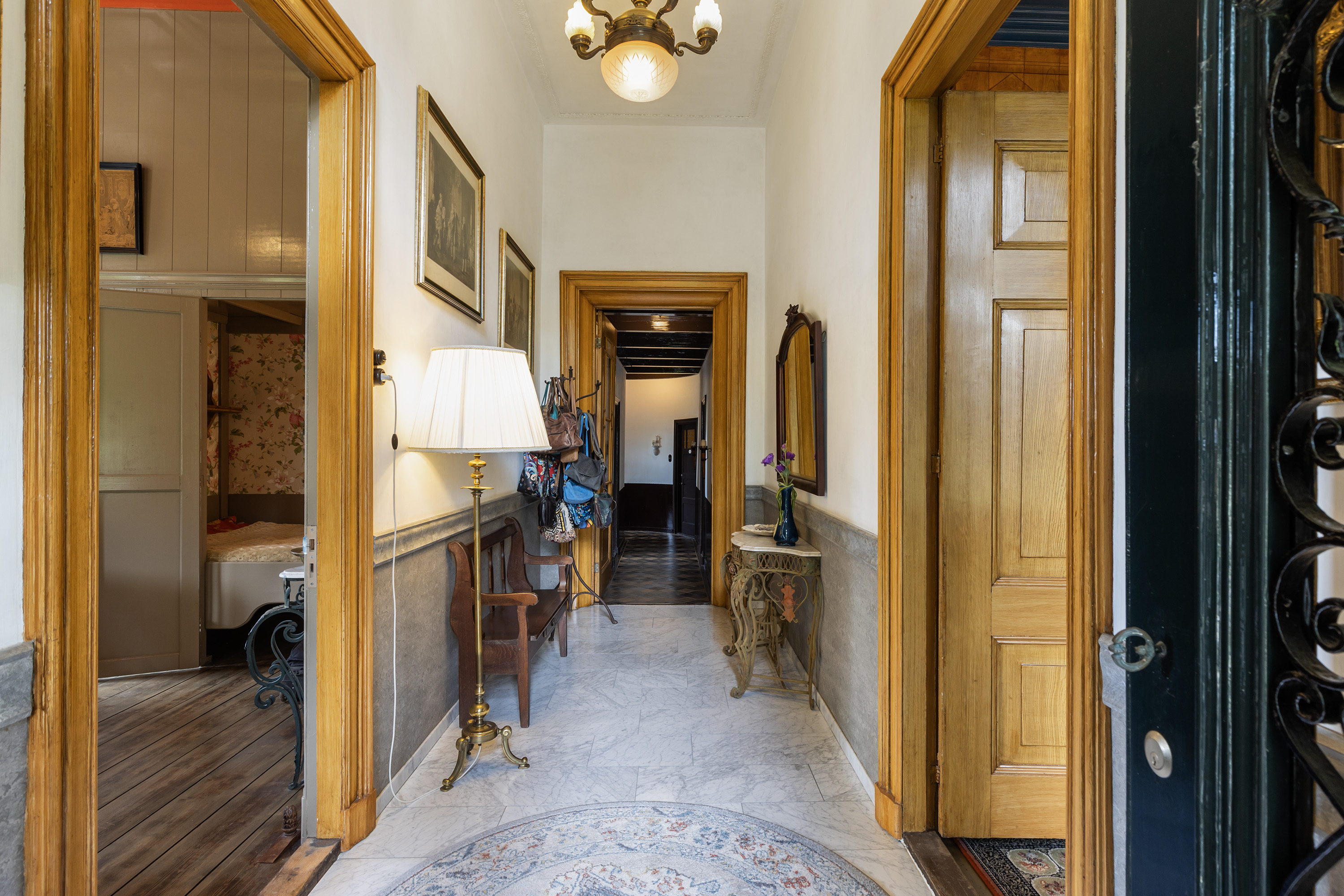 De imposante voordeur met smeedijzeren details geeft toegang tot een stijlvolle ontvangsthal met marmeren vloer, lambriseringen en hoge plafonds met subtiel stucwerk. Deze statige gang vormt de centrale as van de woning met toegang tot de voor- en achterkamers, de woonkeuken, bijkeuken, toilet, badkamer, kelder en de opslagkamer. Verder geeft de zijdeur toegang tot de schuur en de voormalige stal.