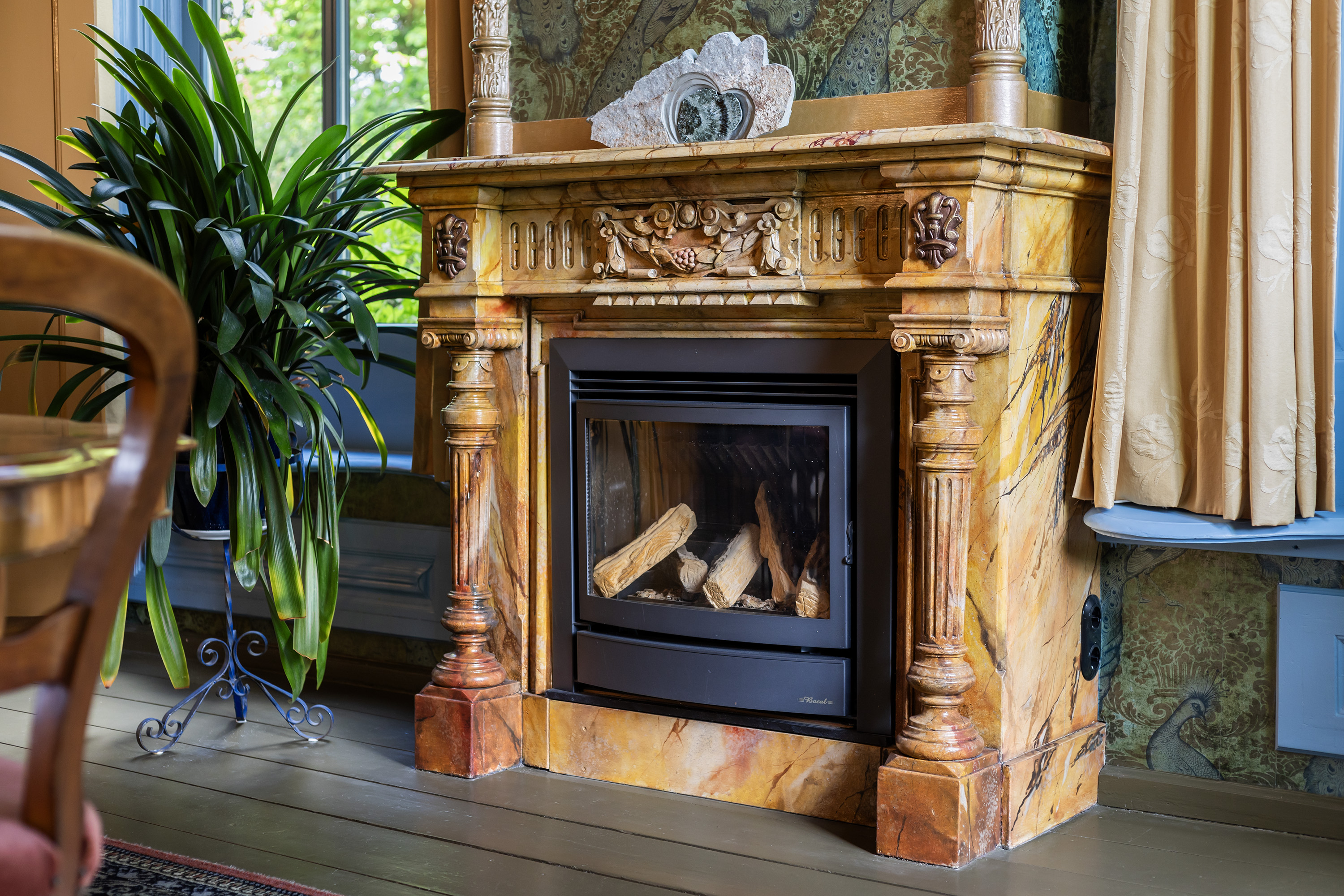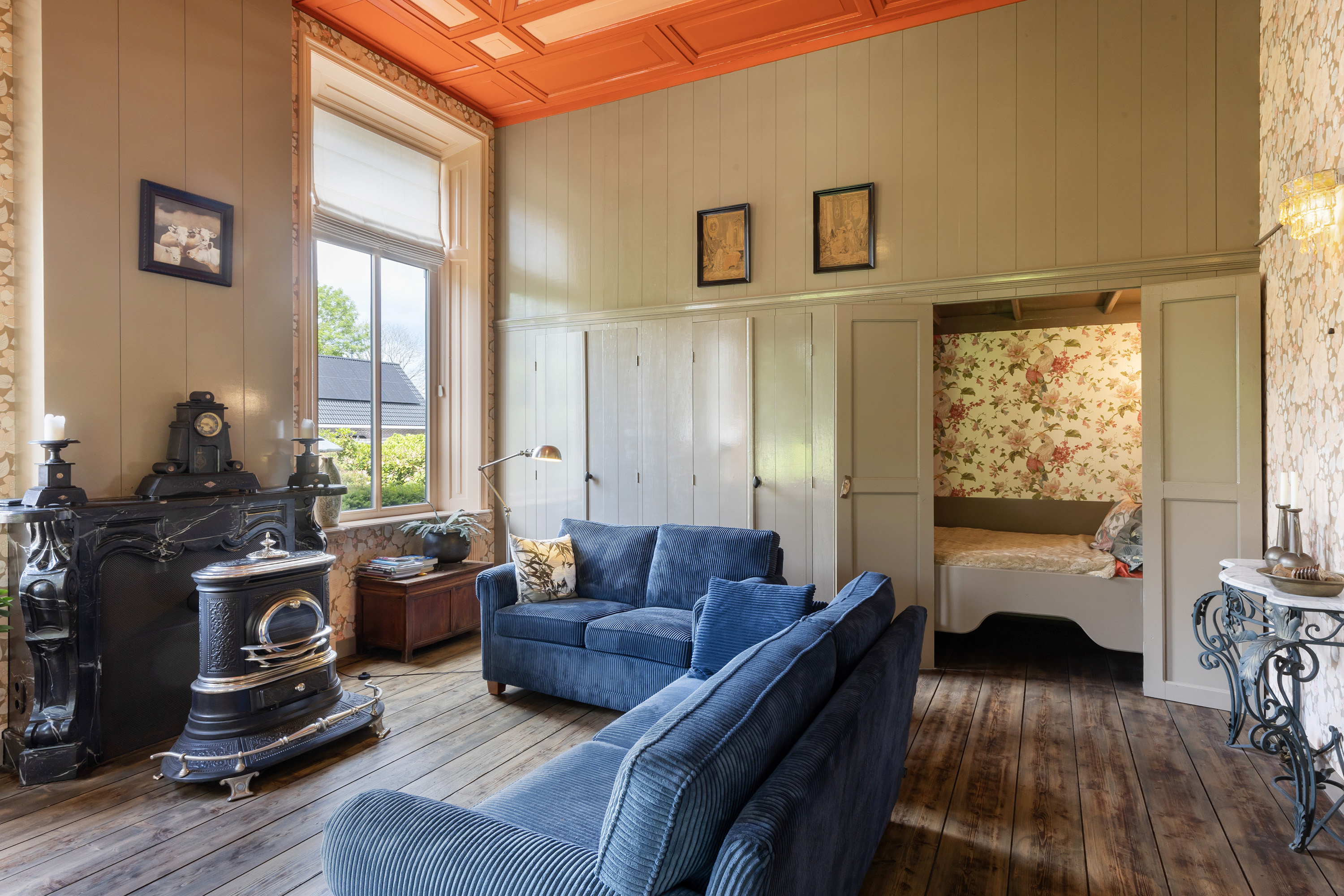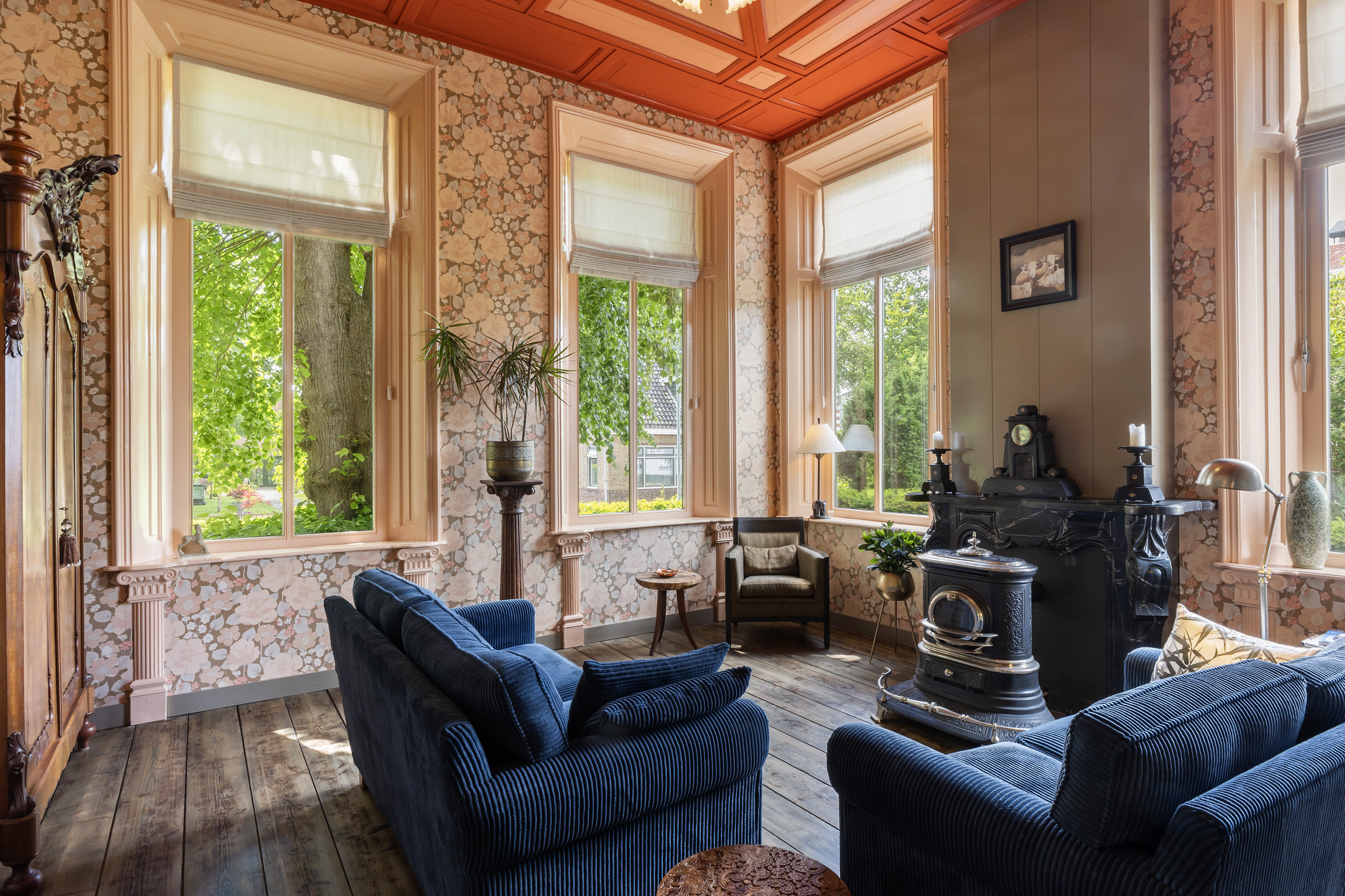 Aan de voorzijde bevindt zich een sfeervolle woonkamer die grandeur uitstraalt dankzij de plafondhoogte, kamerhoge ramen met roedeverdeling, diepe vensterbanken, originele houten vloeren en een historische schouw met antieke kachel. Klassiek behang, rijke details en het zicht op monumentale bomen in de voortuin versterken de warme uitstraling. Deze kamer, evenals de naastgelegen eetkamer, is voorzien van een gaskachel en is via de kelder geïsoleerd.