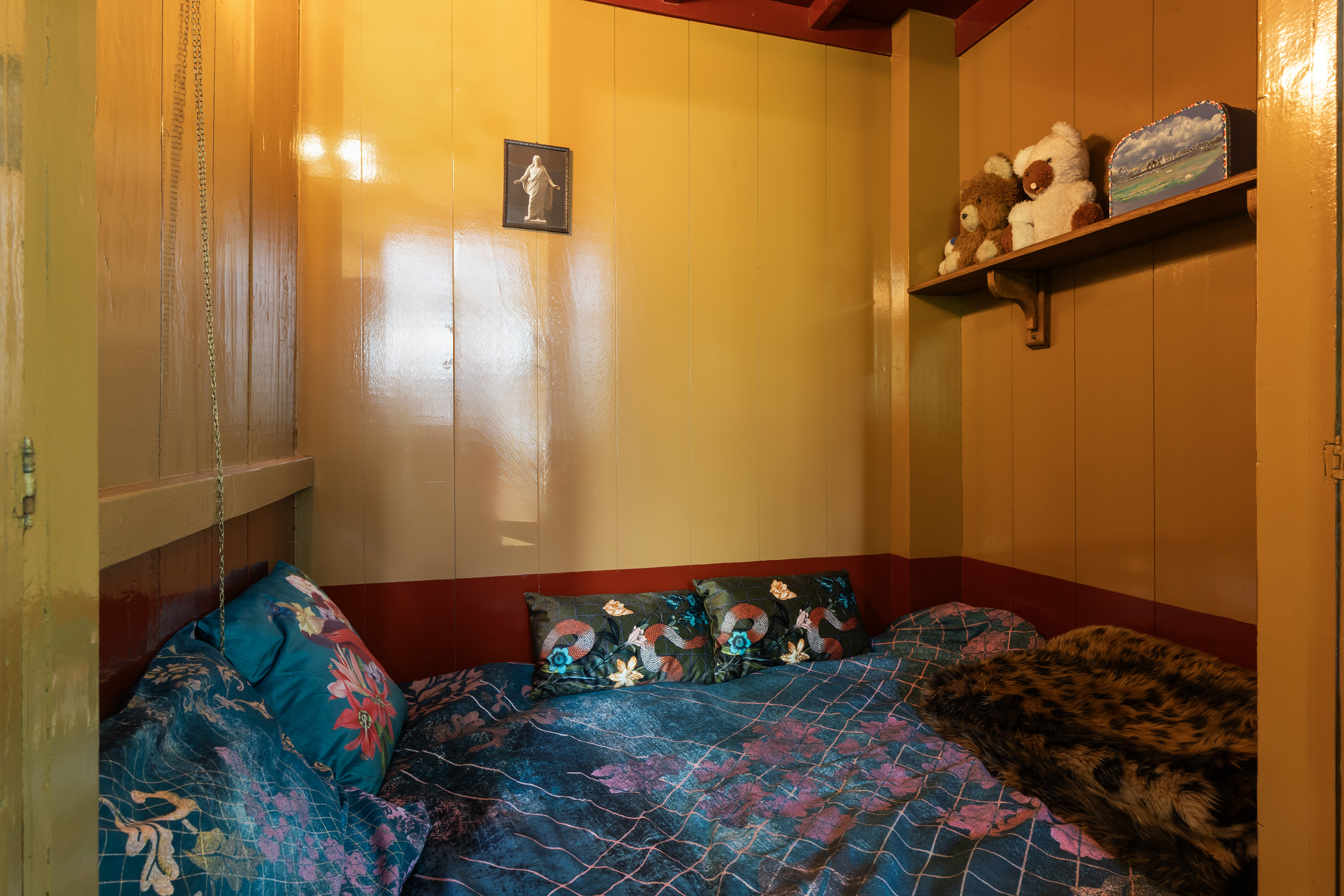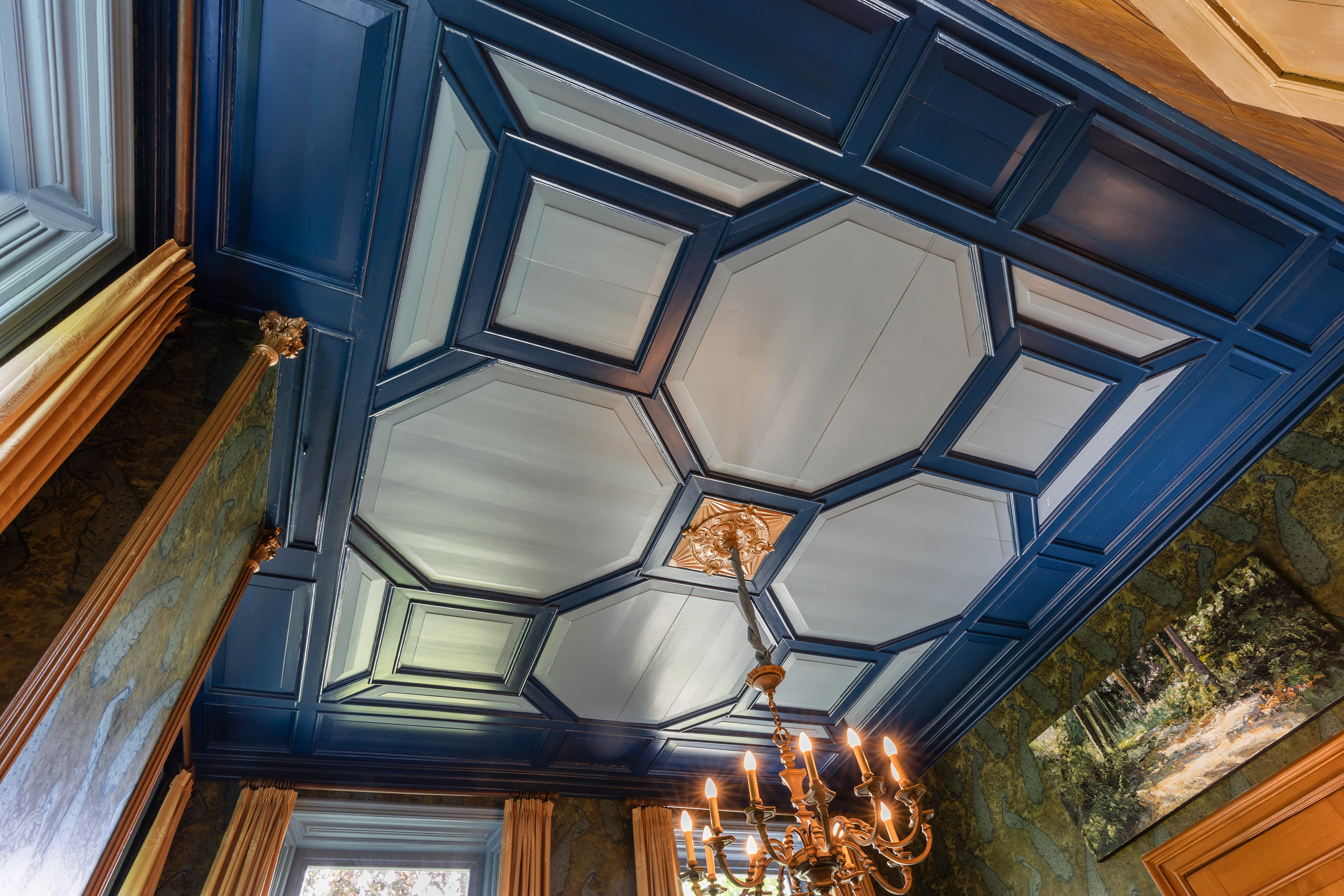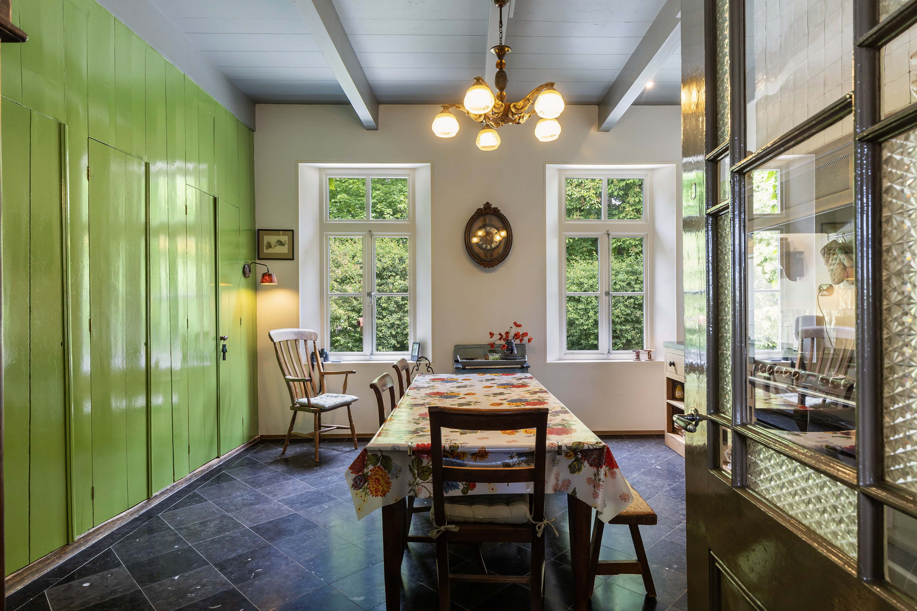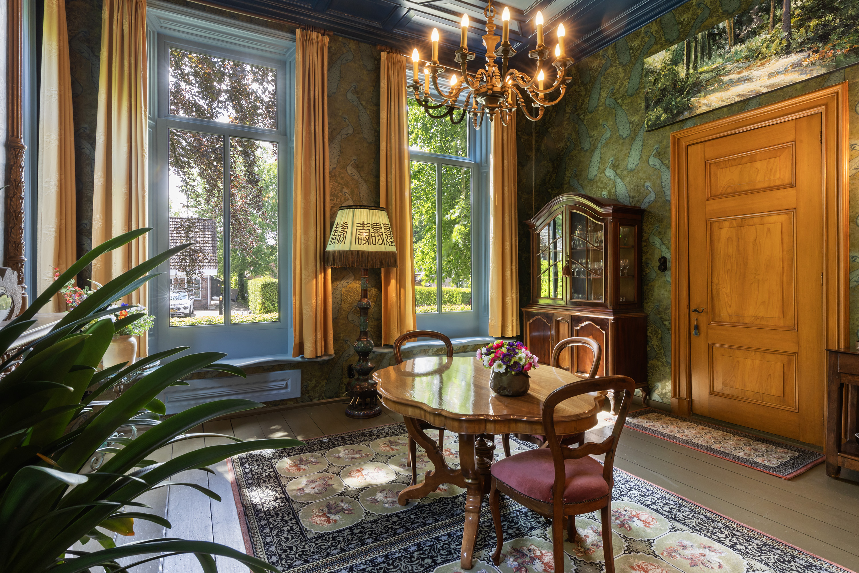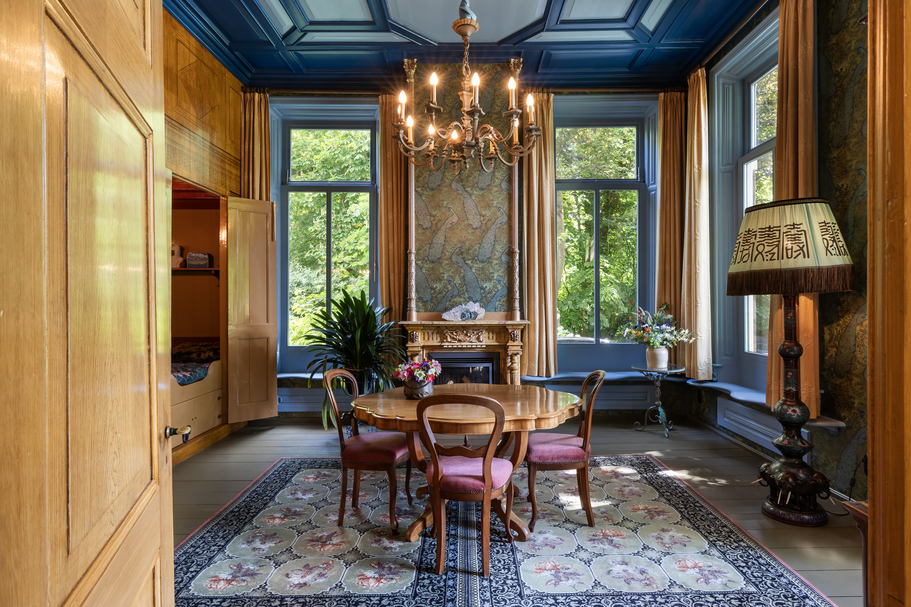De eetkamer is een indrukwekkende ruimte met diepe ramen aan twee zijden, een monumentale schouw met stijlvol behang en een in blauwtinten geverfe plafond met sierlijsten. In de trompe-l'oeil wand zijn een bedstede en 3 kasten fraai geïntegreerd. Deze ruimte is ideaal als formele eetkamer of bibliotheek.