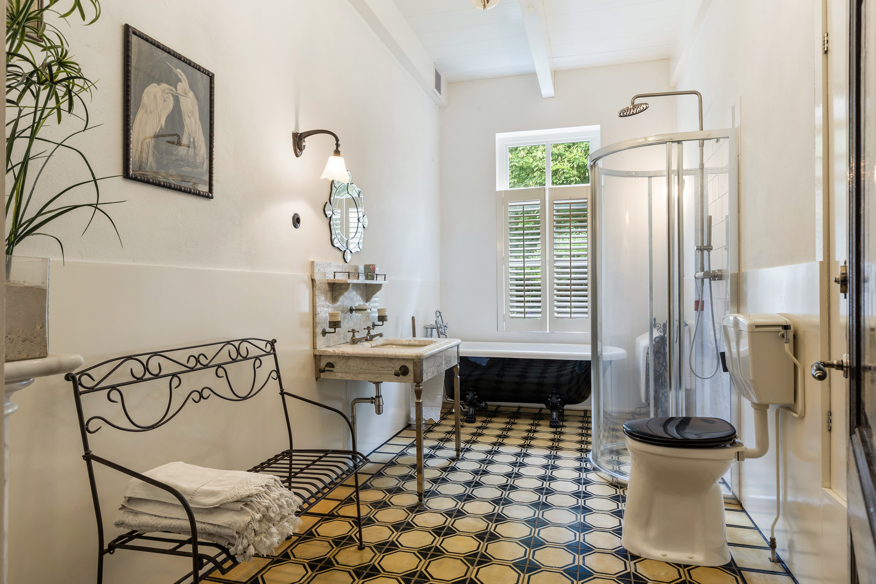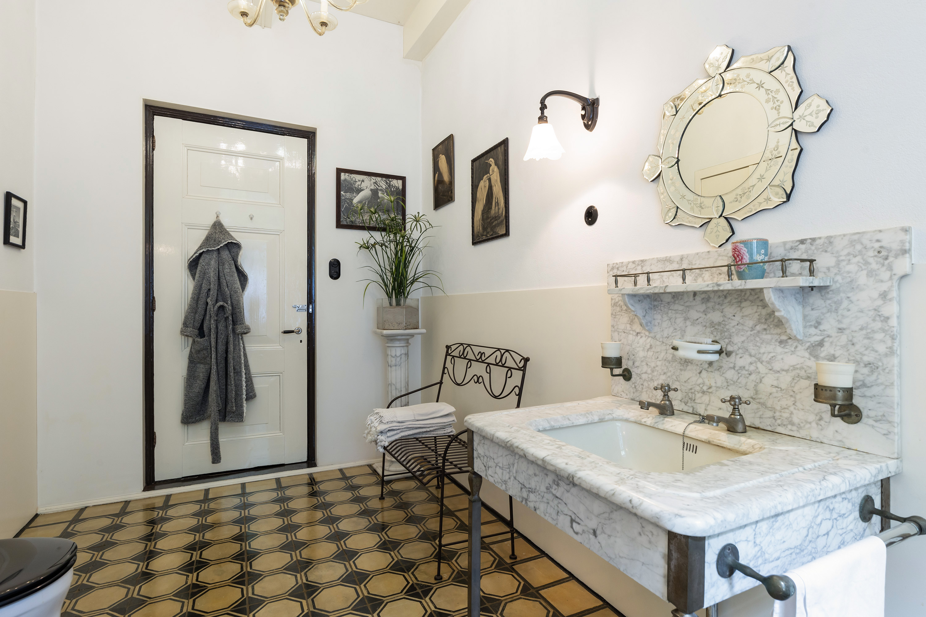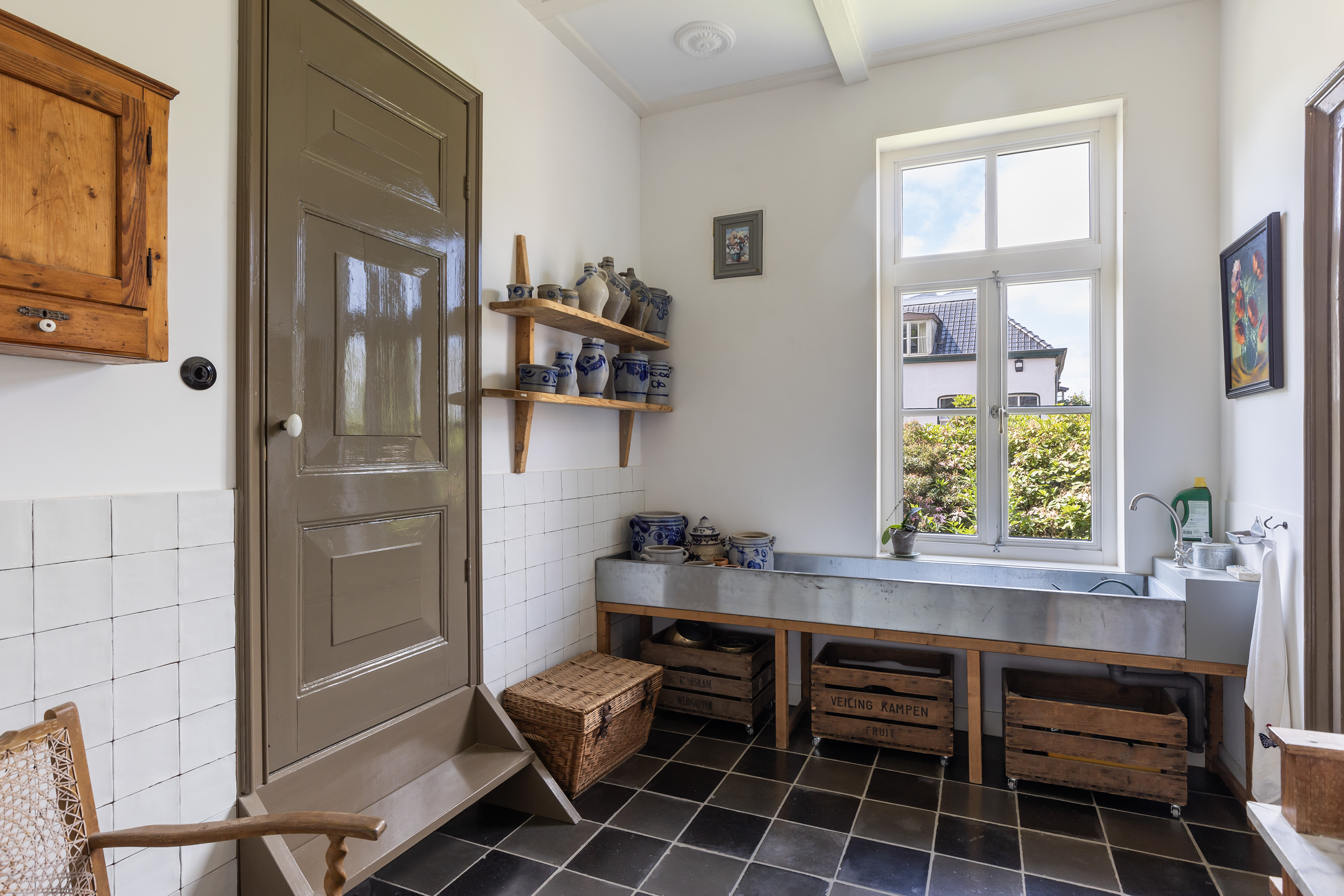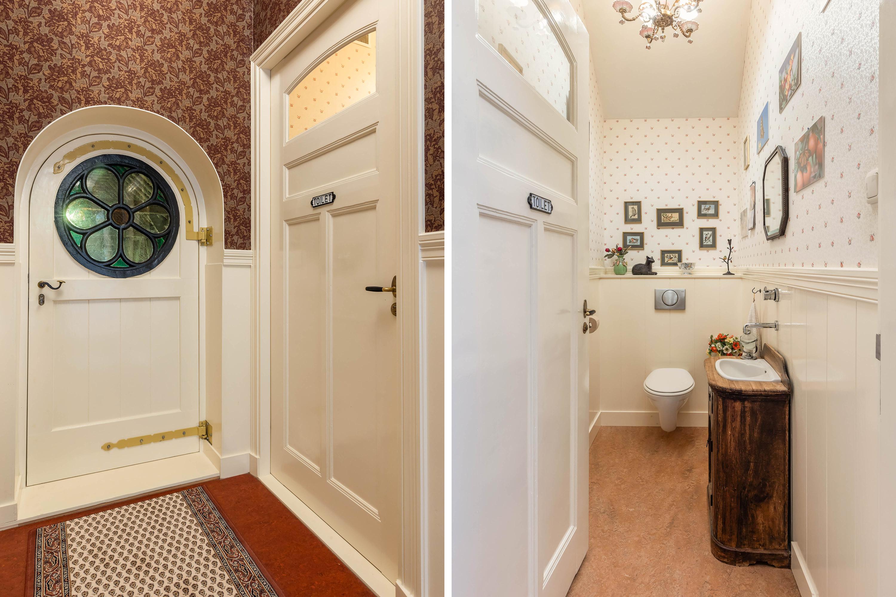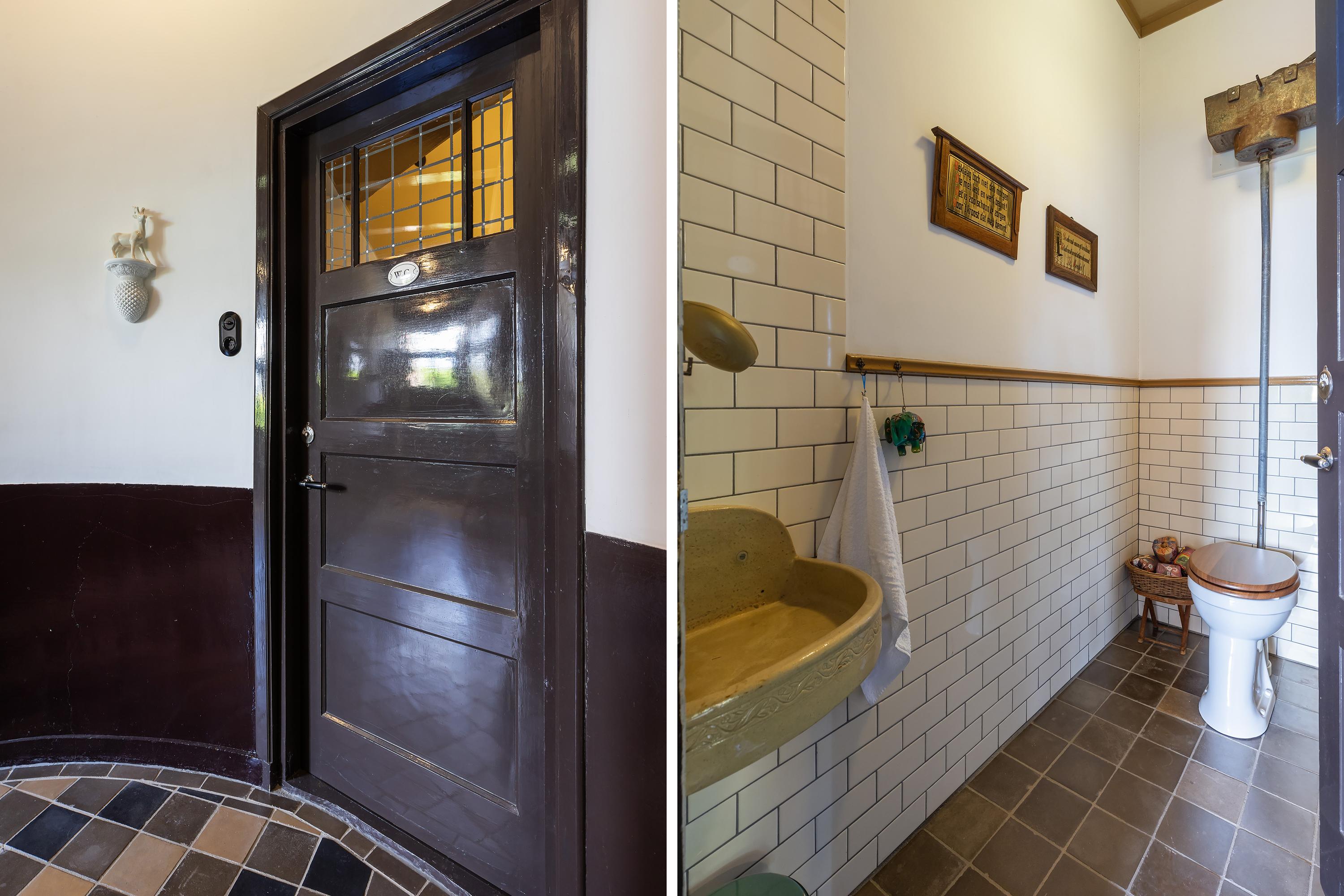 De badkamer op de begane grond is ingericht met toilet, wastafel, badkuip en een douchecabine. Via de keuken is de praktische bijkeuken bereikbaar, voorzien van originele tegelvloer, een pomp, wastrog en dubbele spoelbak, evenals de aansluitingen voor wasapparatuur en volop bergruimte.