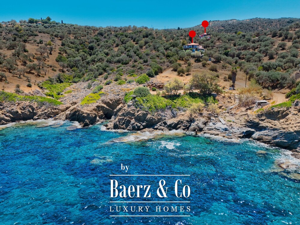 In an exceptionally beautiful and tranquil location, just 90 meters from the sea and a beach of wild, authentic beauty, a unified seaside plot of 12,997 sq.m. is available for sale, hosting two independent residences with a total surface of approximately 470 sq.m.