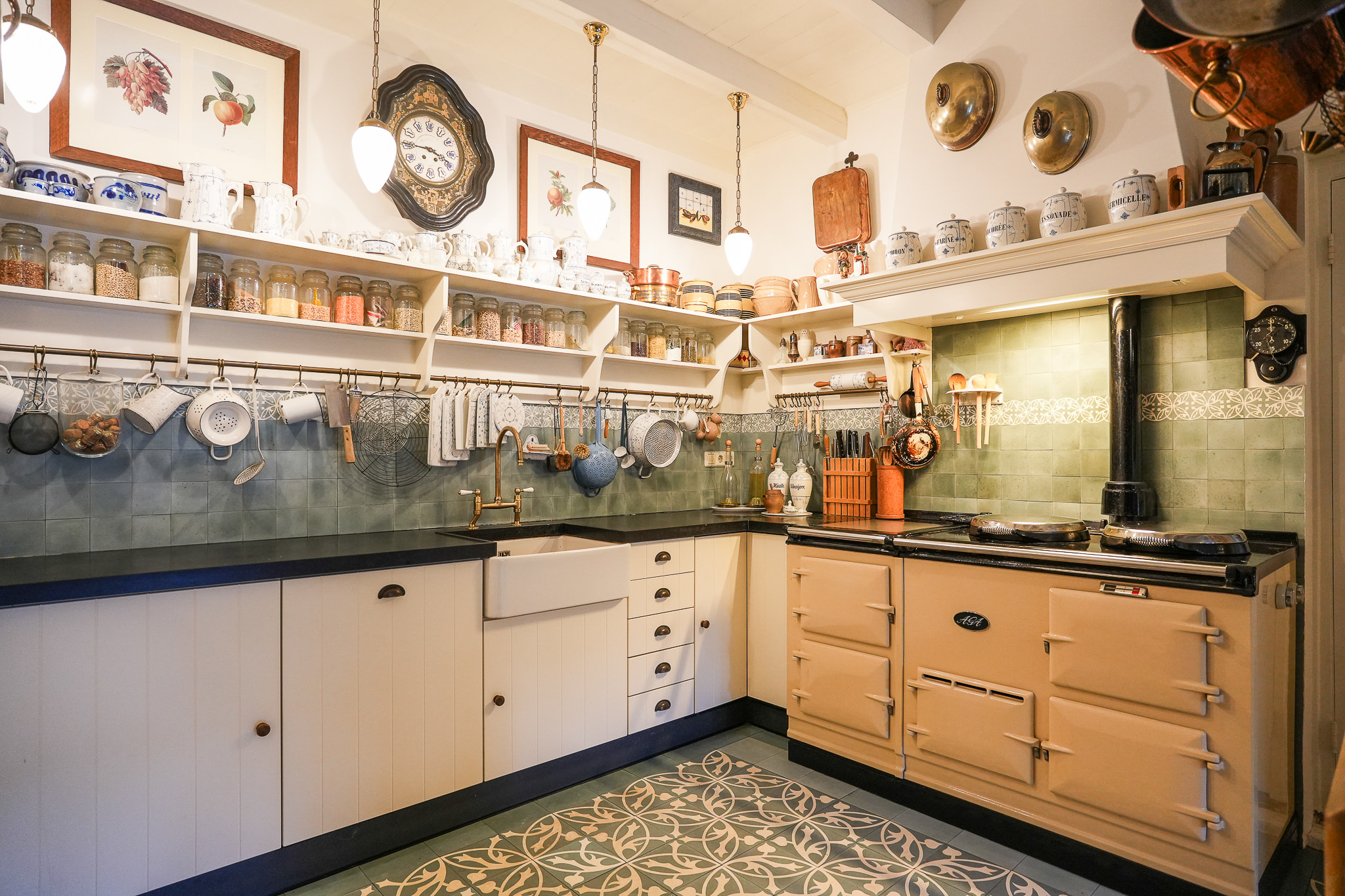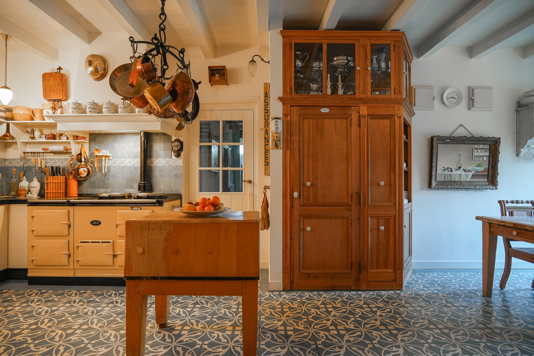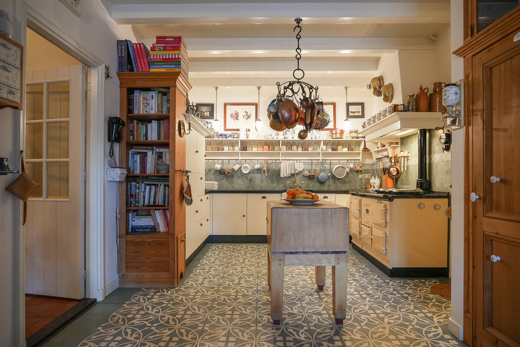 De woonkeuken vormt het hart van het huis en biedt via dubbele deuren toegang tot de zijtuin. De 4-oven Aga-cooker (voorzien van een klokthermostaat en daardoor energiezuinig), het natuurstenen werkblad met porseleinen spoelbak, messing kraan en Portugese vloertegels zorgen voor een klassieke sfeer.